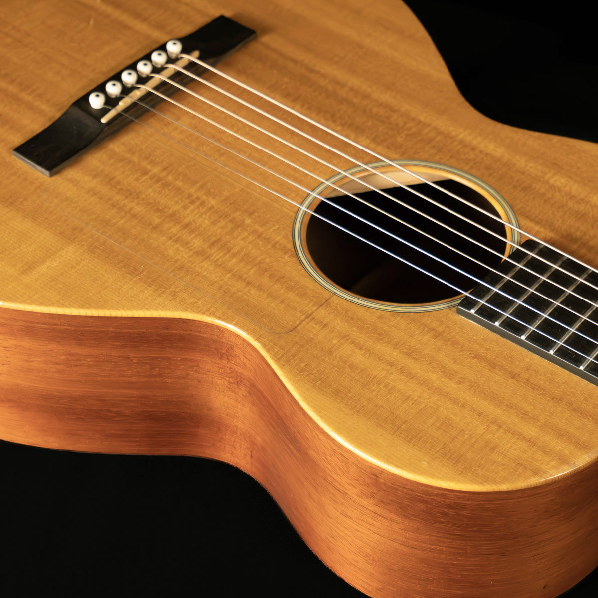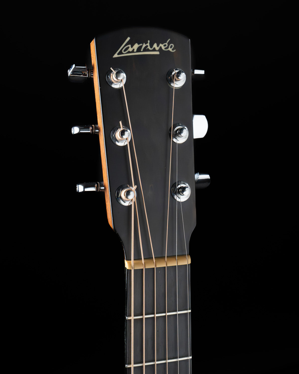 The nut width is 1 3/4" and the string spacing at the Tusq saddle is 2 1/8".  Short 24" scale length.  The neck is a modern D profile, measuring just .777" at the first fret and .936" at the ninth fret.  The ebony fingerboard has no fret markers.  The tuners are Larrivée branded Schallers.