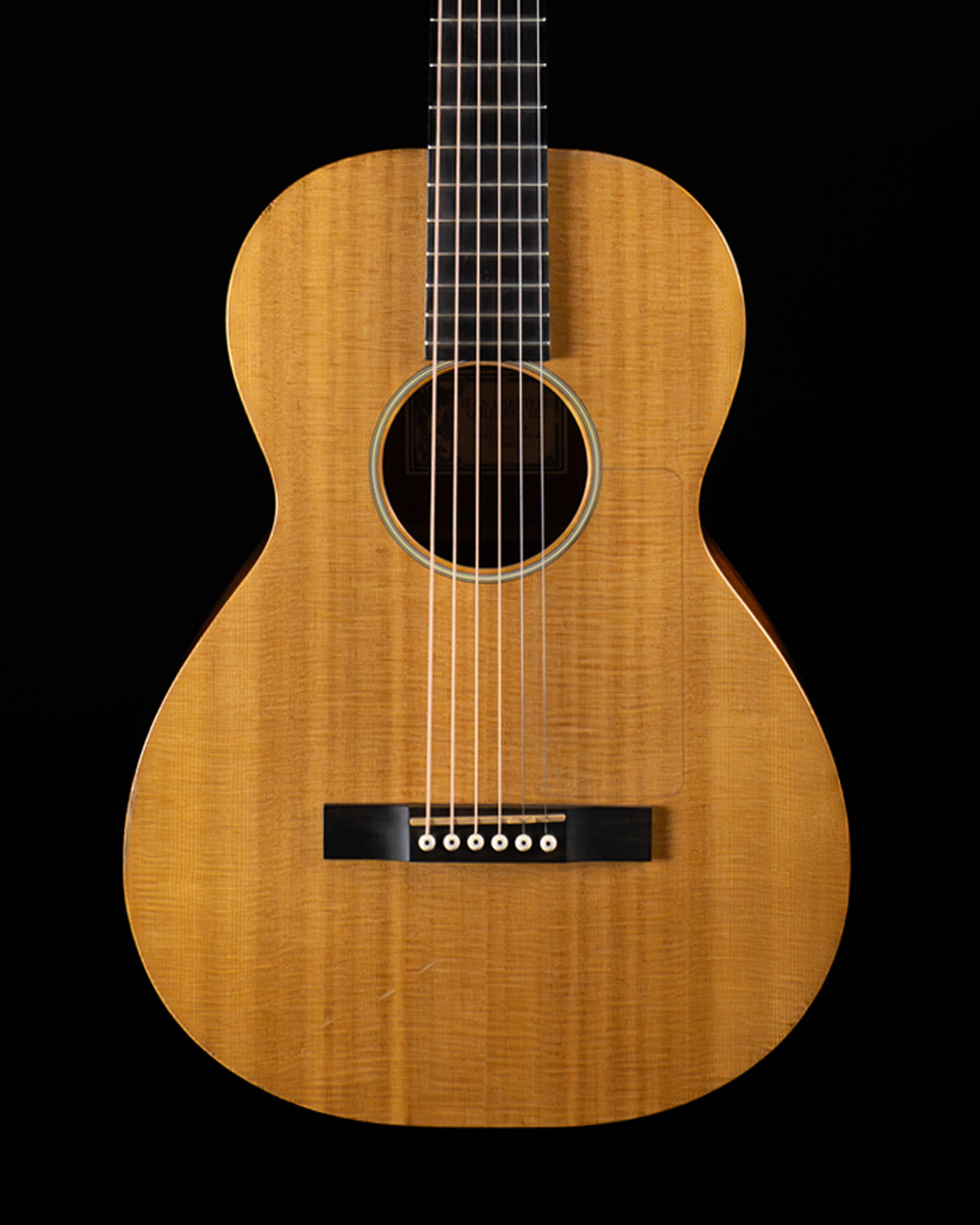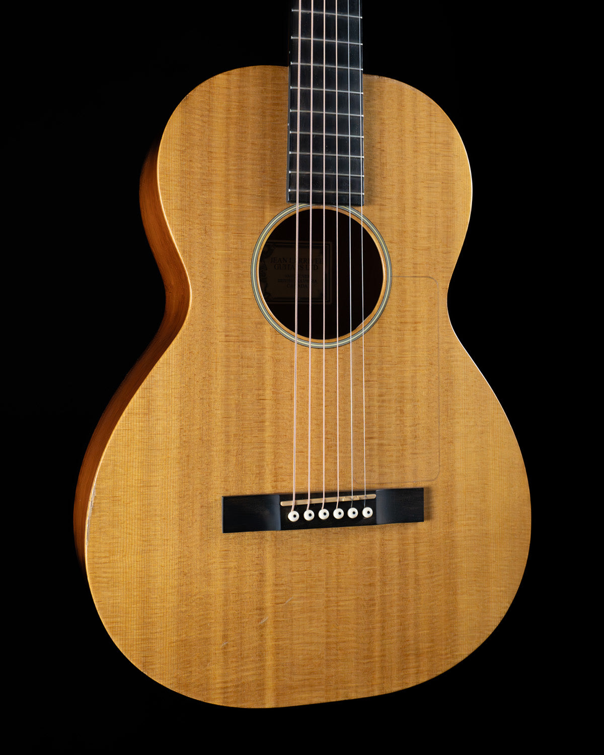 (USED) It's hard to argue with the reputation of Larrivée Guitars, and even this very basic parlor guitar shows the thoughtfulness that they're known for in terms of construction, materials selection and sound.  This Canada-made instrument has a Sitka spruce top and mahogany back/sides/neck.  The presentation is very stripped down, with no body binding at all a simple single-ring rosette and a clear pick guard.