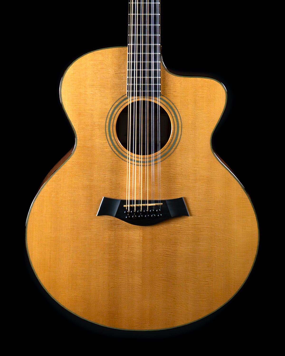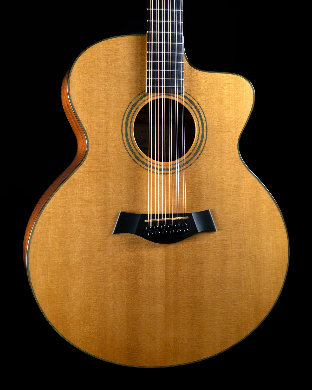 (USED) It was only natural that fingerpicking god Leo Kottke would team up with Taylor on a signature model 12-string, we think that 12s are one of the most satisfying categories that they make, and Leo wanted something dependable that he could travel with and replace at a moment's notice if necessary. These are built on a jumbo platform, with 17" lower bout width and 4 1/2" body depth at the tail block. Sitka spruce top, mahogany back/sides/neck. Soft cutaway for access to the upper frets. The appointments are simple and elegant, with rosewood binding on the body and fingerboard and green accents in the purfling, front and back.