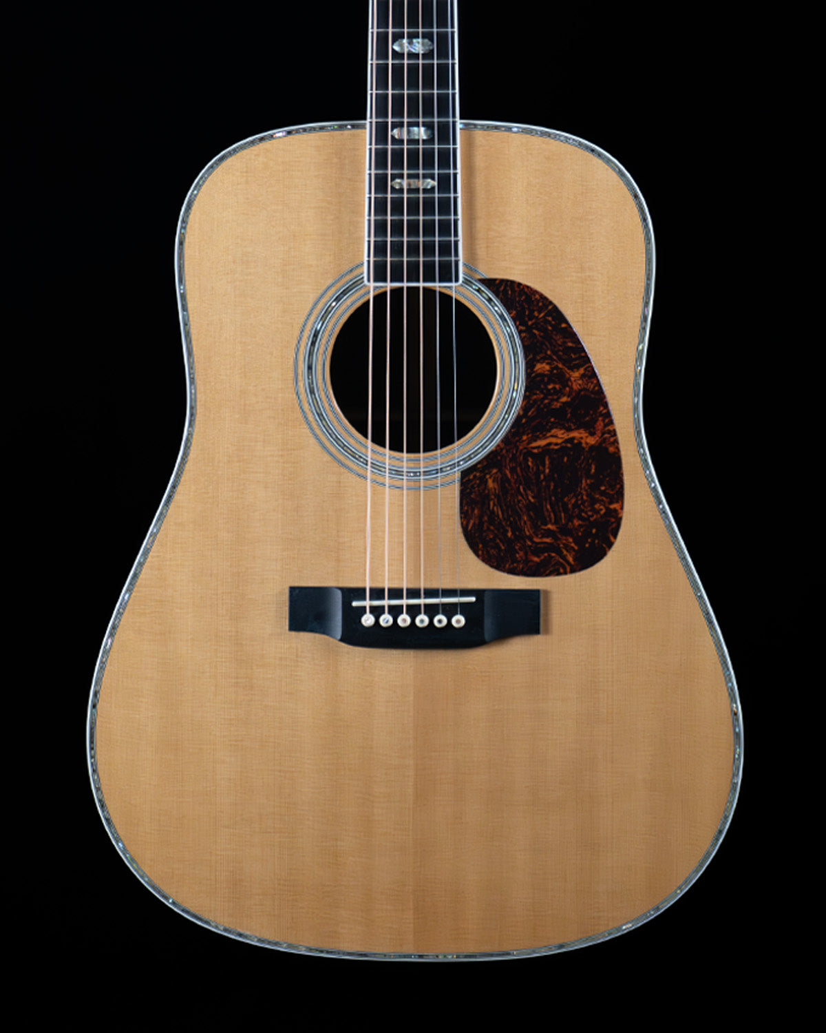 For appointments, it has abalone top border, rosette and large block inlays on the ebony fingerboard. Vertical CF Martin logo in pearl, body/neck/peghead bound in white plastic, gold closed-gear tuners, Martin branded. Action conforms to current factory spec and there is room to both lower the saddle and reduce relief, if it pleases you. One very faint lacquer check off the pick guard, a few pick swirls on the guard and the satin neck has shined up just a bit, but she's a lovely specimen. Includes molded hard case.