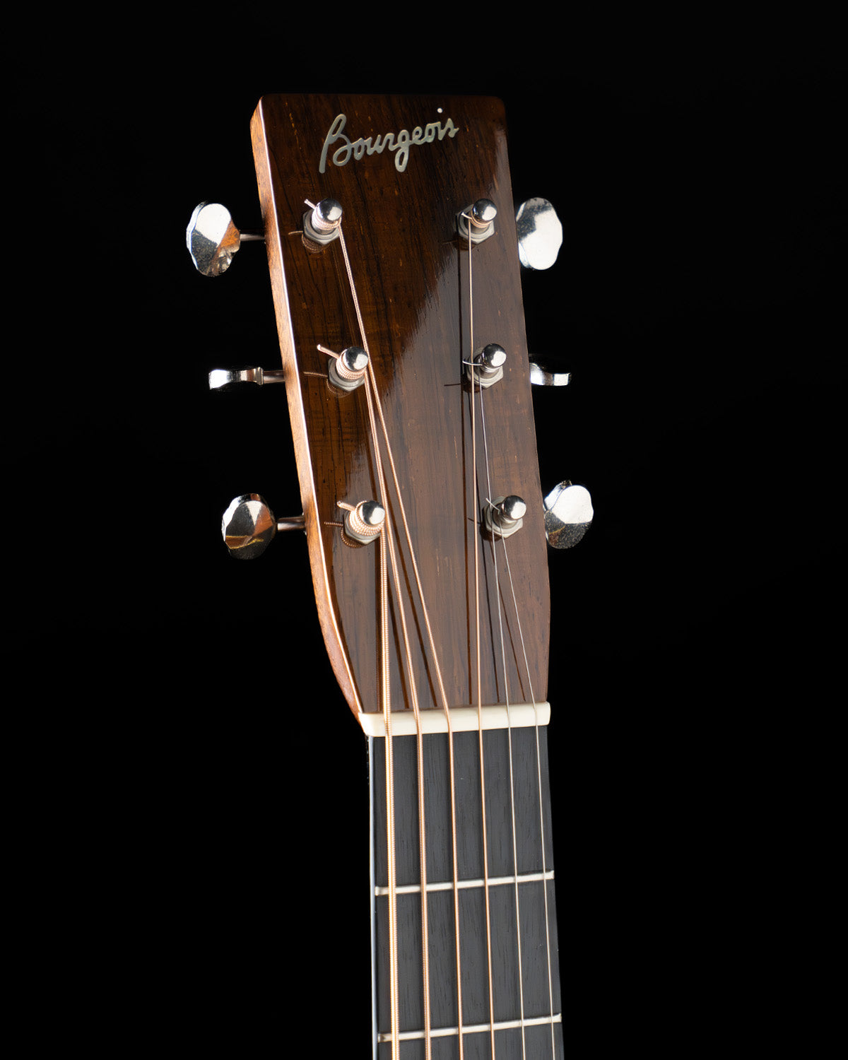 Adirondack spruce top and braces, figured Madagascar rosewood back and sides. Full 25 1/2" scale with modified V neck profile, 1 23/32" nut width, 2.2" string spacing at the saddle. The neck depth measures .834" at the first fret, .921" at the ninth... back in the days when all Bourgeois necks were shaped by hand.