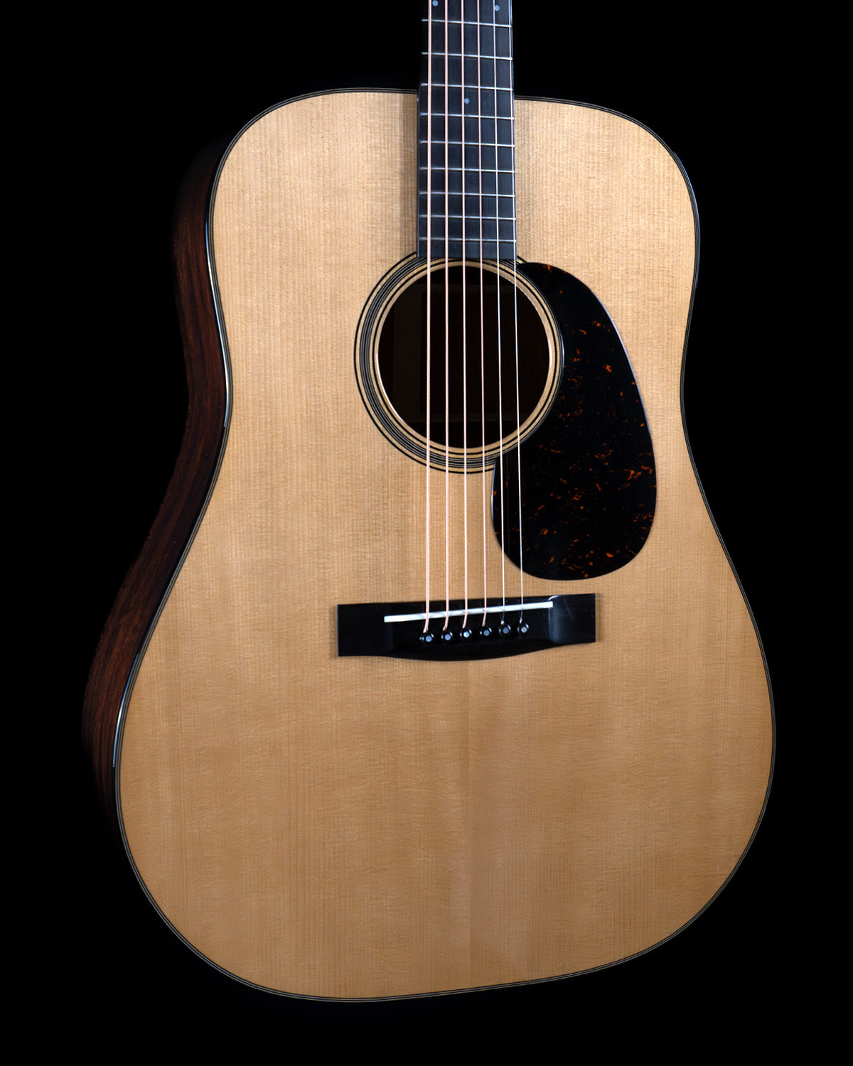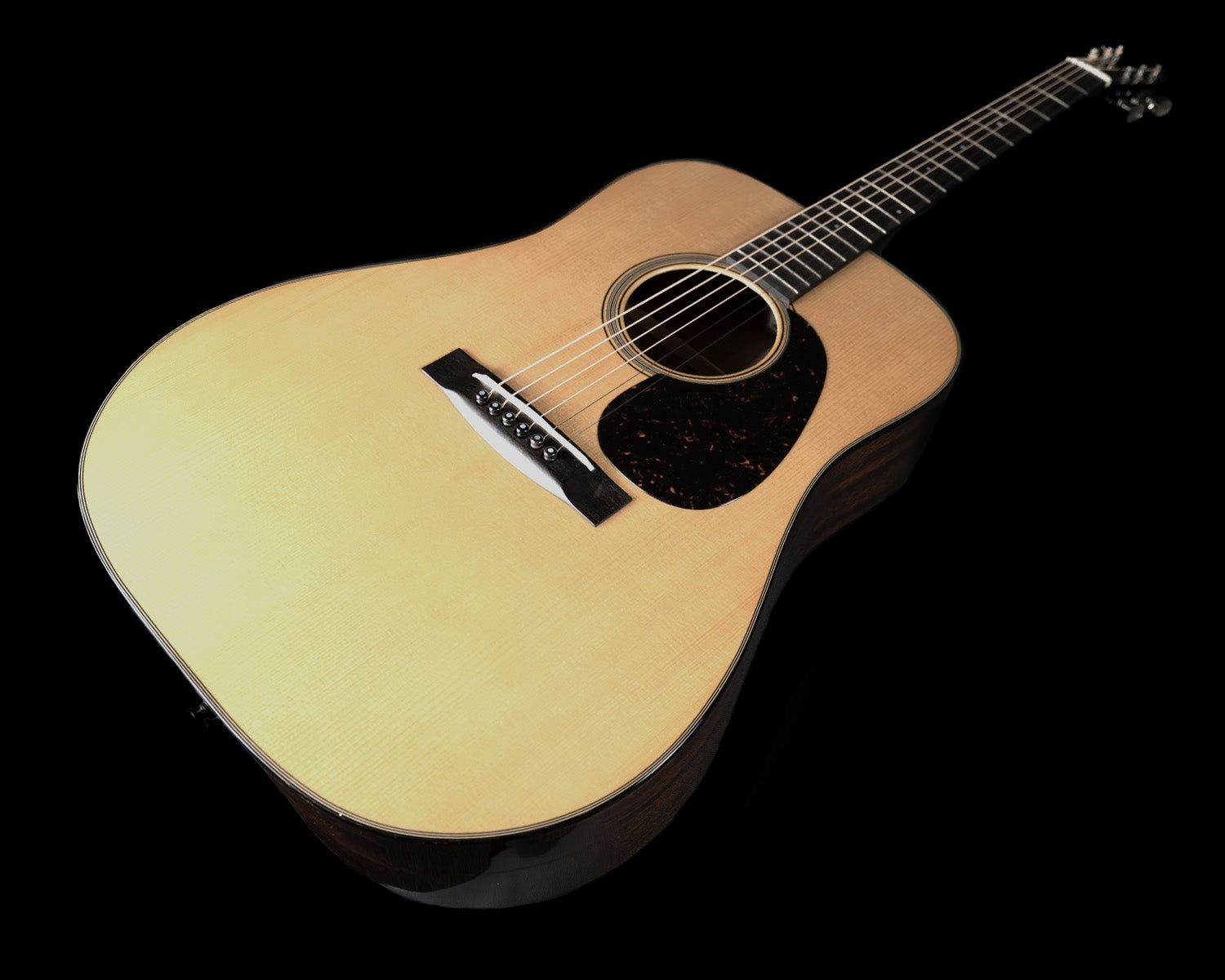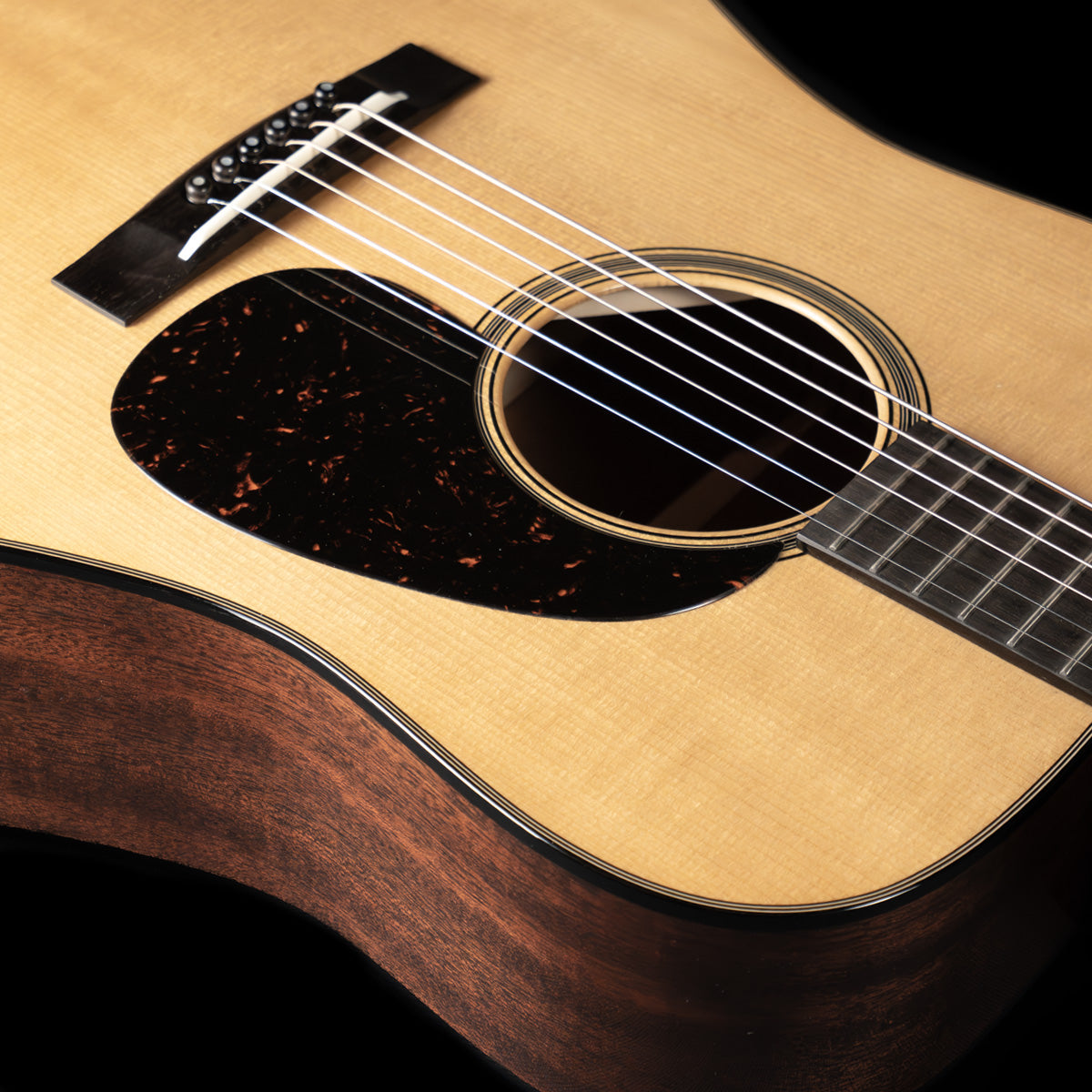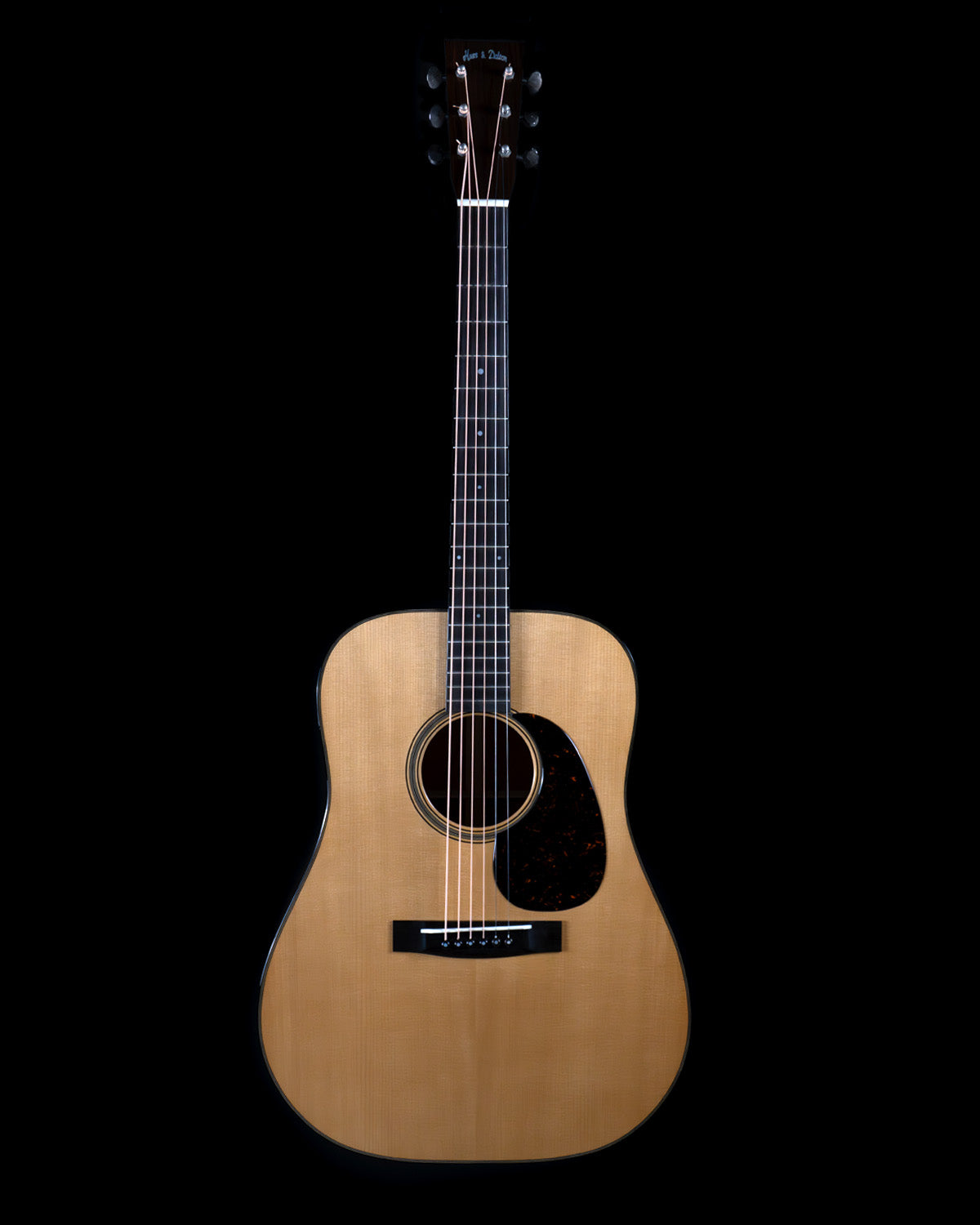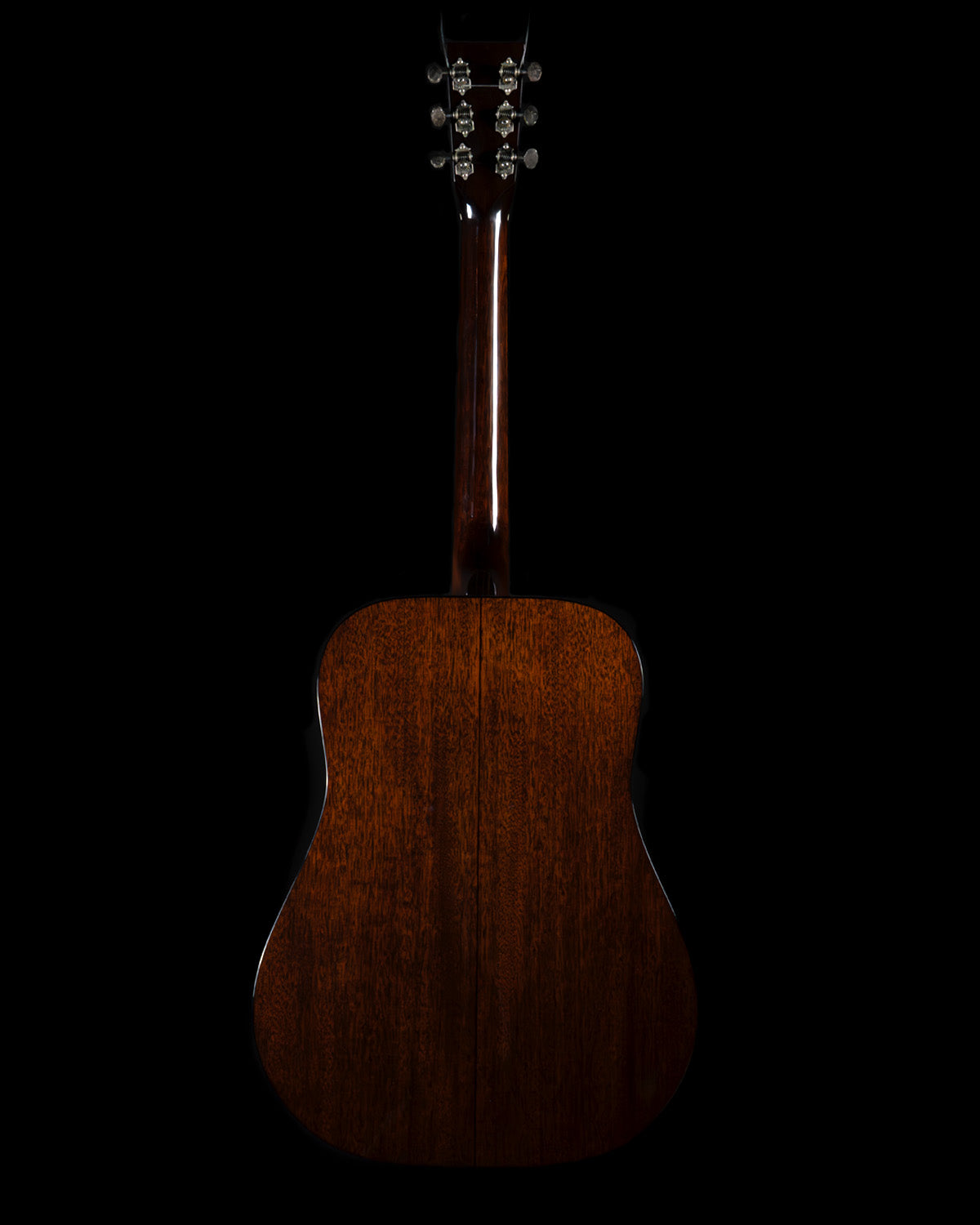 Adirondack spruce top and braces, mahogany back, sides and neck. Long scale with 1 3/4" nut, 2 1/4" string spacing at the saddle, and a modified V neck that measures .875" thick at the first fret and .971" at the ninth. Appointments are "18 Style" all the way, tortoise binding, 3-ring rosette, b/w/b top purfling, dot inlays.