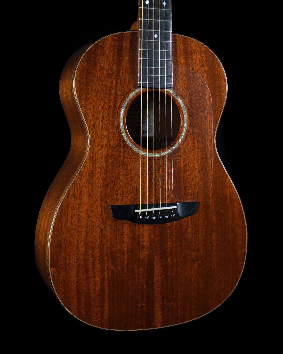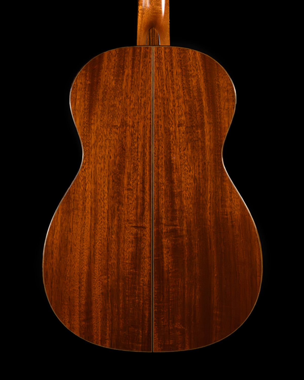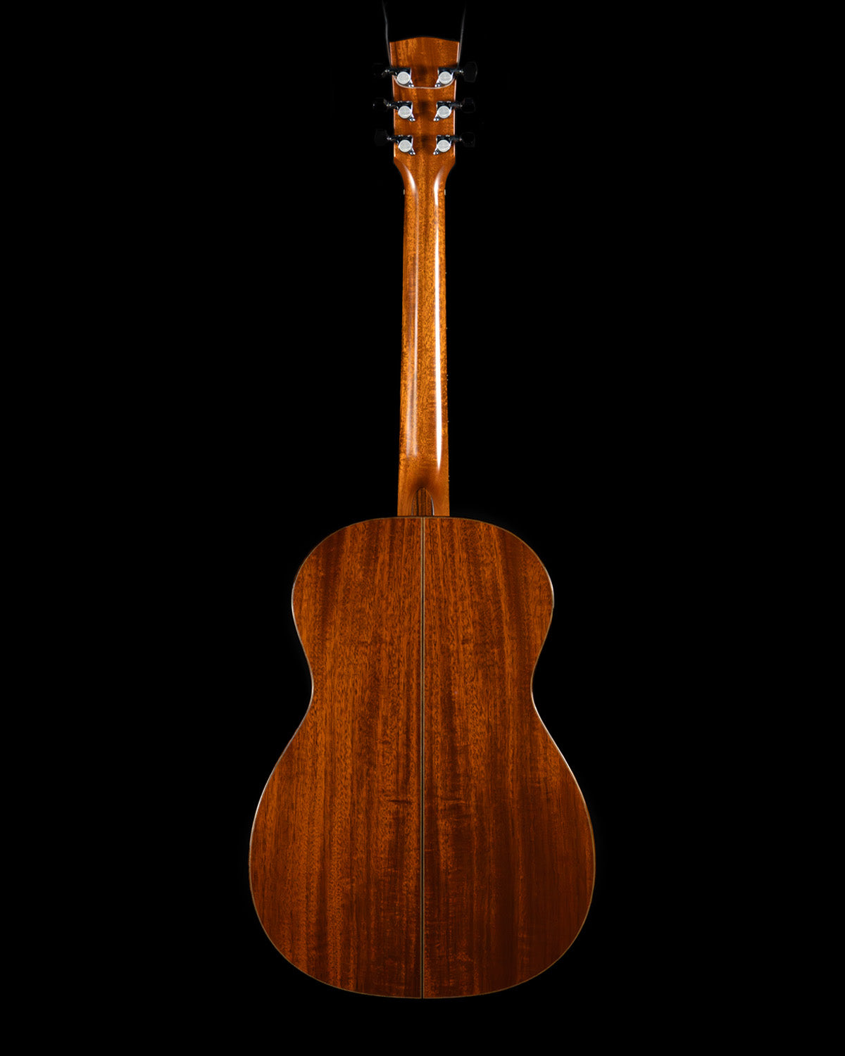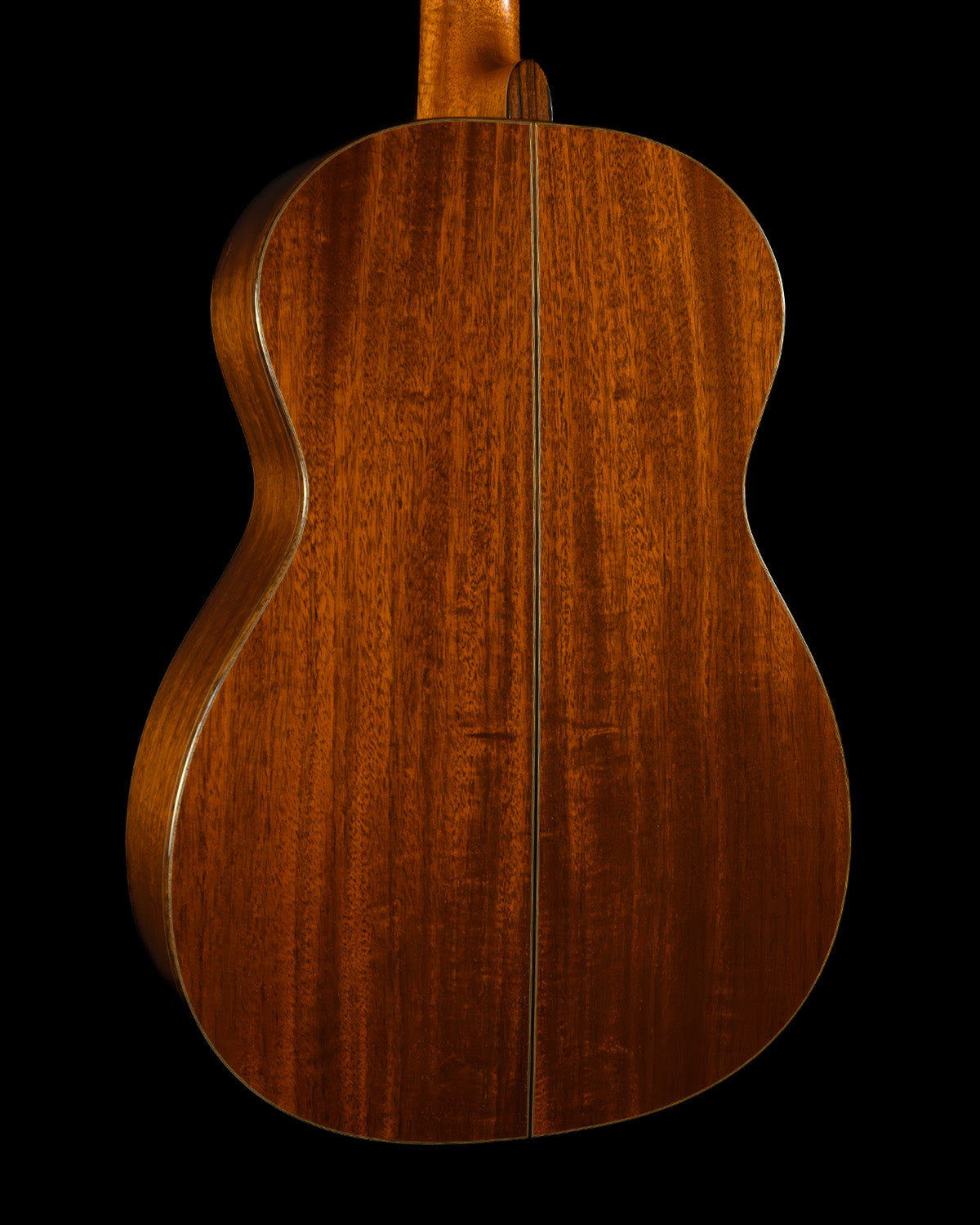 Mahogany top, back, sides and neck. Fully bound in rosewood with b/w/b top purfling accents and abalone rosette. Large clear pick guard. Ebony fingerboard with diamond inlays. 1 3/4" nut, 2 1/4" string spacing at the saddle, 25" scale length. The neck is a C shape and measures .89" at the first fret, .954" at the ninth. Gotoh 510 tuners with ebony buttons.