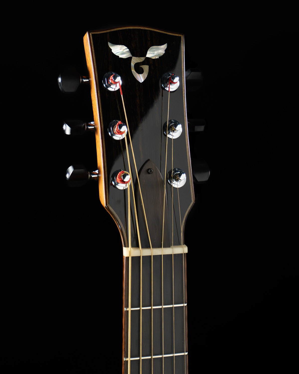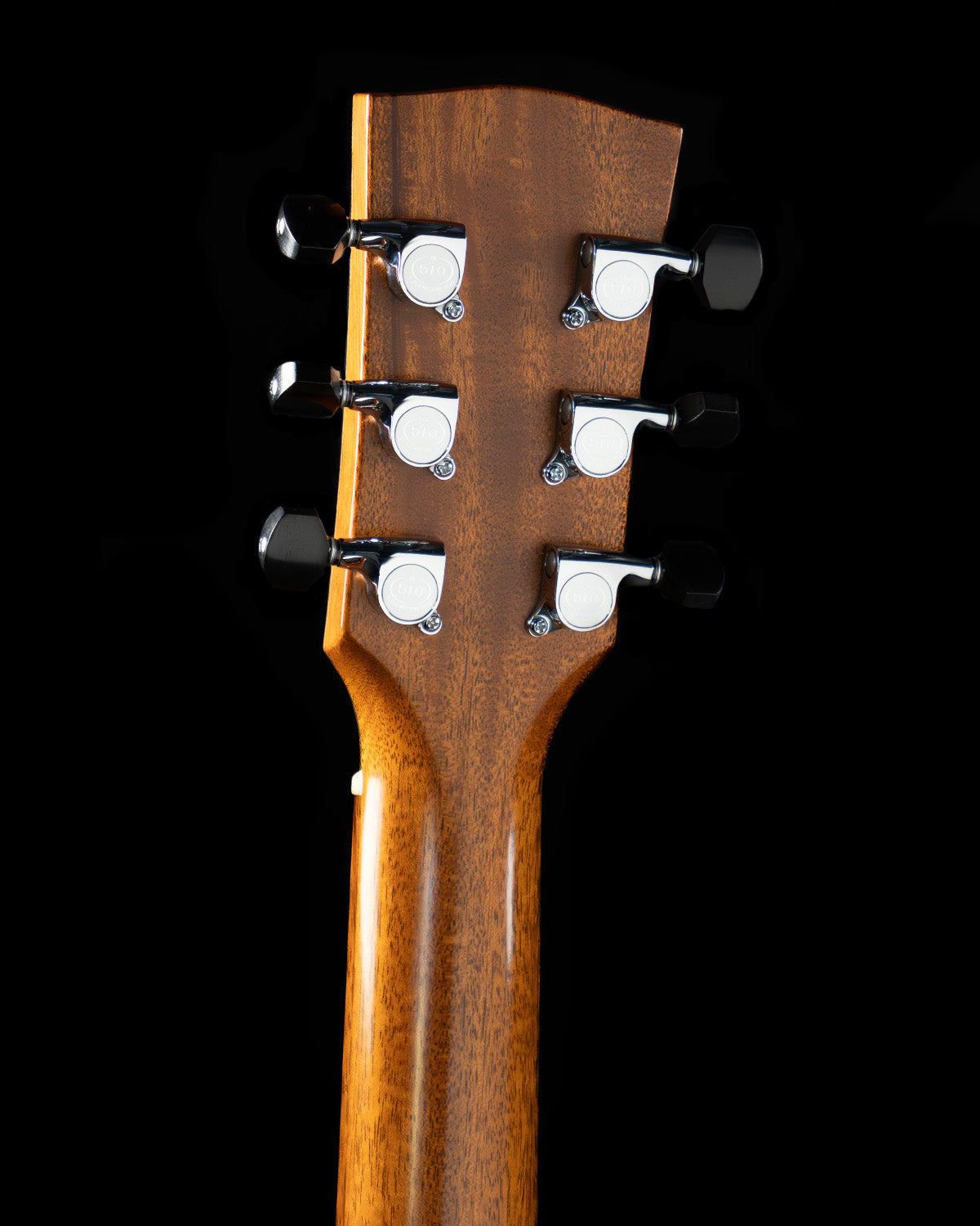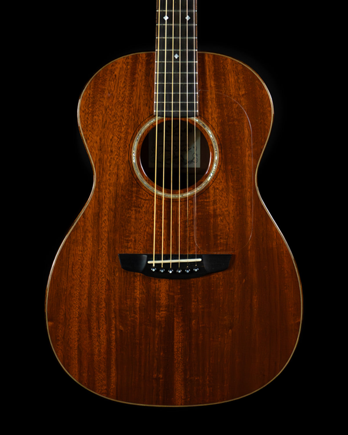 Mahogany top, back, sides and neck. Fully bound in rosewood with b/w/b top purfling accents and abalone rosette. Large clear pick guard. Ebony fingerboard with diamond inlays. 1 3/4" nut, 2 1/4" string spacing at the saddle, 25" scale length. The neck is a C shape and measures .89" at the first fret, .954" at the ninth. Gotoh 510 tuners with ebony buttons.