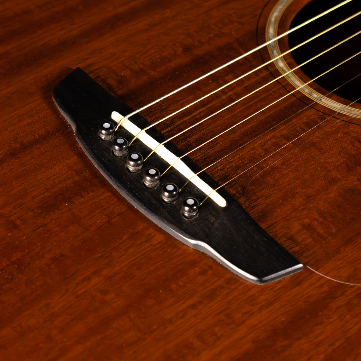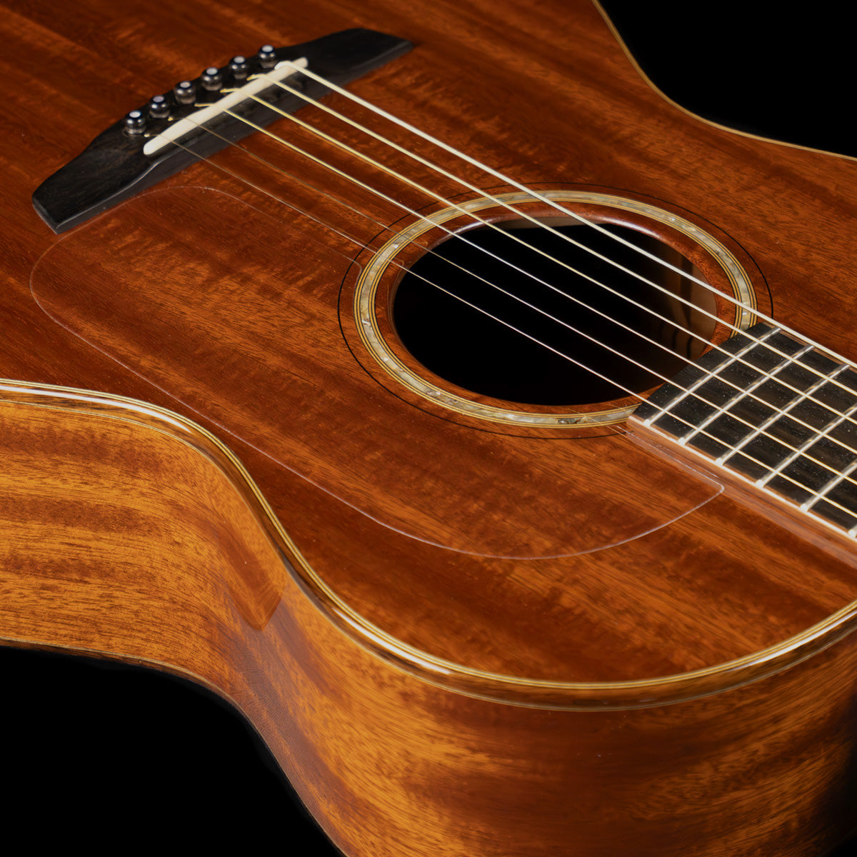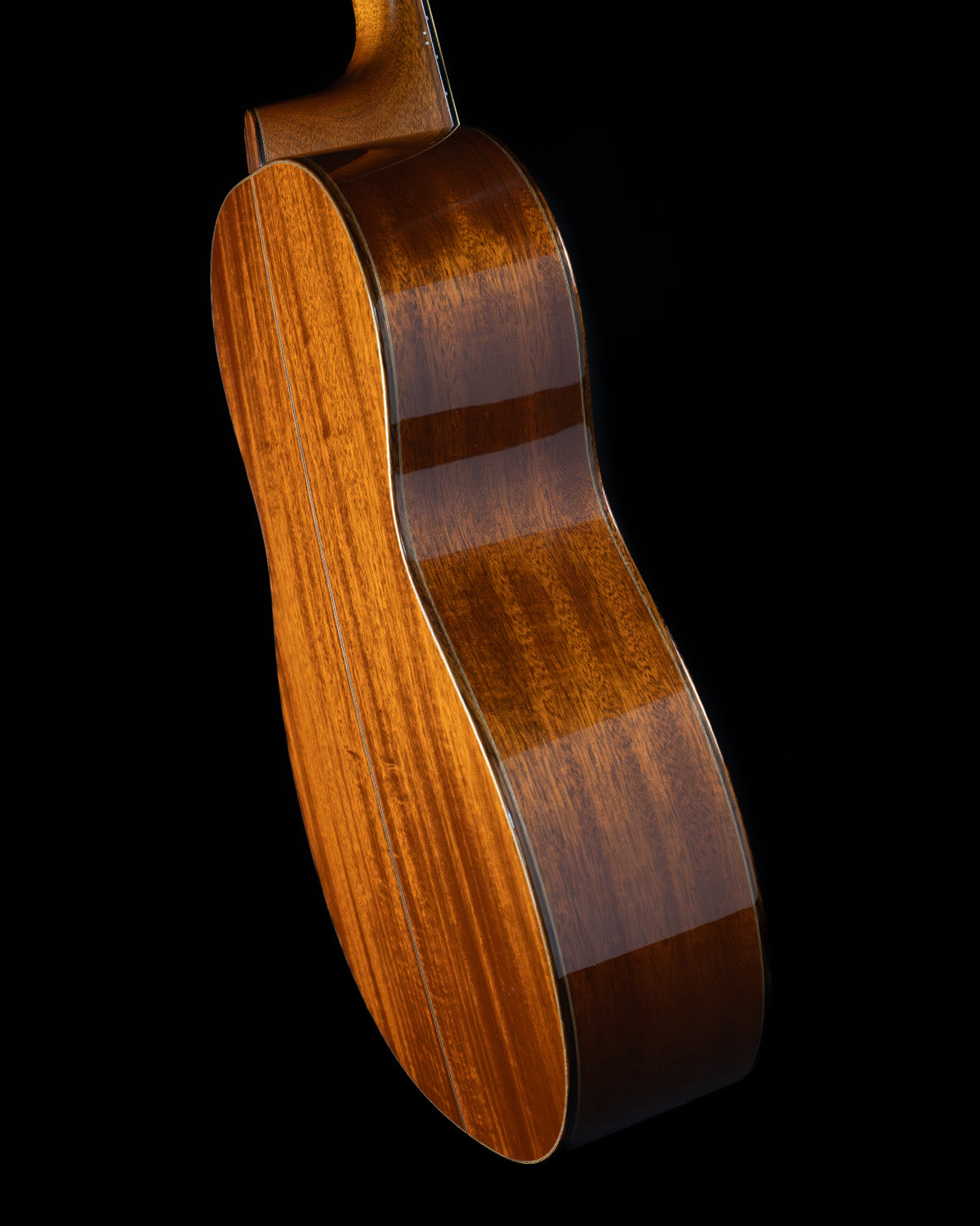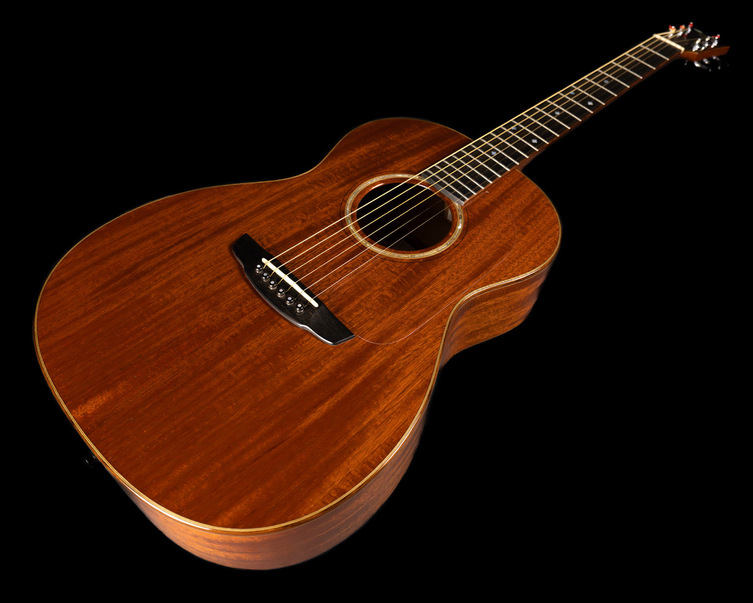 Mahogany top, back, sides and neck. Fully bound in rosewood with b/w/b top purfling accents and abalone rosette. Large clear pick guard. Ebony fingerboard with diamond inlays. 1 3/4" nut, 2 1/4" string spacing at the saddle, 25" scale length. The neck is a C shape and measures .89" at the first fret, .954" at the ninth. Gotoh 510 tuners with ebony buttons.