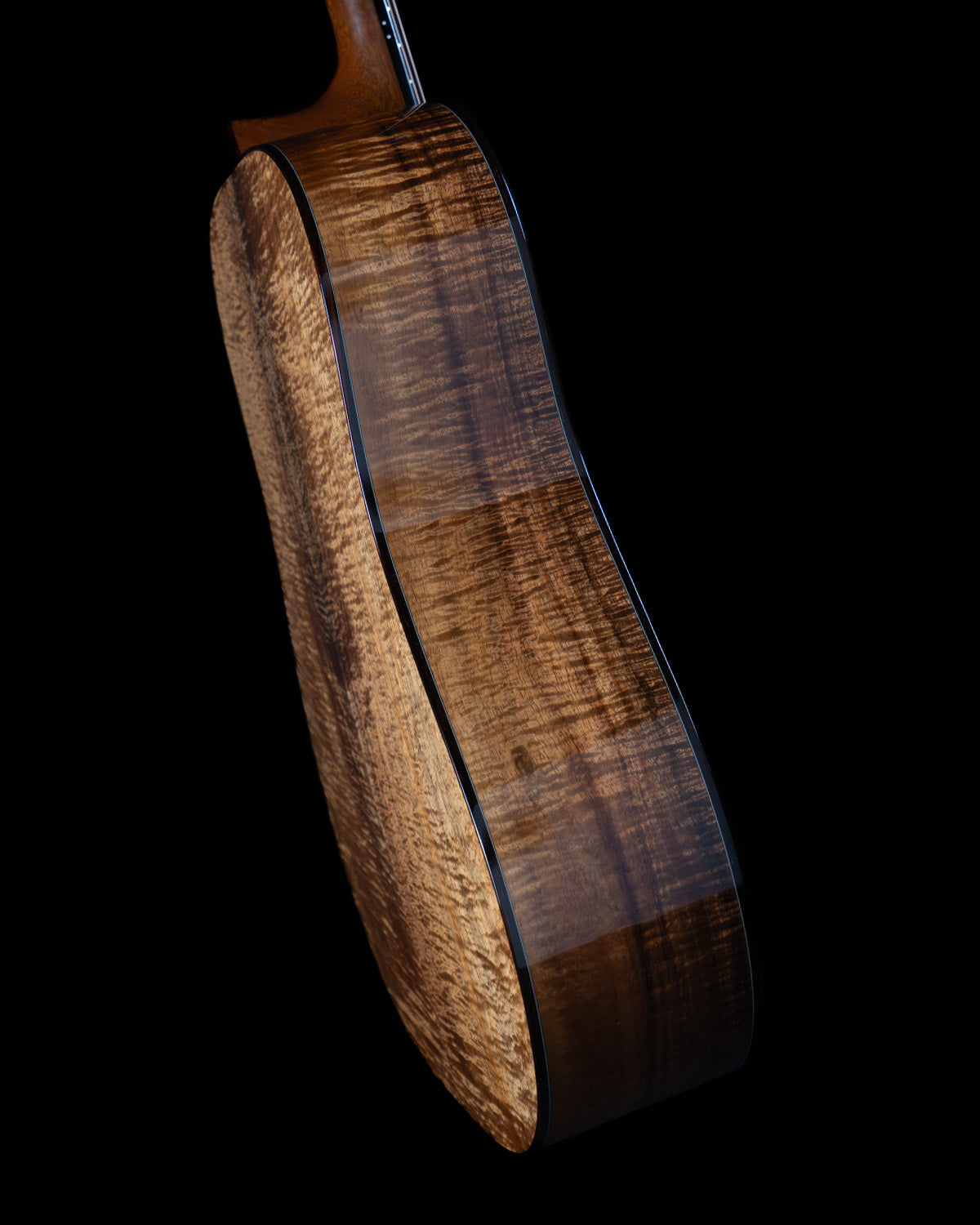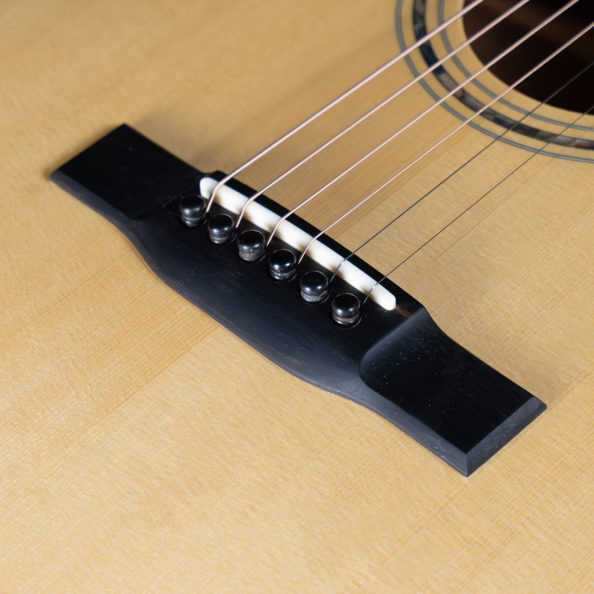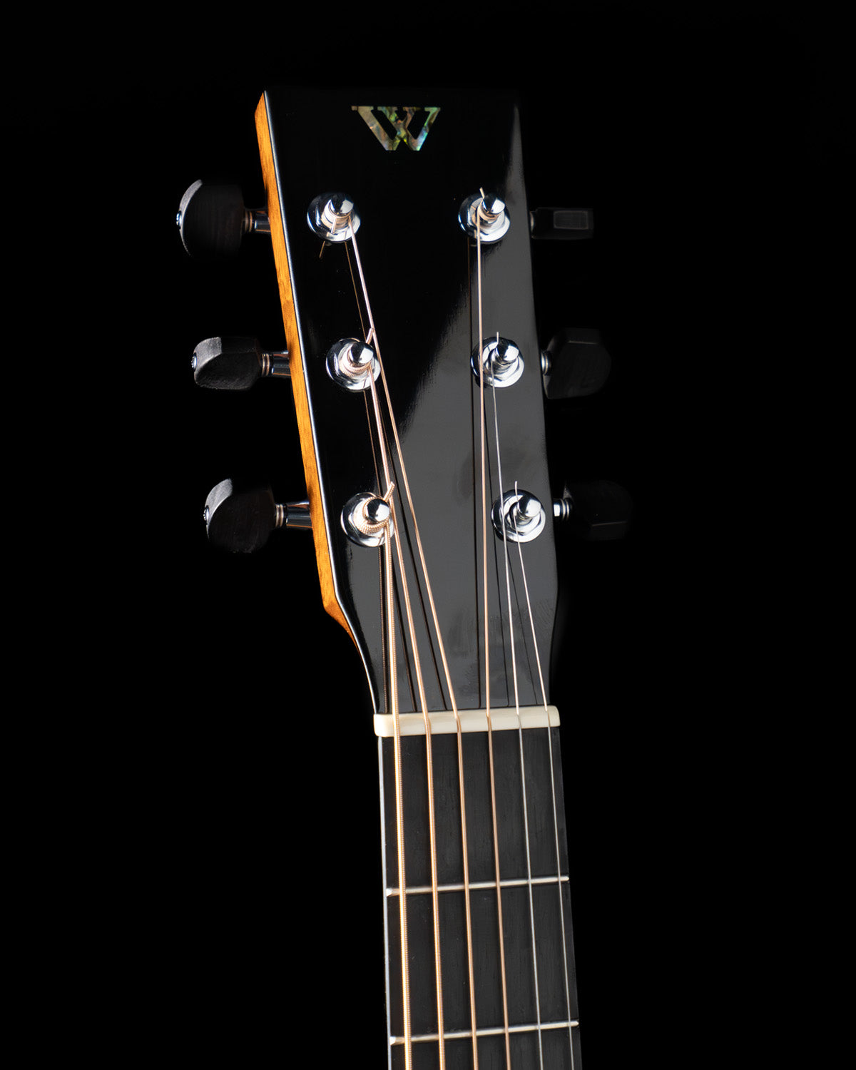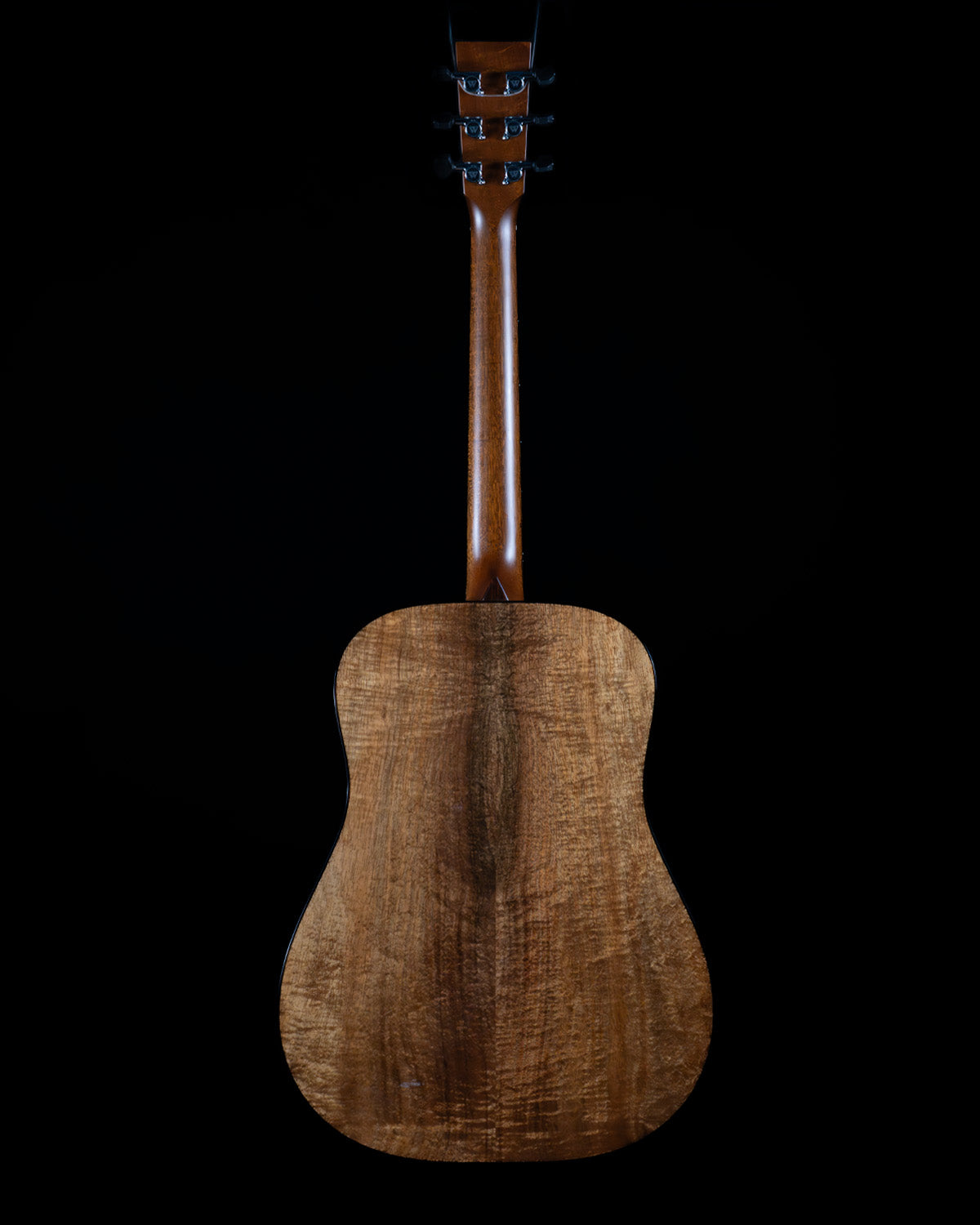 Long 25 5/8" scale length with 1 3/4" nut and 2 3/16" string spacing at the saddle. The mahogany neck is a comfortable low oval shape, it measures .842" thick at the first fret, .898" at the ninth. Ebony fingerboard with no inlays, ebony bridge with nice tall bone saddle. Tuners are Schaller closed gear w/ ebony buttons. Clear pick guard.