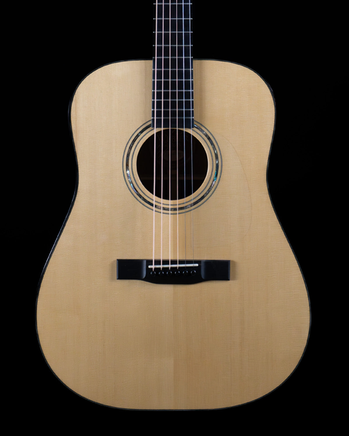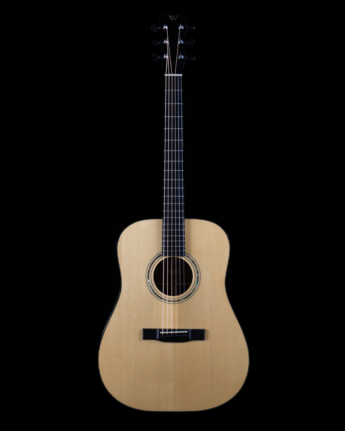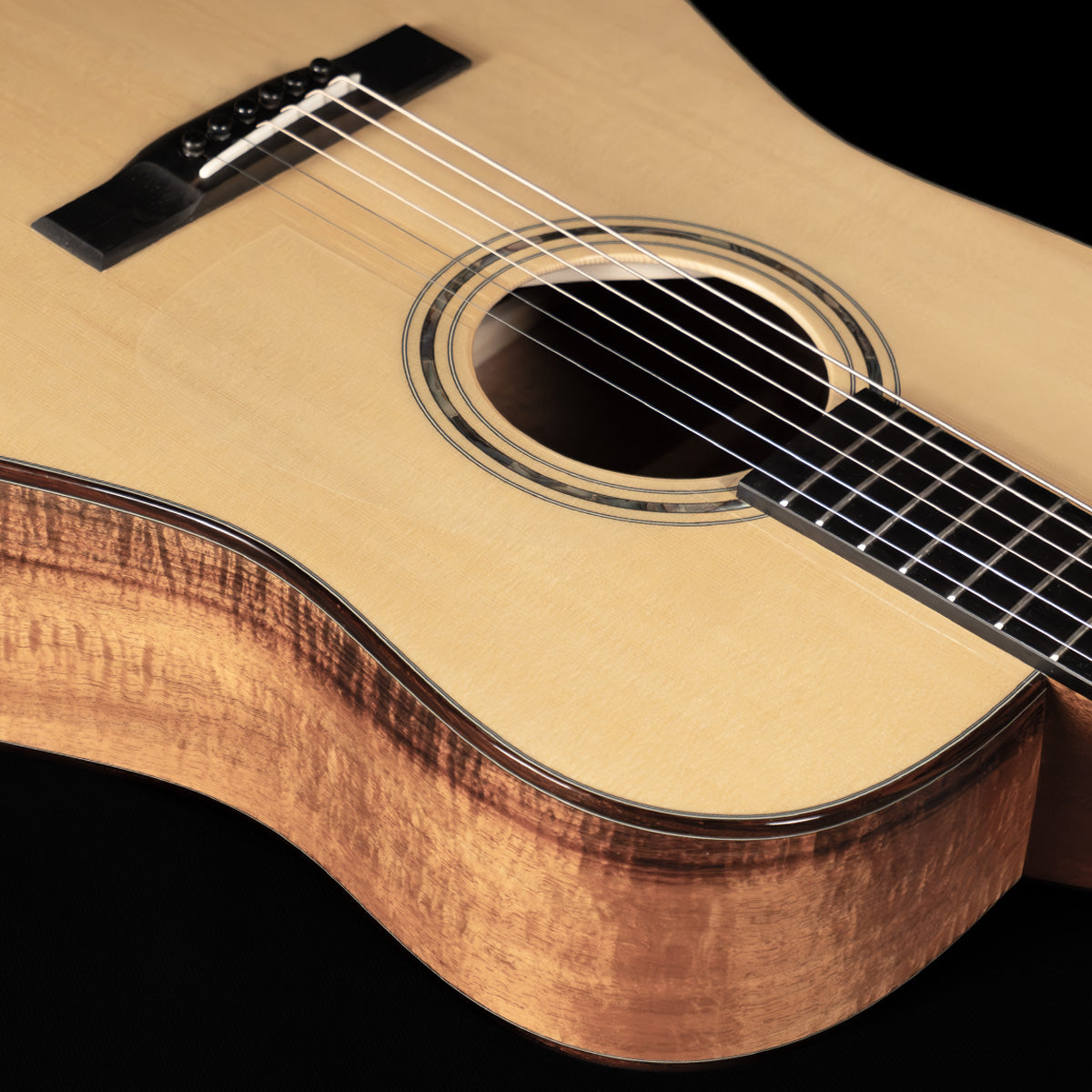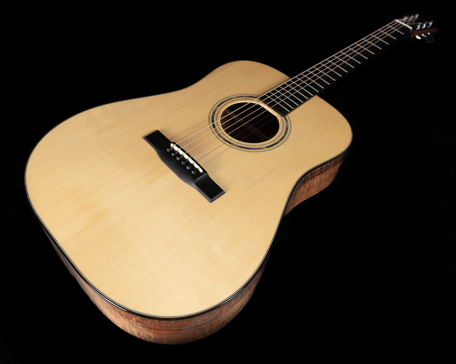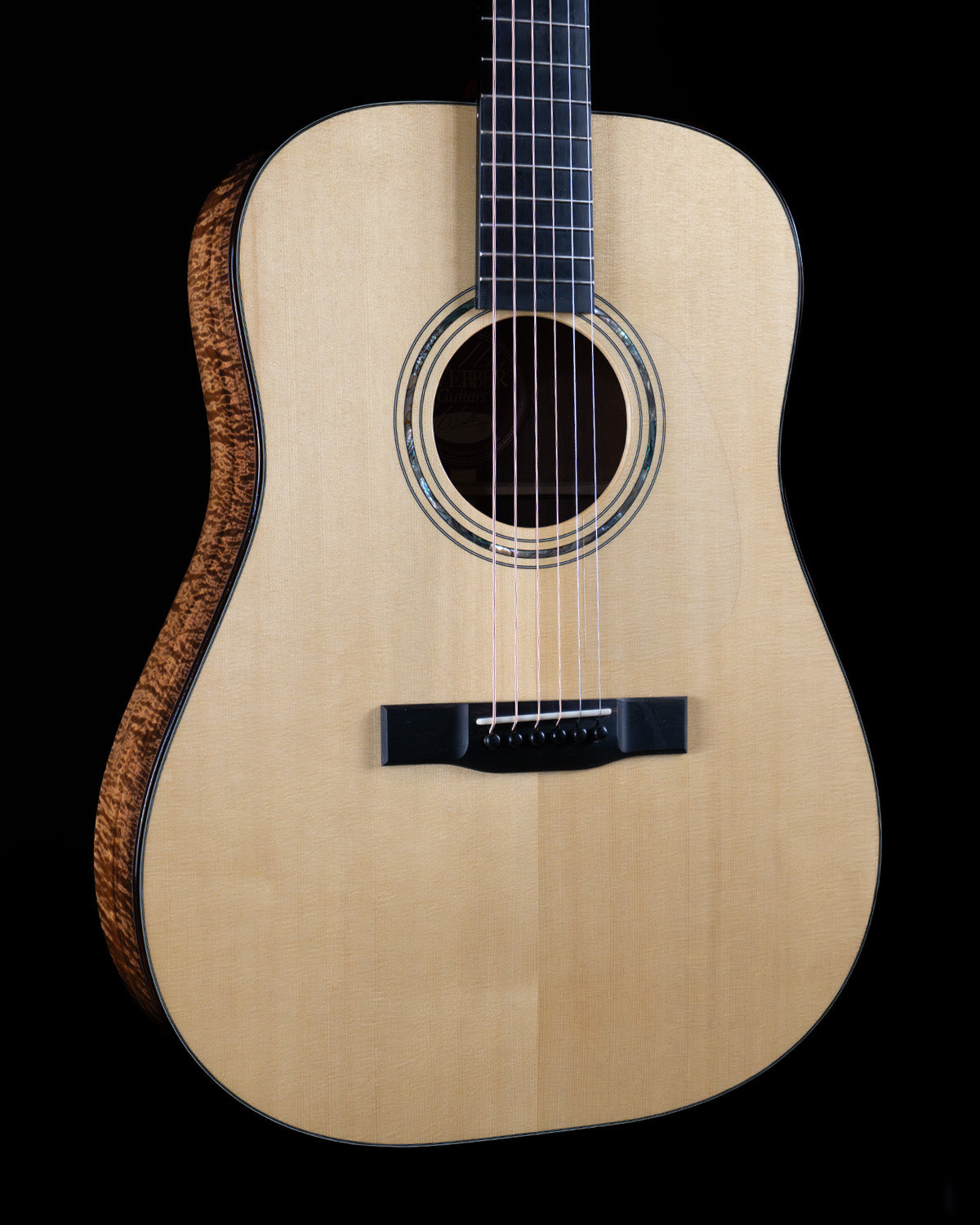 (USED) Here's a lovely dreadnought built by David Webber, up Vancouver way in Canada. It's a pretty thing, with classy appointments like abalone rosette and Snakewood body bindings, but the real star here are the tonewoods: Engelmann spruce (treasured for its warmth, rare on dreadnoughts) and figured Blackwood back/sides, which have a tight flame and a three-dimensional appearance akin to great koa. The tone of the guitar is rich but also sparkly, it strums and fingerpicks equally well.