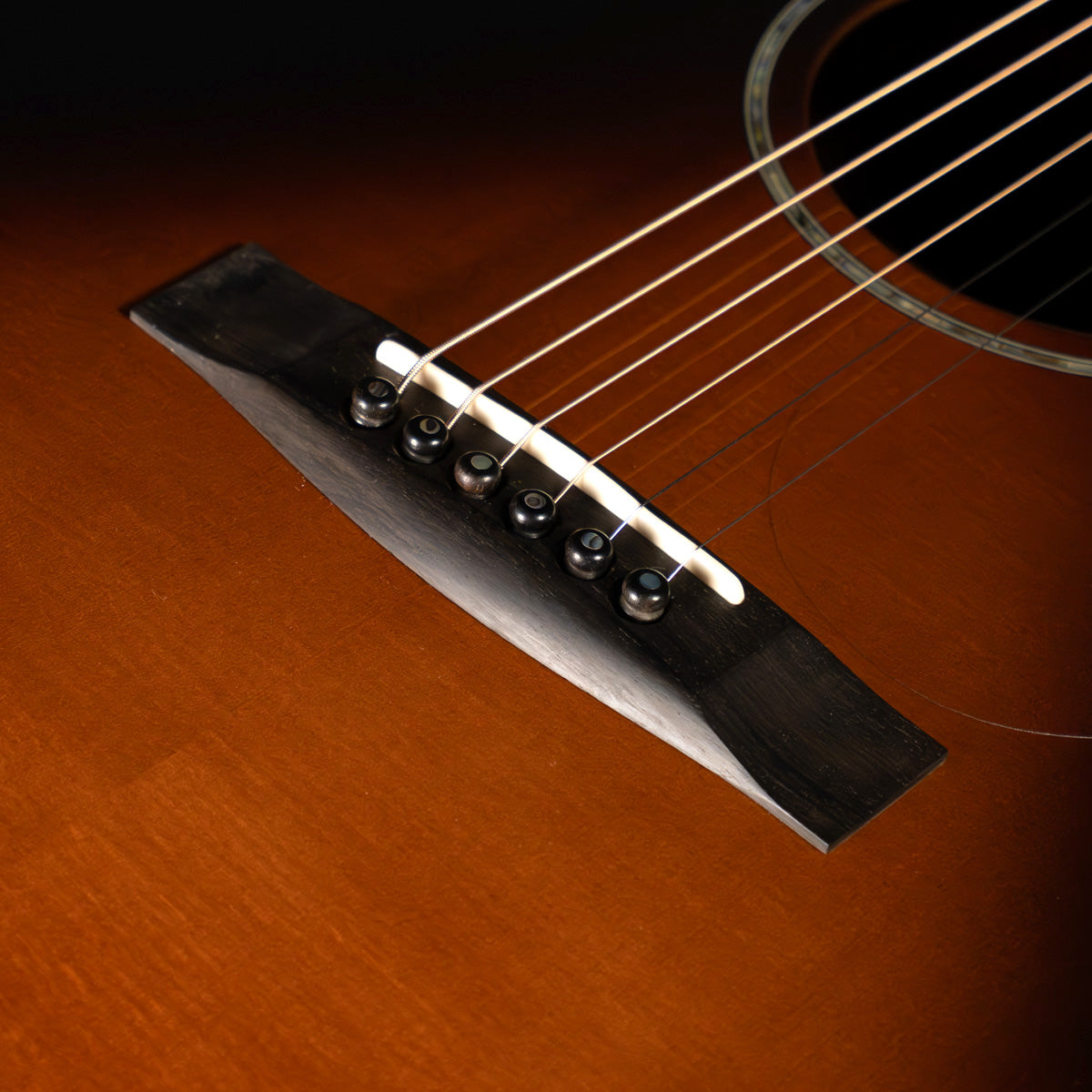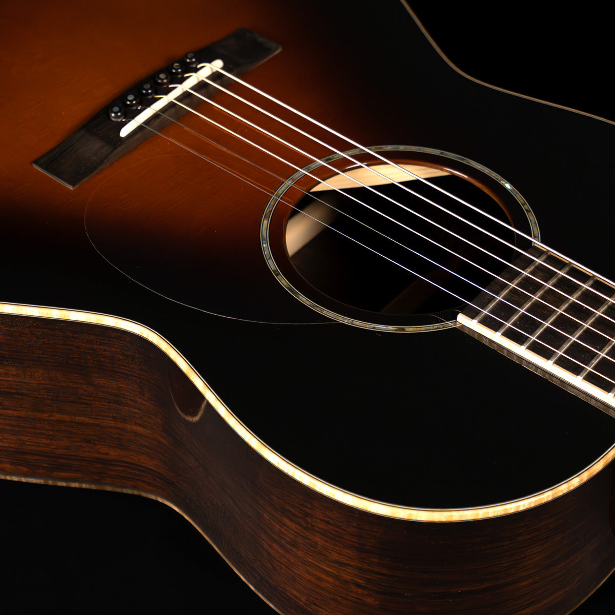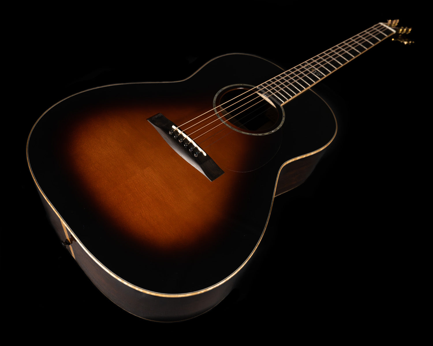 Engelmann spruce top, Indian rosewood back and sides, ebony fingerboard, maple body and fingerboard binding. The top has Mark Dalton's vintage tobacco sunburst and a clear pick guard. The nut is 1 3/4" and the string spacing at the saddle 2 1/4". Long 25.4" scale length. The fingerboard is free of inlays other than a flourish at the octave. The tuners are gold Schallers with the Huss & Dalton logo.