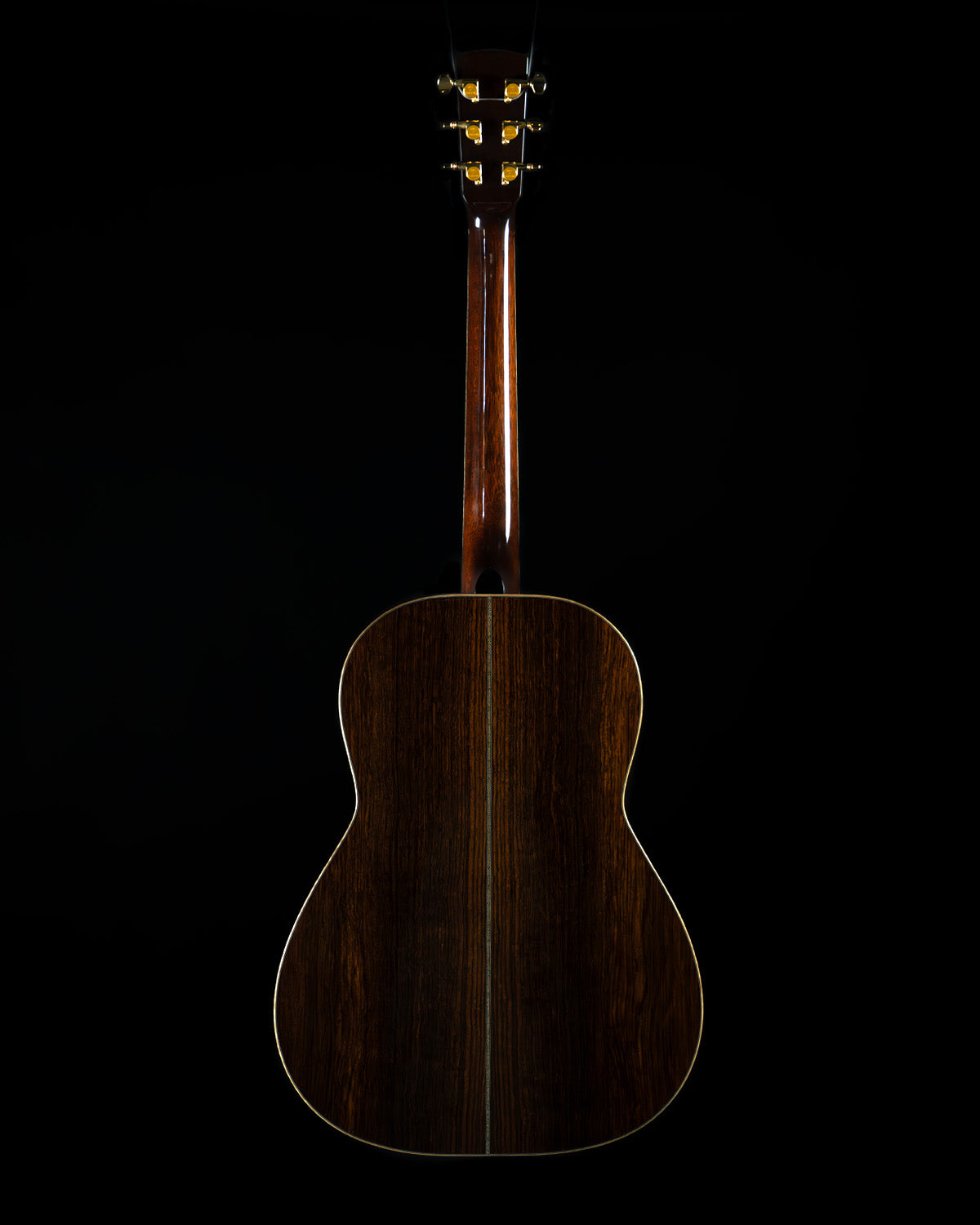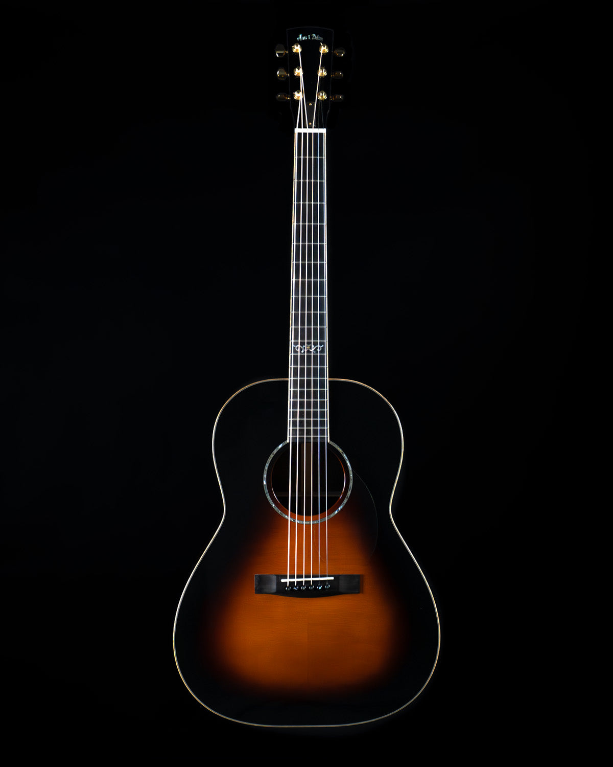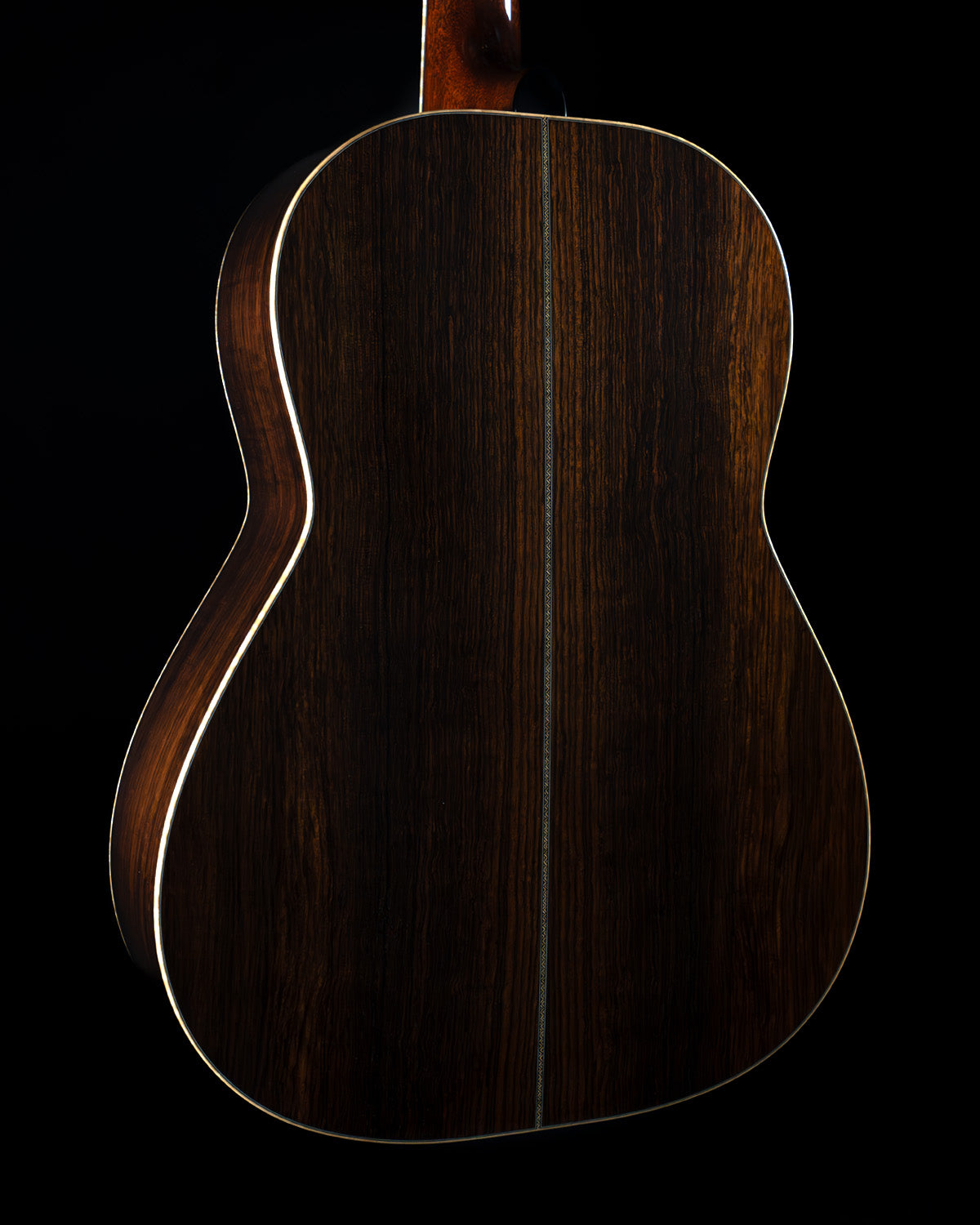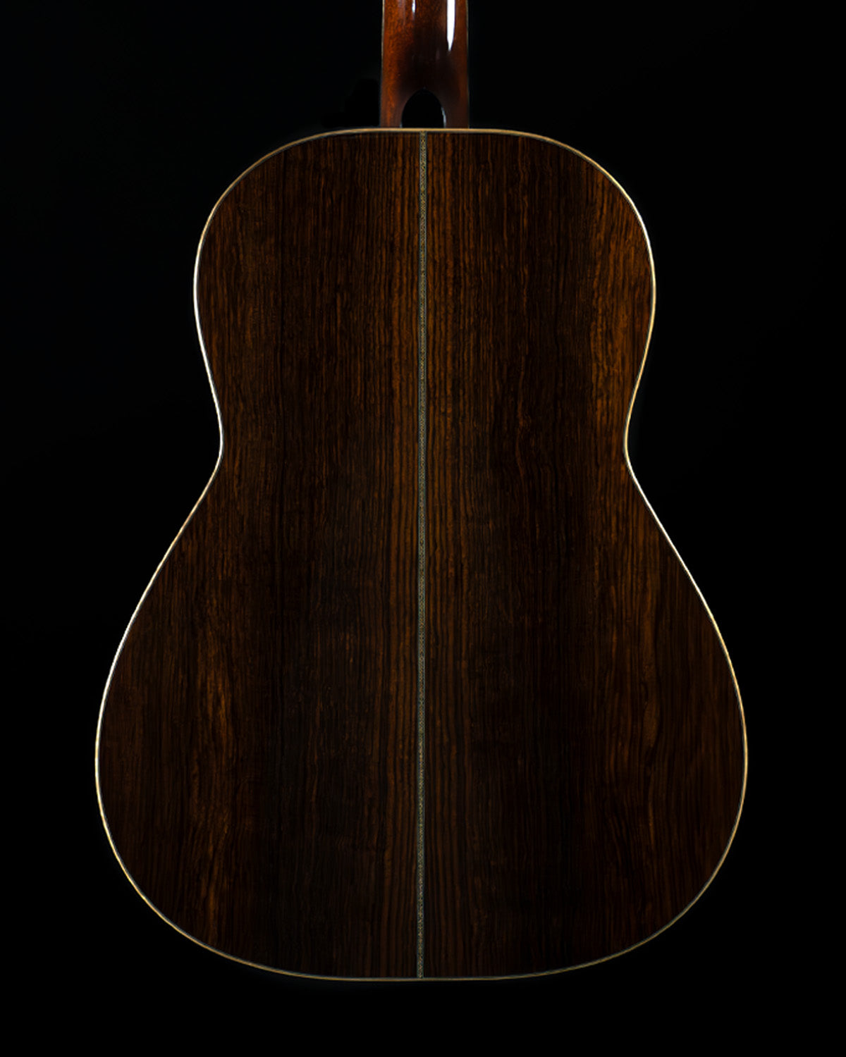 Engelmann spruce top, Indian rosewood back and sides, ebony fingerboard, maple body and fingerboard binding. The top has Mark Dalton's vintage tobacco sunburst and a clear pick guard. The nut is 1 3/4" and the string spacing at the saddle 2 1/4". Long 25.4" scale length. The fingerboard is free of inlays other than a flourish at the octave. The tuners are gold Schallers with the Huss & Dalton logo.