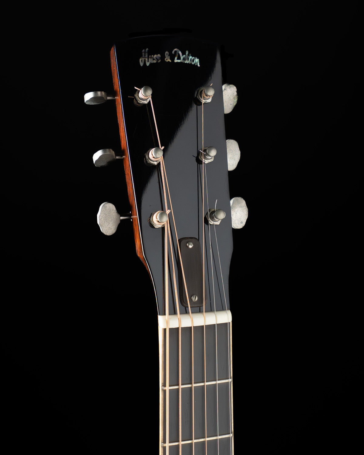 Short 24 7/8" scale length, 1 23/32" nut width and 2 1/4" string spacing at the saddle. The neck is a modified V shape and measures .843" thick at the first fret, 1.02" at the ninth. The ebony fingerboard has snowflake inlays, and the fingerboard and body have maple bindings. The Waverly open gear tuners have collected some tarnish over the years, presenting with a relic'd look and texture, but otherwise the condition of this instrument couldn't be better! Includes original hard case.