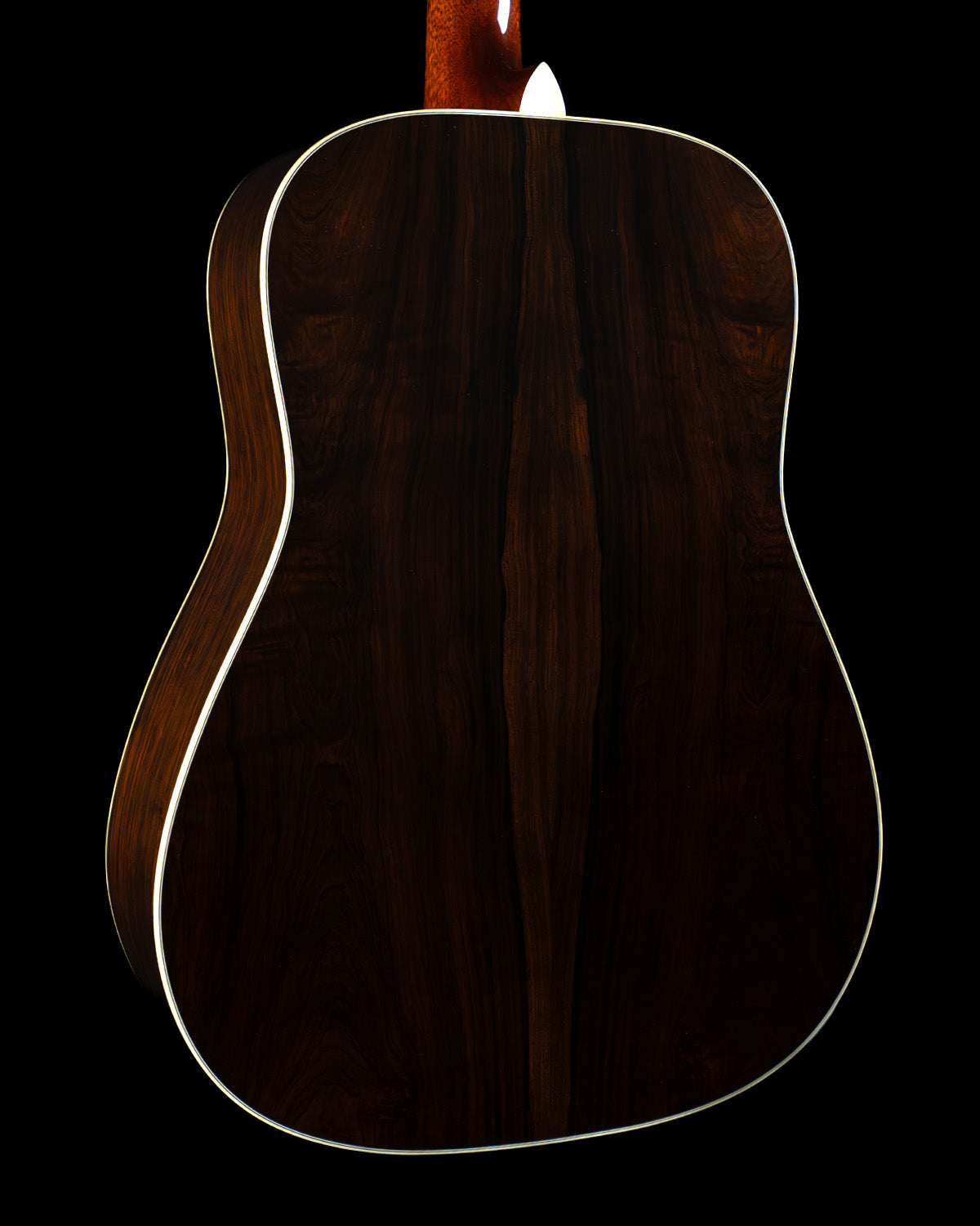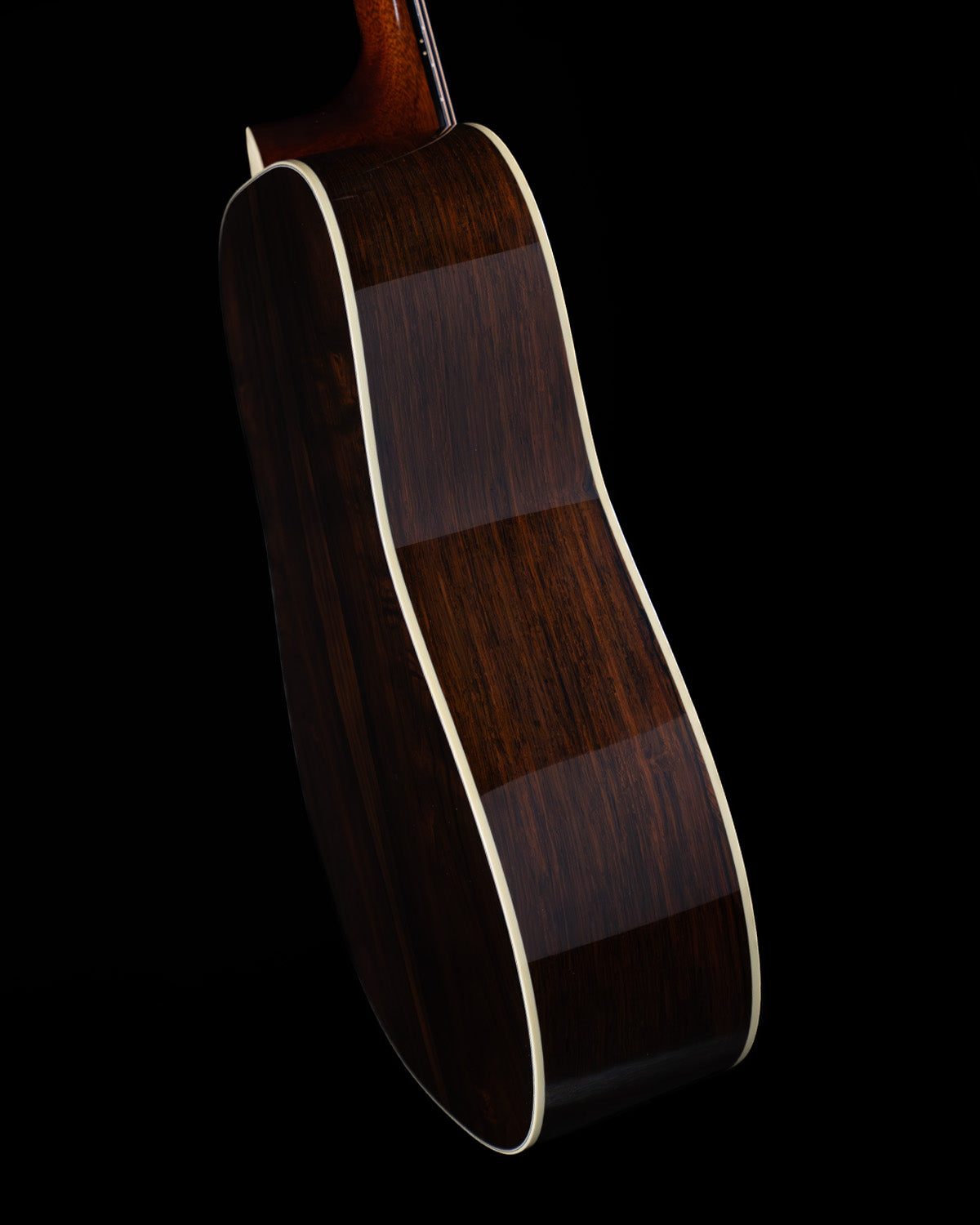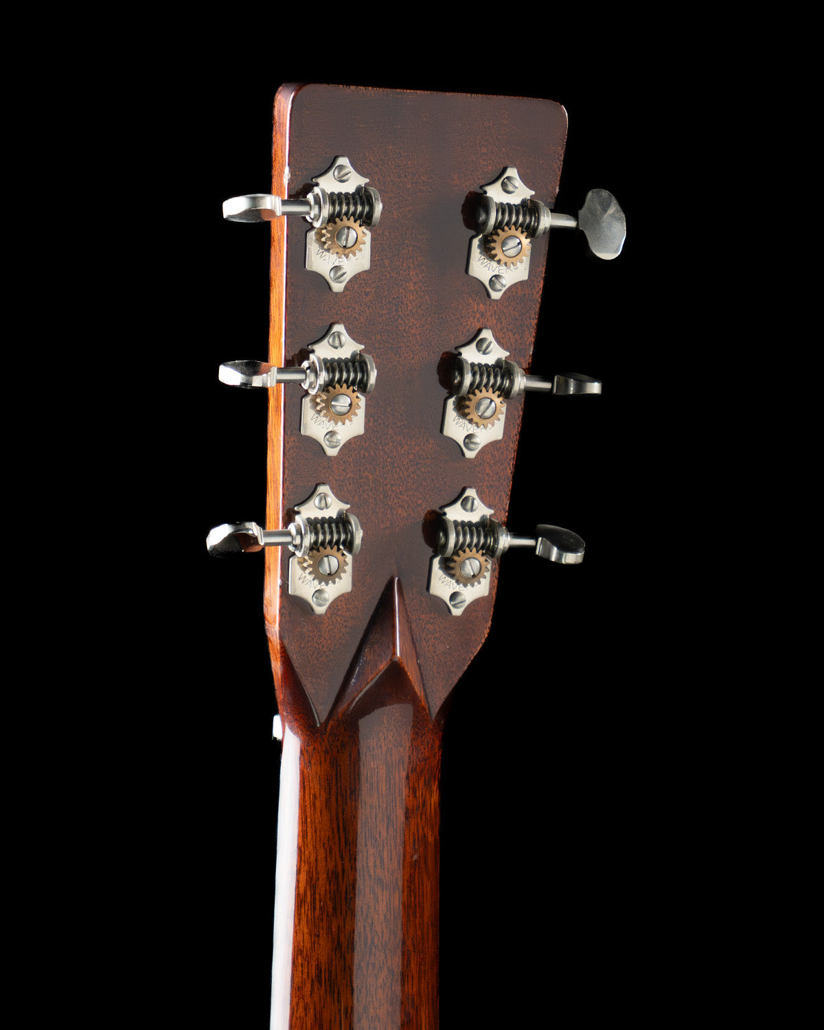 Spec-wise, this guitar has a 1 23/32" nut and 2 3/16" string spacing at the saddle. One-piece mahogany neck with traditional volute and Waverly open-back tuners. Ebony fingerboard with diamond and square inlays, bone bridge pins, abalone rosette and herringbone top purfling. It is a prize.