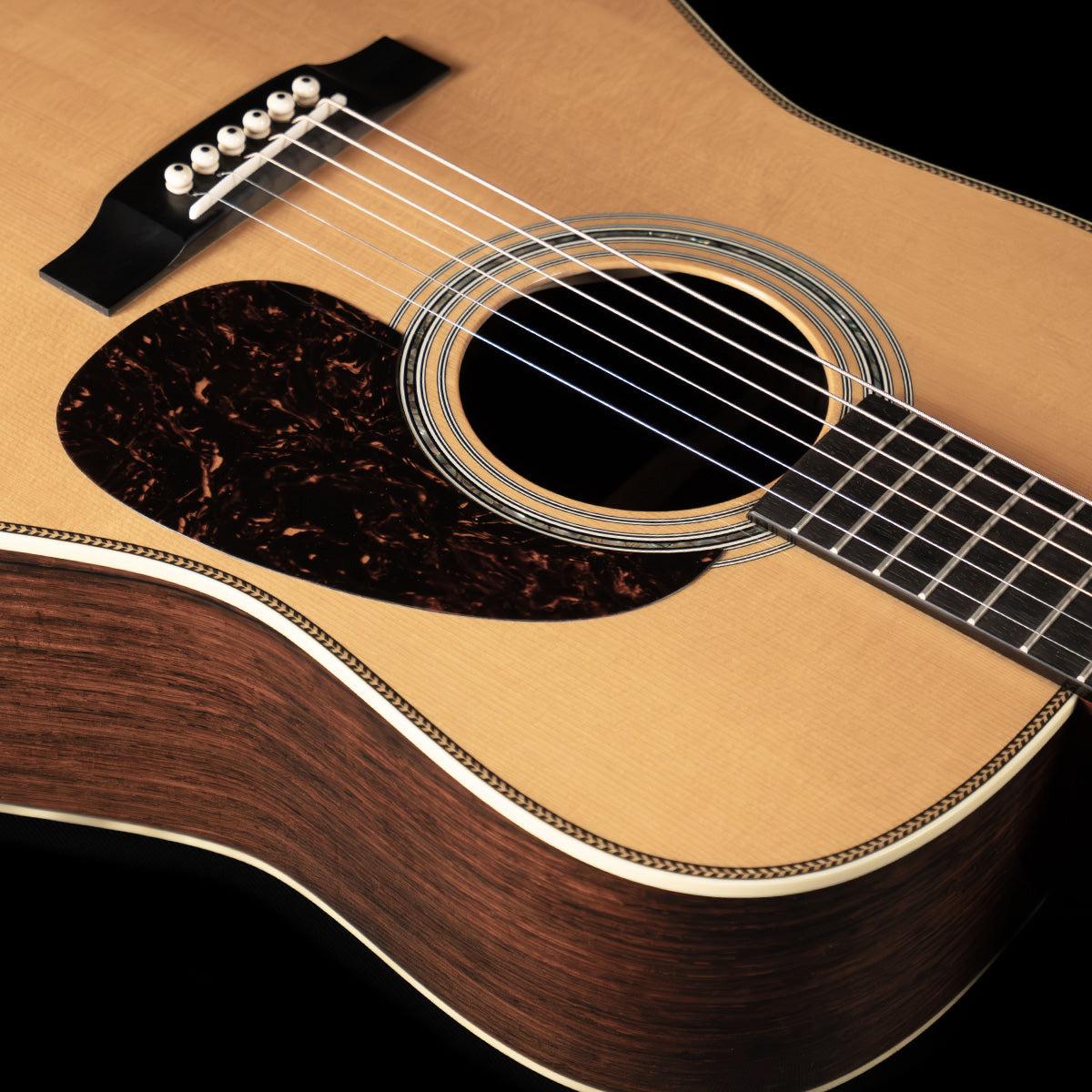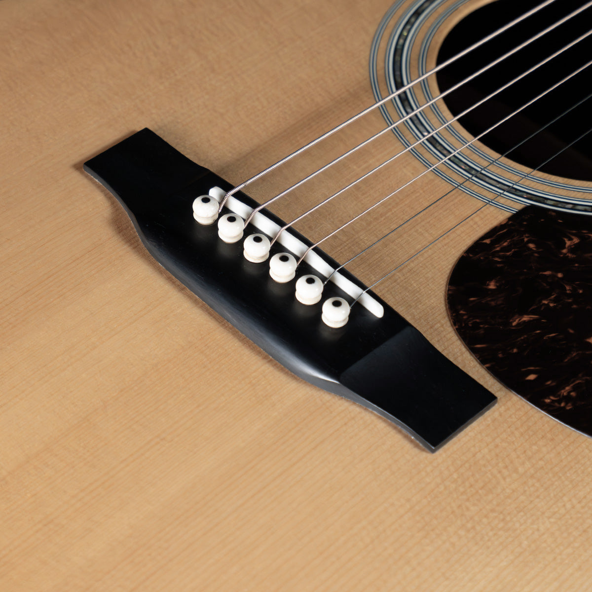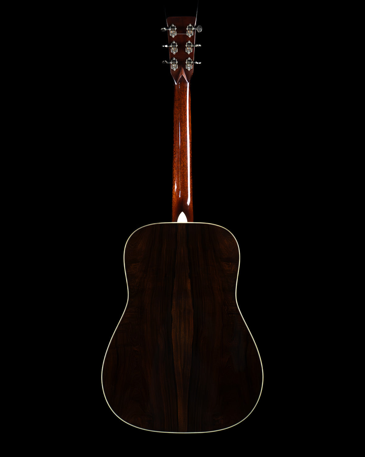 Spec-wise, this guitar has a 1 23/32" nut and 2 3/16" string spacing at the saddle. One-piece mahogany neck with traditional volute and Waverly open-back tuners. Ebony fingerboard with diamond and square inlays, bone bridge pins, abalone rosette and herringbone top purfling. It is a prize.
