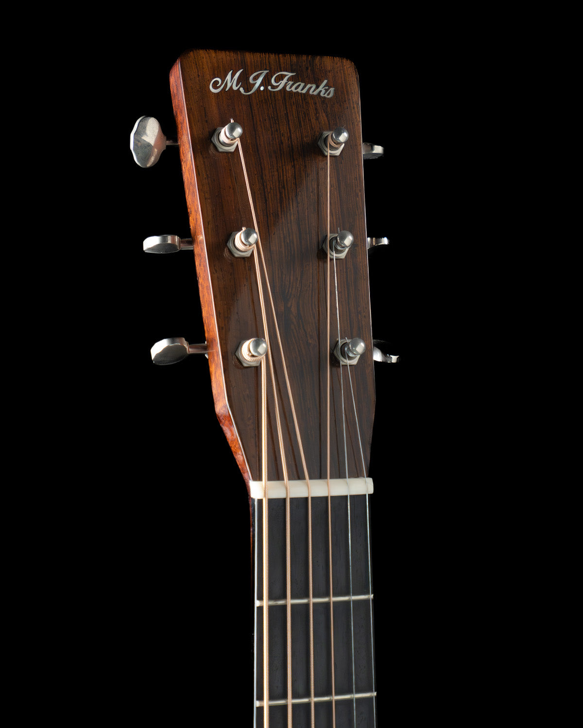 (USED) Increasingly sought out for his ukuleles and resonators, Michigan luthier Mike Franks also builds a FINE traditional guitar! We're very pleased to present this Legacy dreadnought, featuring an Adirondack spruce top and figured Brazilian rosewood back and sides. This instrument has all the guts and volume of a classic vintage Herringbone, with a nice booming bass but a midrange that is more "sparkle" than "scooped". The lines are clean, the craftsmanship top-notch, with fit and finish to rival the best flat tops on the market, and you know who we mean! :-)