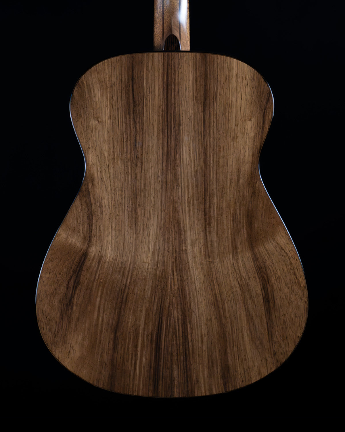 This example has an Adirondack spruce top and Madagascar back/sides. The "Modified Dreadnought" concept takes some inspiration from Somojyi, known for his forward-thinking style and ultra-responsive guitars. At 15 5/8" across the lower bout, this one lands between an OM and a small jumbo, but has body depth of 4 3/4" at the tail.