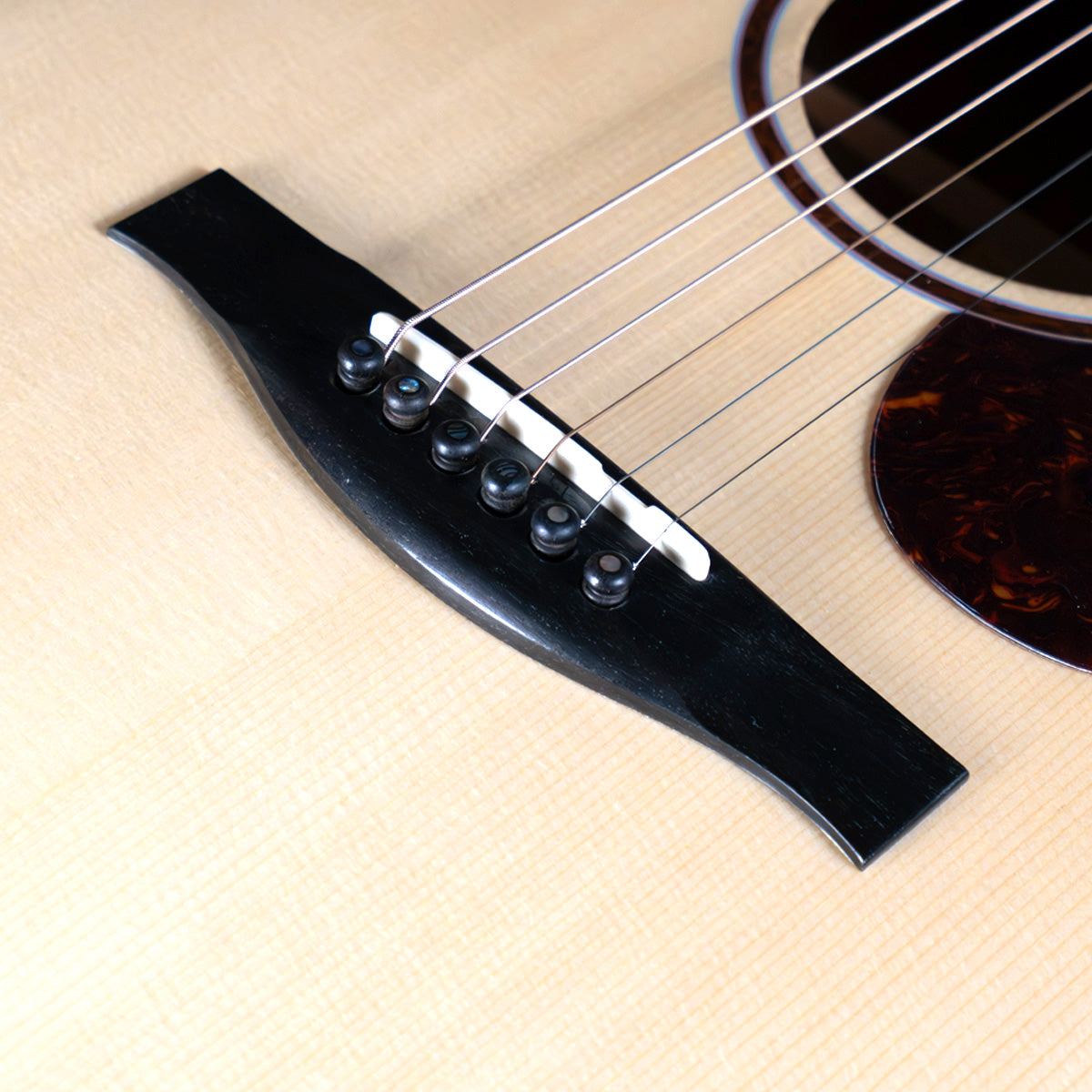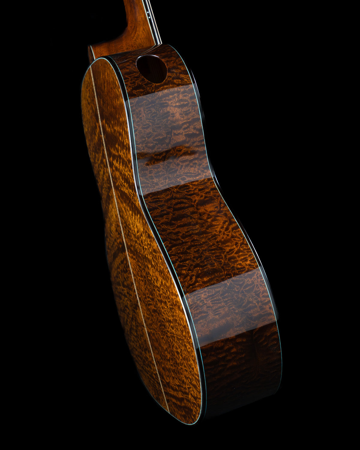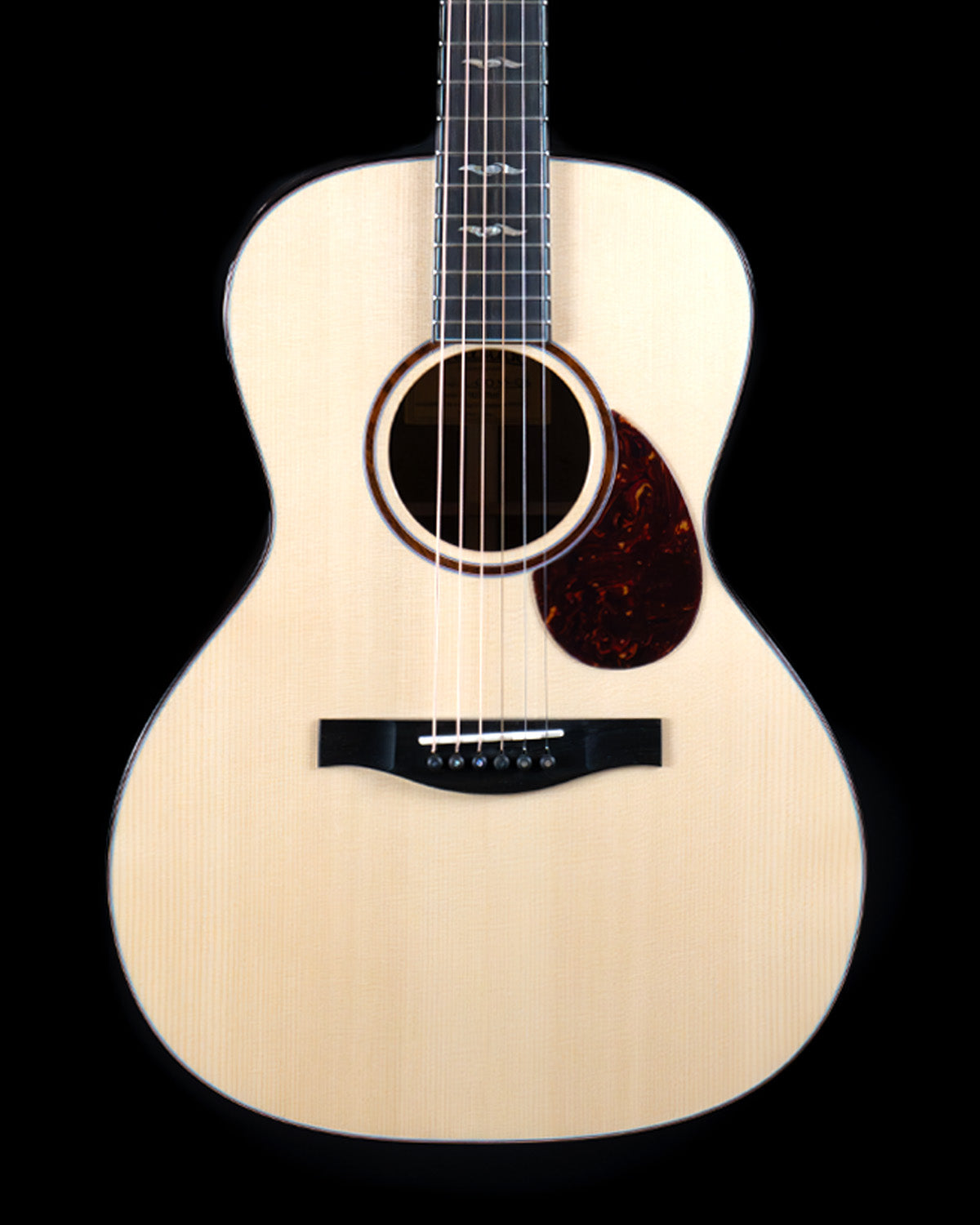 It's short scale (24 3/4") with a 1 11/16" nut, 2 5/32" string spacing at the saddle and their "vintage C" neck profile. The appointments are generous on this one, with rosewood binding, a sound port, bound neck and peghead, a Snakewood rosette and subtle turquoise accents on every edge. Hurricane pearl fingerboard inlays. Open-gear tuners with ebony buttons. The fingerboard, bridge and pins are ebony, the bone saddle sits nice and tall (yet the action is nice and buttery!) Includes hard case.