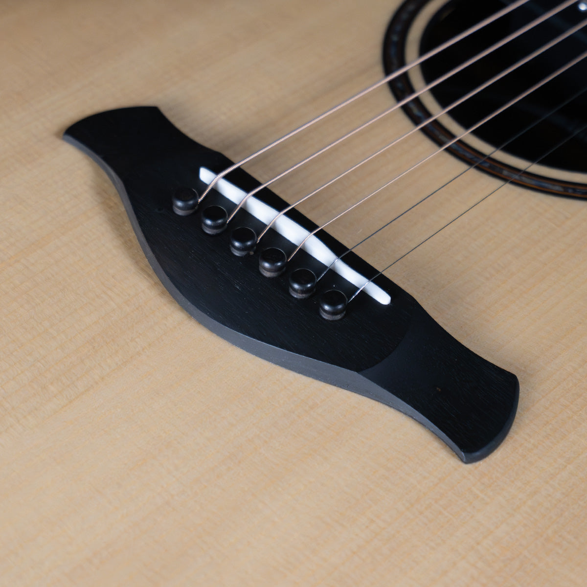 1 3/4" nut, 2 3/16" string spacing at the saddle, short 24.9" scale length. Neck profile is a modern low oval measuring .862" at the first fret and .897" at the ninth. Condition is excellent with one small, shallow scratch near the end pin jack. The factory pickup system has been removed and it has been fit with a Dimarzio soundhole pickup. This guitar comes with a deluxe Calton case, grey with splatter over granite.