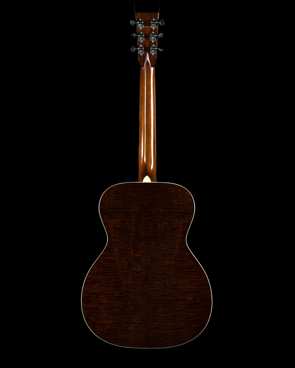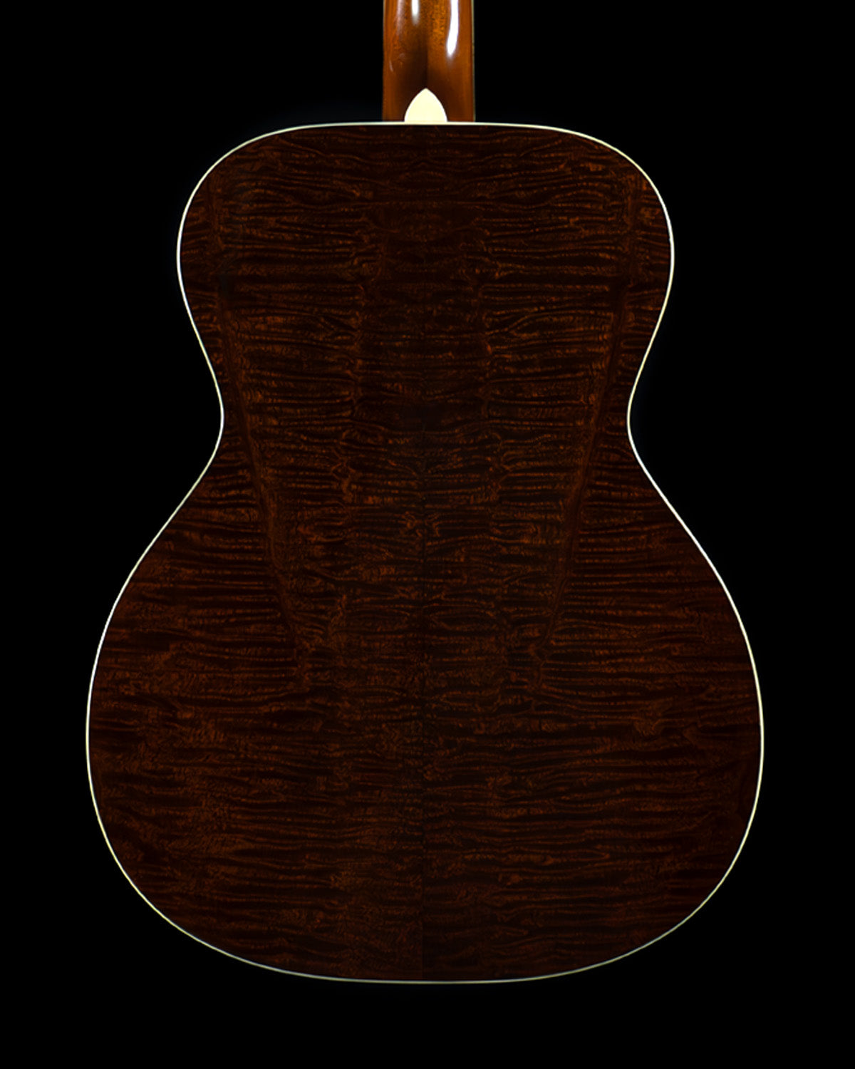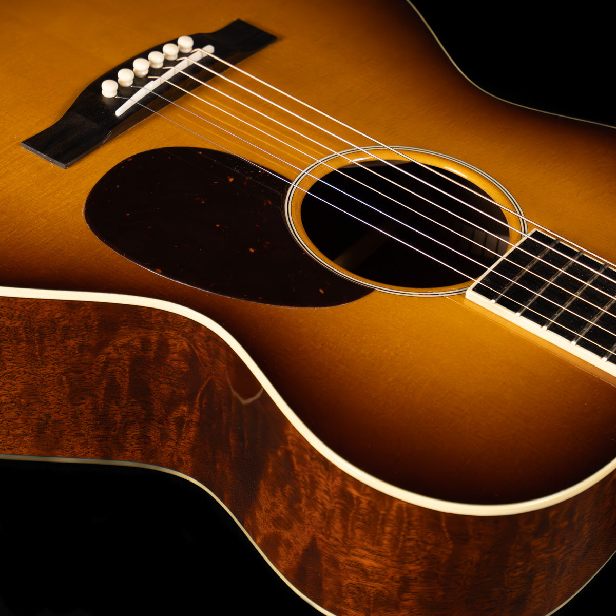 Here we have an Orchestra Model built way back in 2021.  Seems like a long time ago, doesn't it?  It's a classic and a class act, with a wonderfully rendered sunburst over Adirondack spruce, scalloped Adirondack bracing and hot hide glue holding the box together.  The visual overachiever here is absolutely the quilted sapele that adorns the back and sides, this stuff is out of this world!  It's bubbly, it's three dimensional, it's like if The Tree had a little sister.  Nice!  Other visuals include full head/neck/body binding, a handsome single-ring rosette, and dot inlays on the ebony fingerboard.