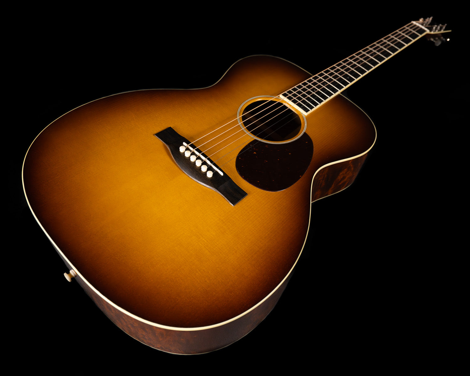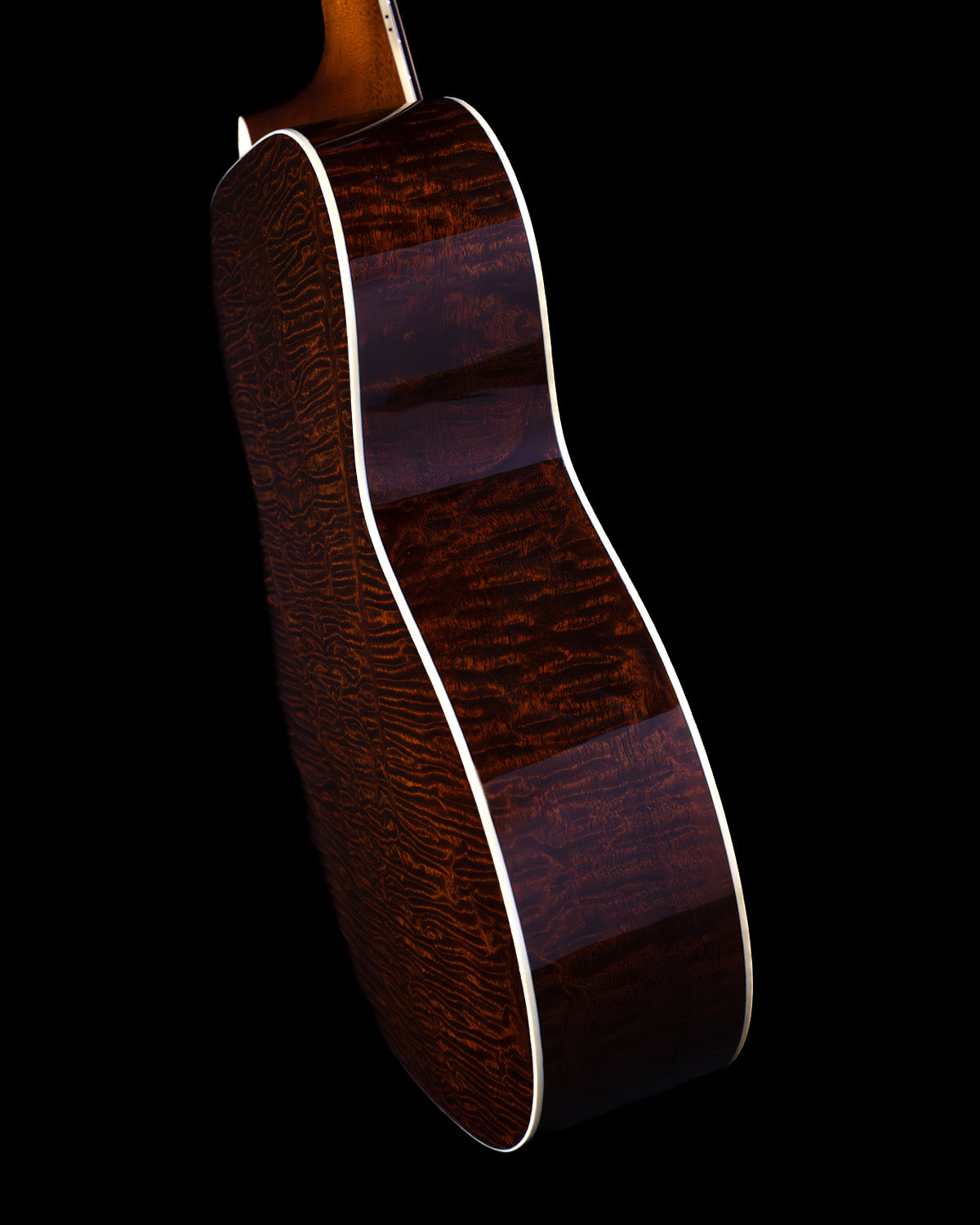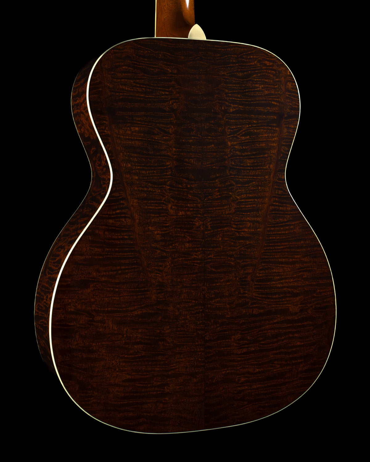 Here we have an Orchestra Model built way back in 2021.  Seems like a long time ago, doesn't it?  It's a classic and a class act, with a wonderfully rendered sunburst over Adirondack spruce, scalloped Adirondack bracing and hot hide glue holding the box together.  The visual overachiever here is absolutely the quilted sapele that adorns the back and sides, this stuff is out of this world!  It's bubbly, it's three dimensional, it's like if The Tree had a little sister.  Nice!  Other visuals include full head/neck/body binding, a handsome single-ring rosette, and dot inlays on the ebony fingerboard.