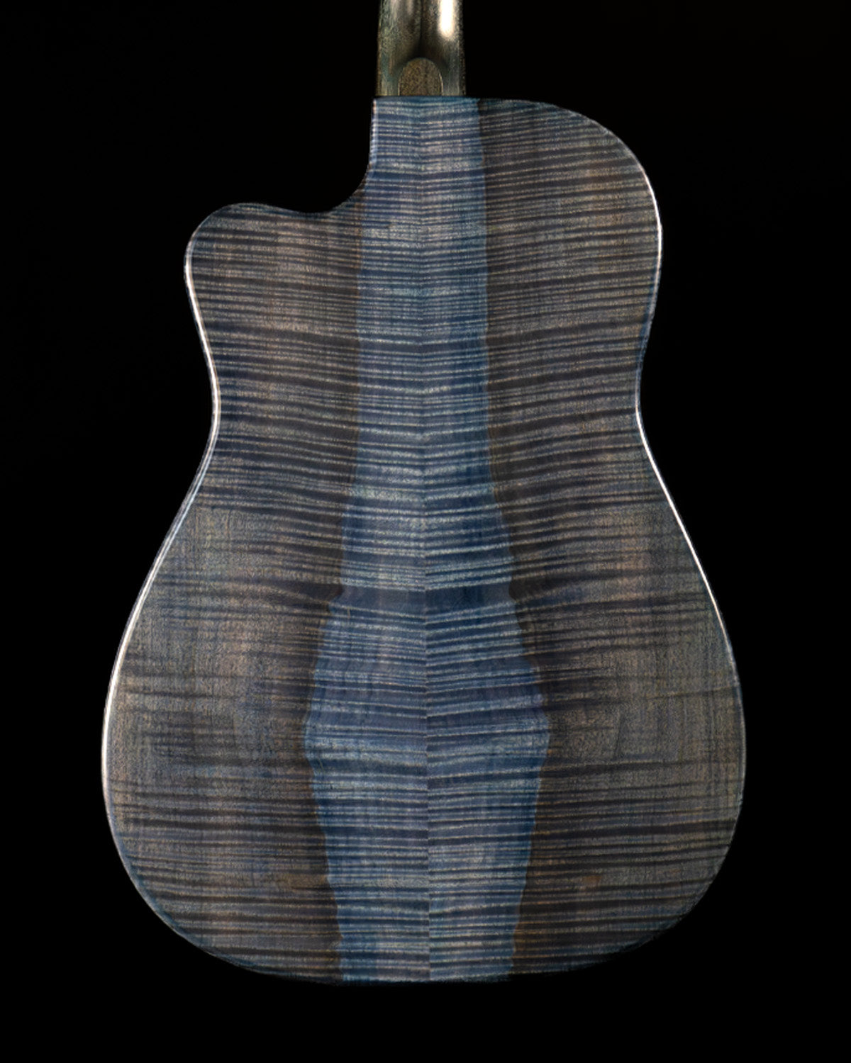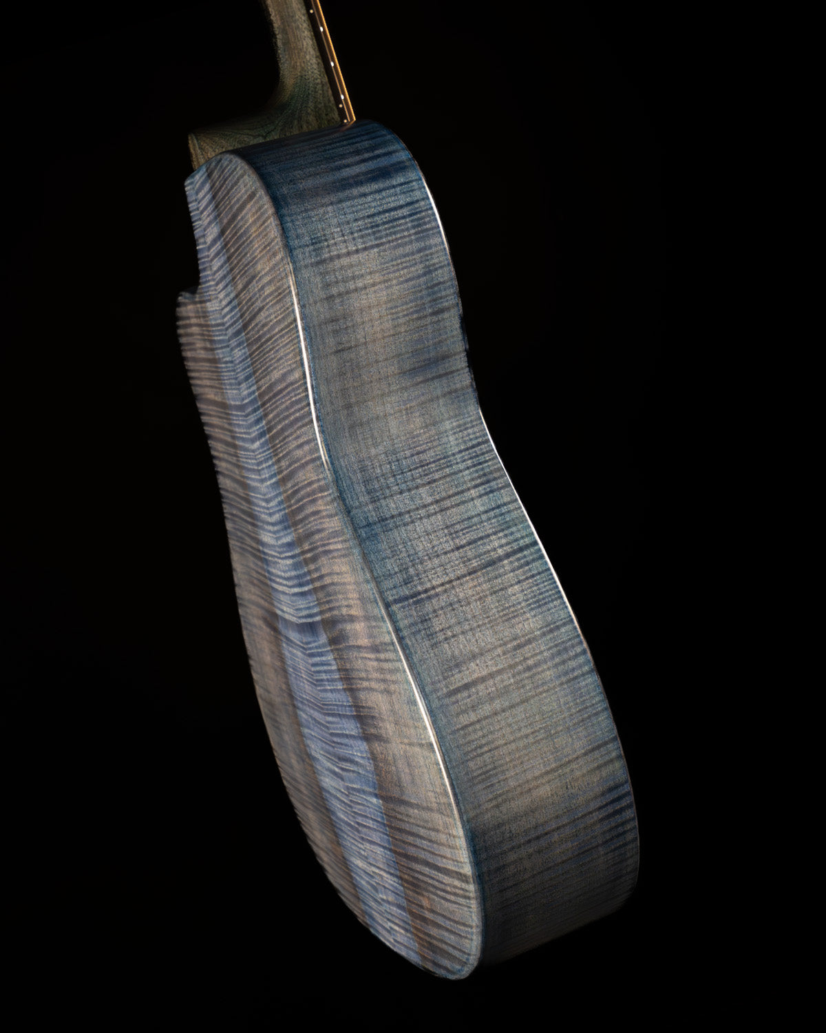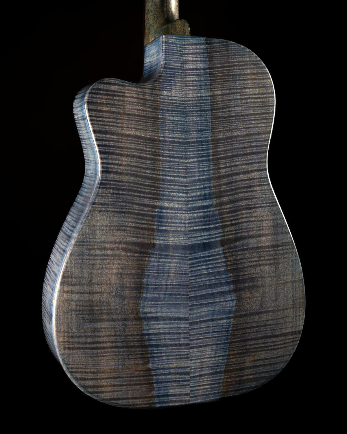 Model E body with denim blue finish over special figured solid maple.  This one has a cutaway for upper fret access.  Long 25.4" scale with 1 3/4" nut and 2 1/4" string spacing at the saddle.  The neck is a modified low oval shape, this one measures .915" thick at the first fret and .961" at the ninth.  Ebony fingerboard with maple diamond inlays.  The cover plate is antiqued and has the Celtic Knot pattern.  Tuners are black Gotoh 510s.  Fit with the Fishman Nashville pickup system, compatible with the Aura pedal (not included).  Includes hard case.