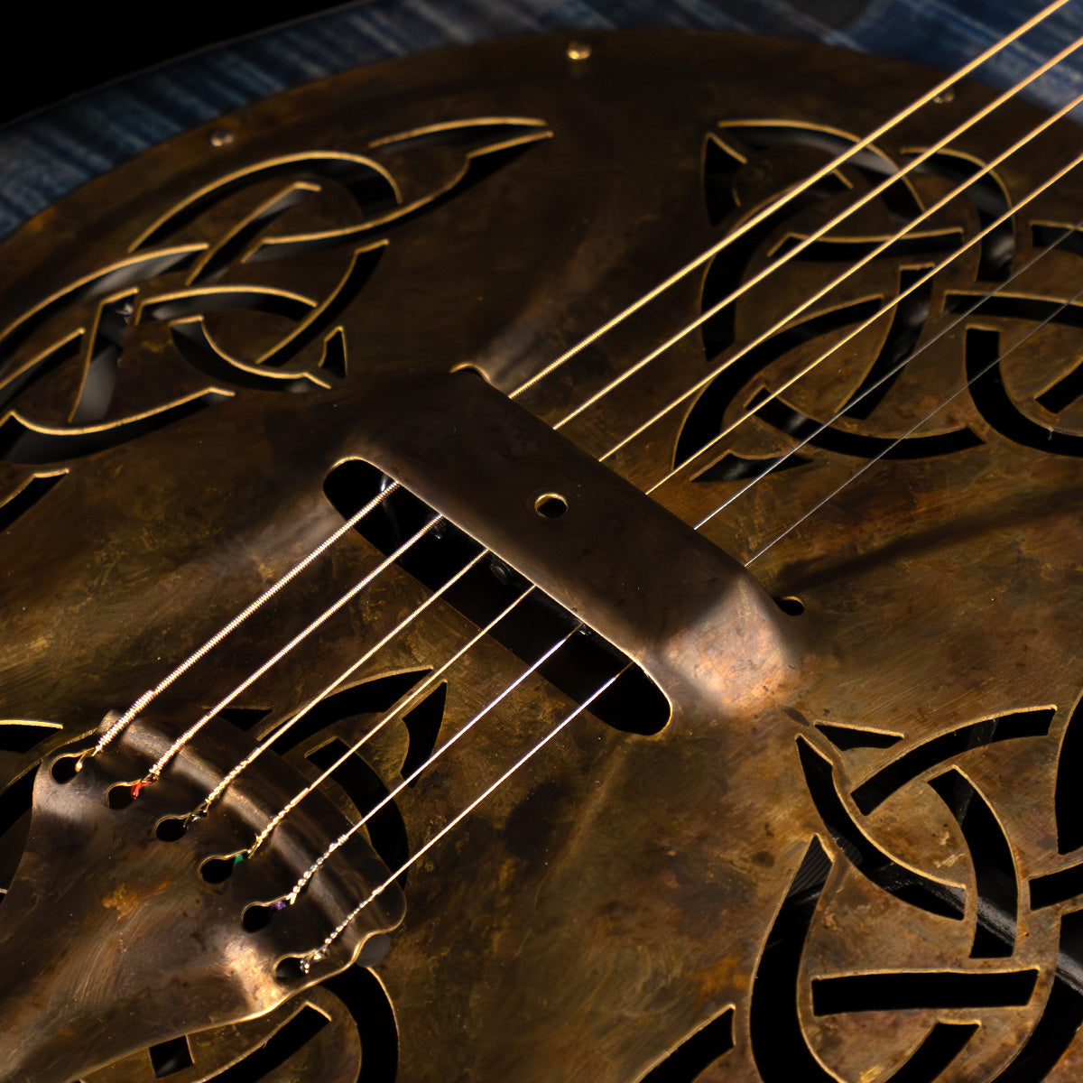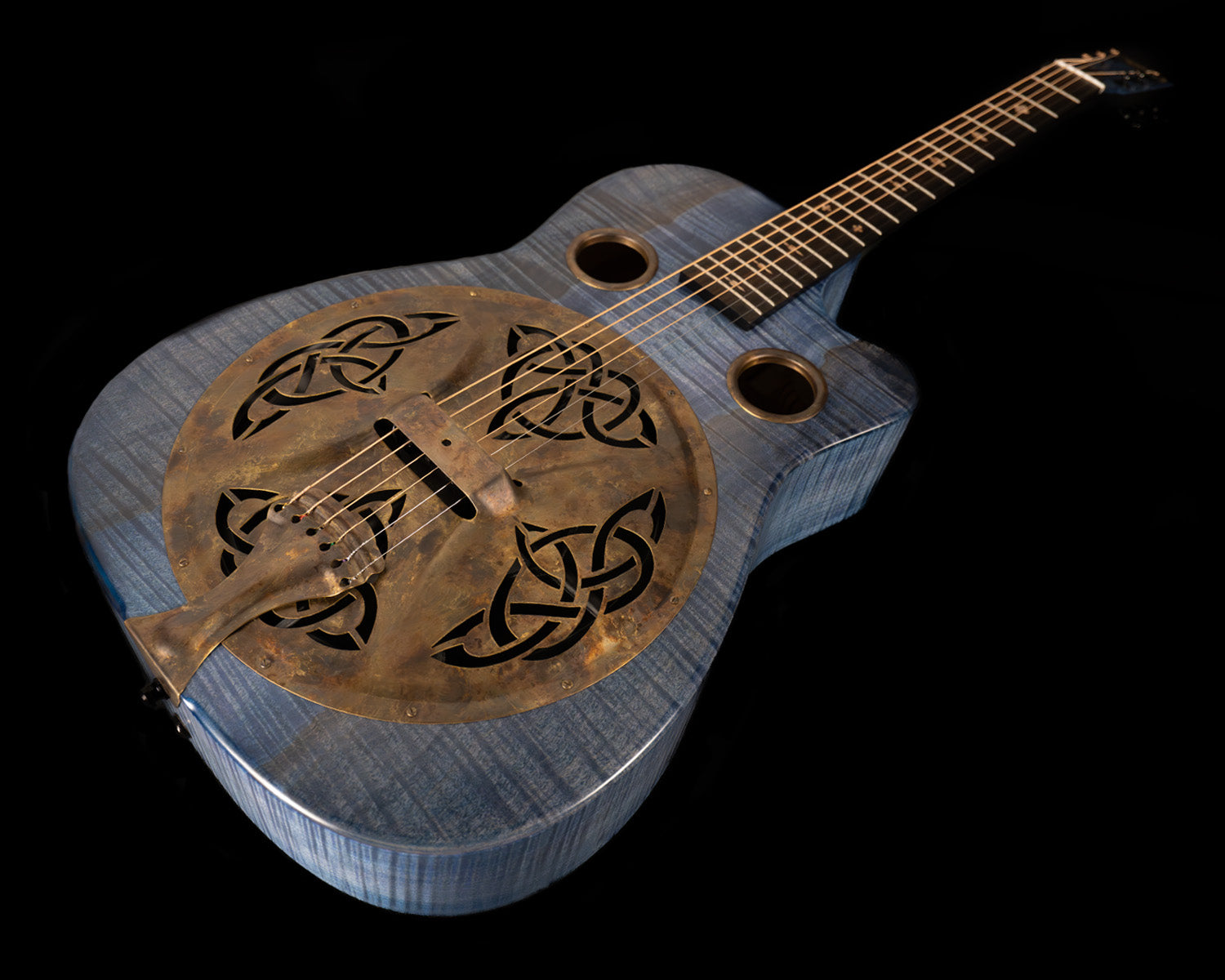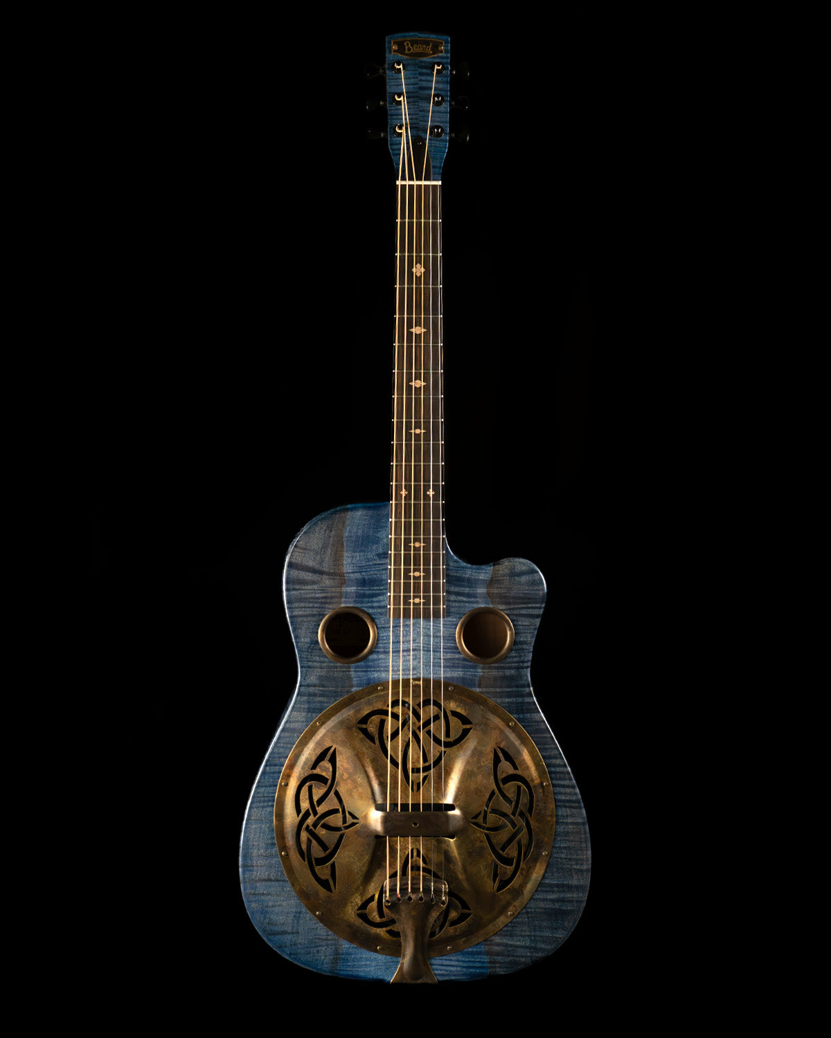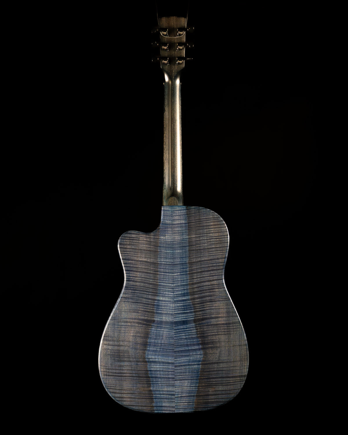 Model E body with denim blue finish over special figured solid maple.  This one has a cutaway for upper fret access.  Long 25.4" scale with 1 3/4" nut and 2 1/4" string spacing at the saddle.  The neck is a modified low oval shape, this one measures .915" thick at the first fret and .961" at the ninth.  Ebony fingerboard with maple diamond inlays.  The cover plate is antiqued and has the Celtic Knot pattern.  Tuners are black Gotoh 510s.  Fit with the Fishman Nashville pickup system, compatible with the Aura pedal (not included).  Includes hard case.