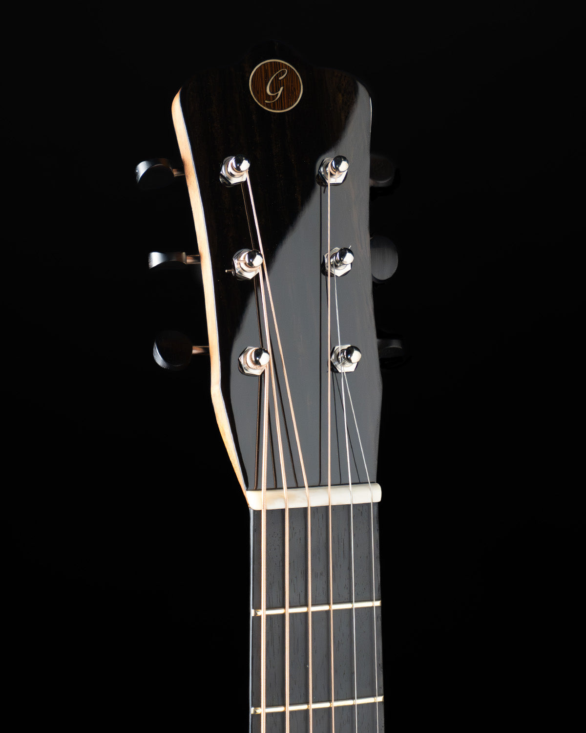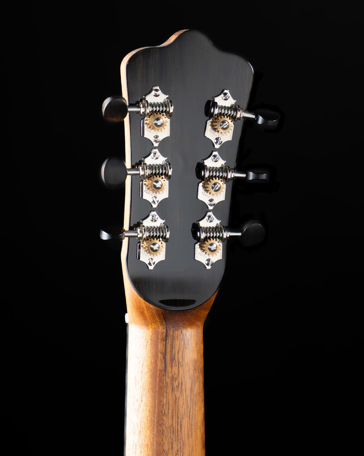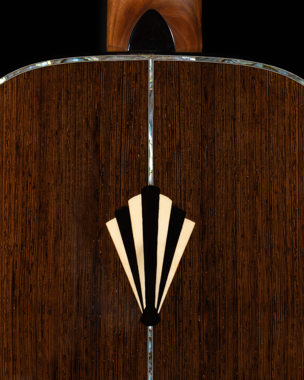 It starts with a responsive Engelmann spruce top, with solid Wenge back and laminated Wenge sides with a maple core. Laminated sides are finding a lot of popularity with small shop builders who want to create a very rigid side structure to encourage maximum top vibration, and we're here to tell you that it's working wonders on this little beauty! This guitar has Art Deco-inspired cosmetics, including fan-shaped inlays on the back and at the end wedge, and the combination of thin abalone purfling and the Wenge rosette details makes this a real looker. Ebony body binding and blind-bound ebony fingerboard.