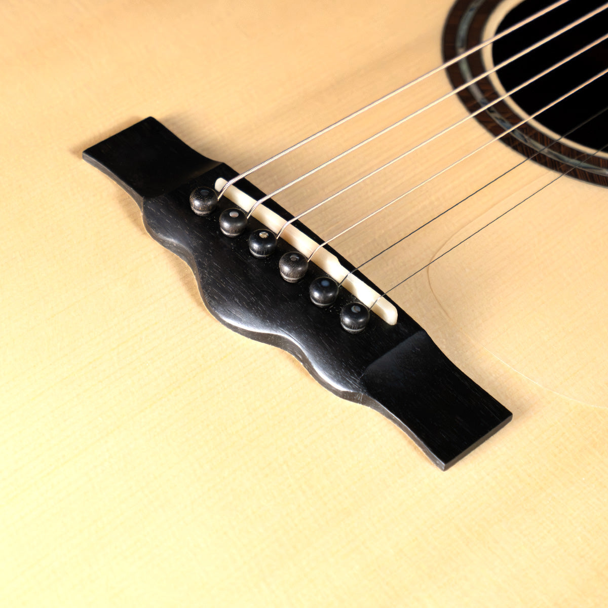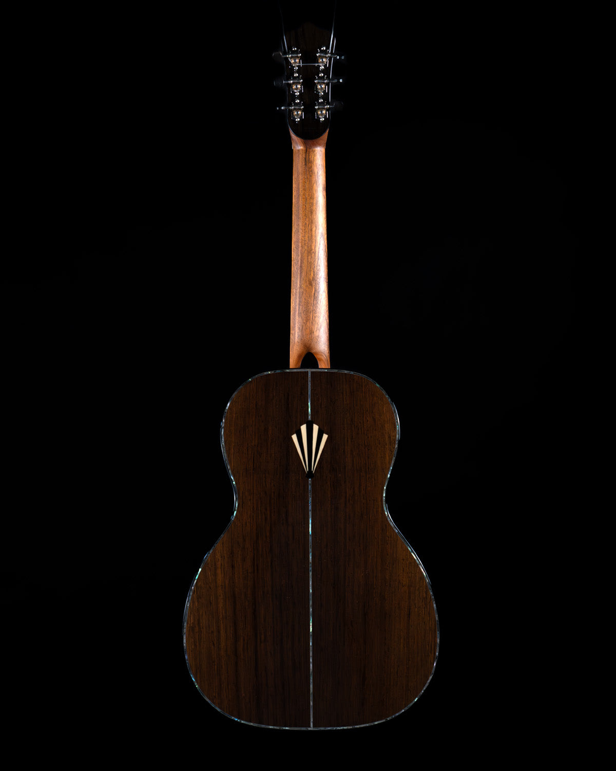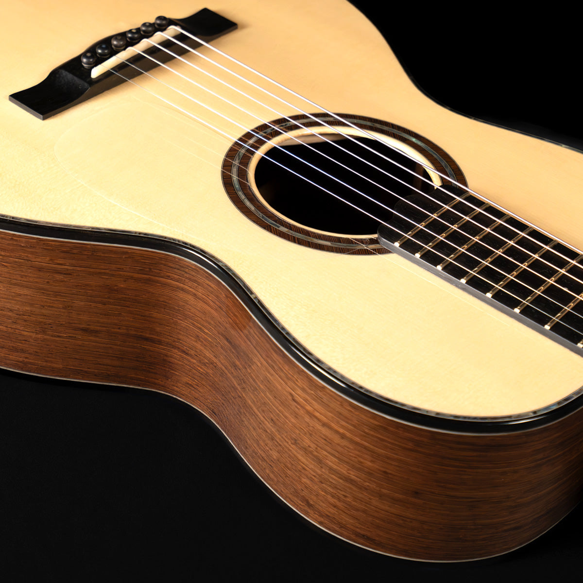 It starts with a responsive Engelmann spruce top, with solid Wenge back and laminated Wenge sides with a maple core. Laminated sides are finding a lot of popularity with small shop builders who want to create a very rigid side structure to encourage maximum top vibration, and we're here to tell you that it's working wonders on this little beauty! This guitar has Art Deco-inspired cosmetics, including fan-shaped inlays on the back and at the end wedge, and the combination of thin abalone purfling and the Wenge rosette details makes this a real looker. Ebony body binding and blind-bound ebony fingerboard.