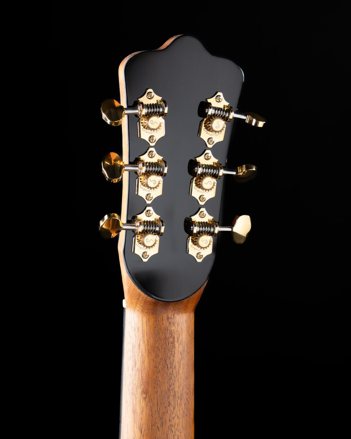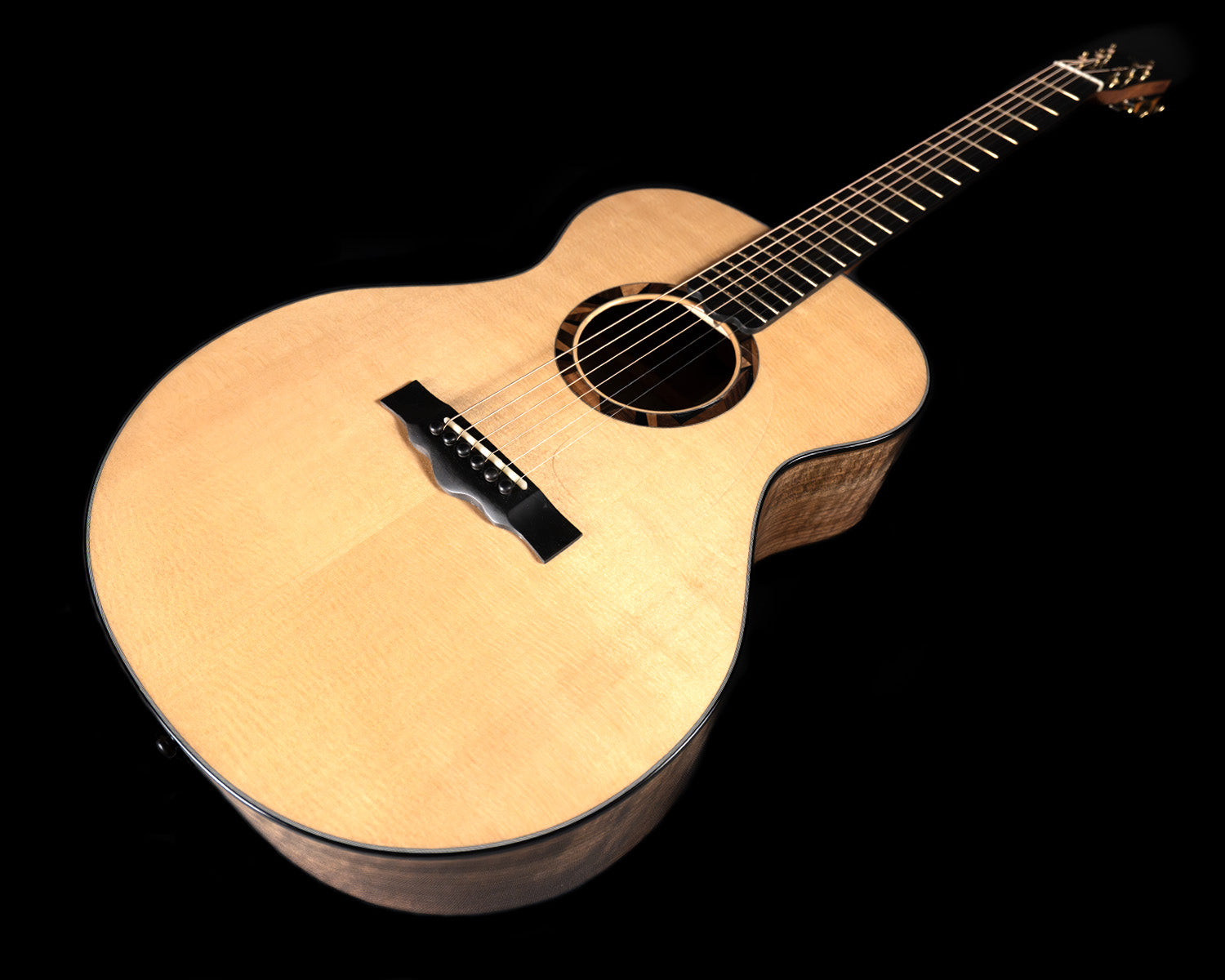 This Small Jumbo model features a beautiful Sitka spruce top, allowed to vibrate very actively thanks to the rigidity of the laminated side structure. The back is solid walnut, which has a similar fundamental to mahogany but in this case a notable increase in sustain. The instrument has a satisfying low end rumble but still plenty of balance and high clarity in the trebles. At 15 3/8" across the lower bout, it splits the difference between an OM and a jumbo, and it has Manzer wedge body construction, shallower on the bass side and deeper on the treble, for comfort without affecting the voice. Appointments include mosaic rosette and mosaic end wedge details. Wood body binding with blind bound ebony fingerboard. Gold fret wire and gold Schaller Grandtune tuners.