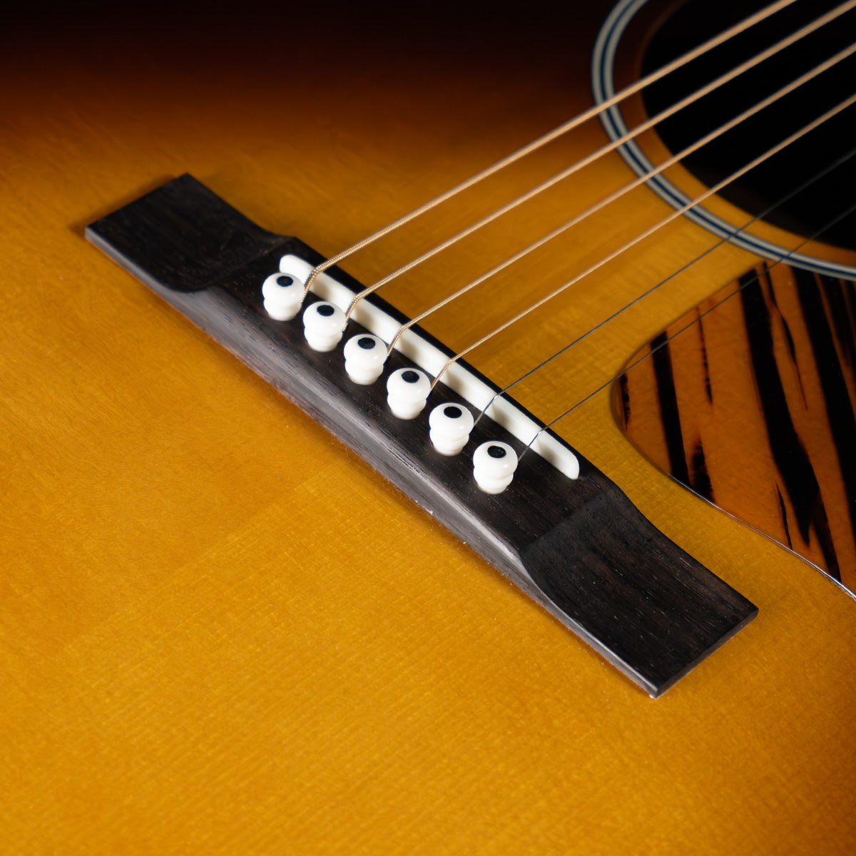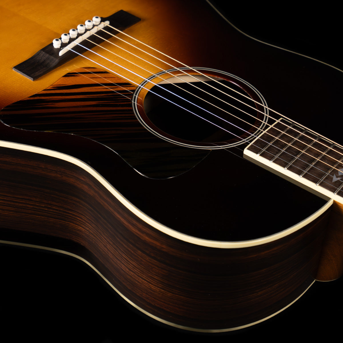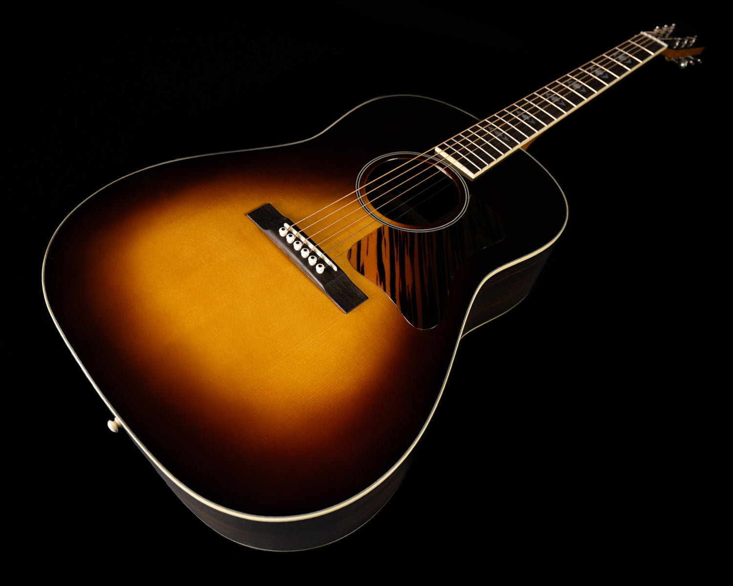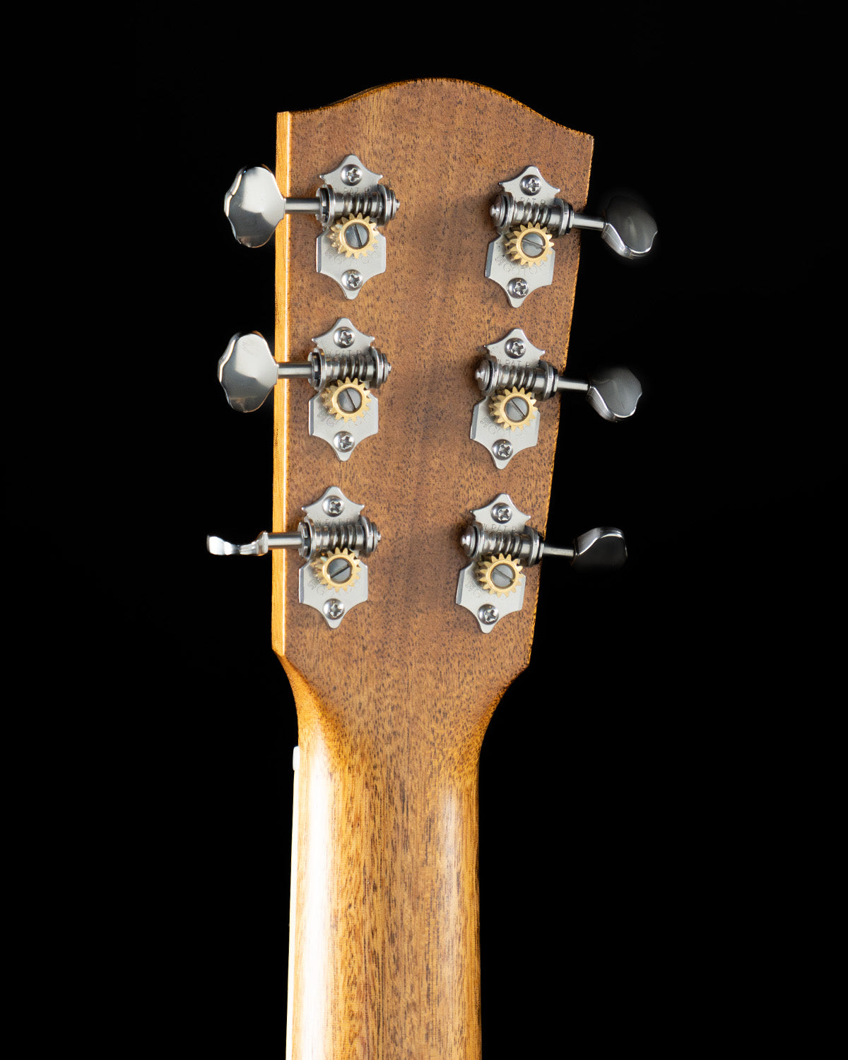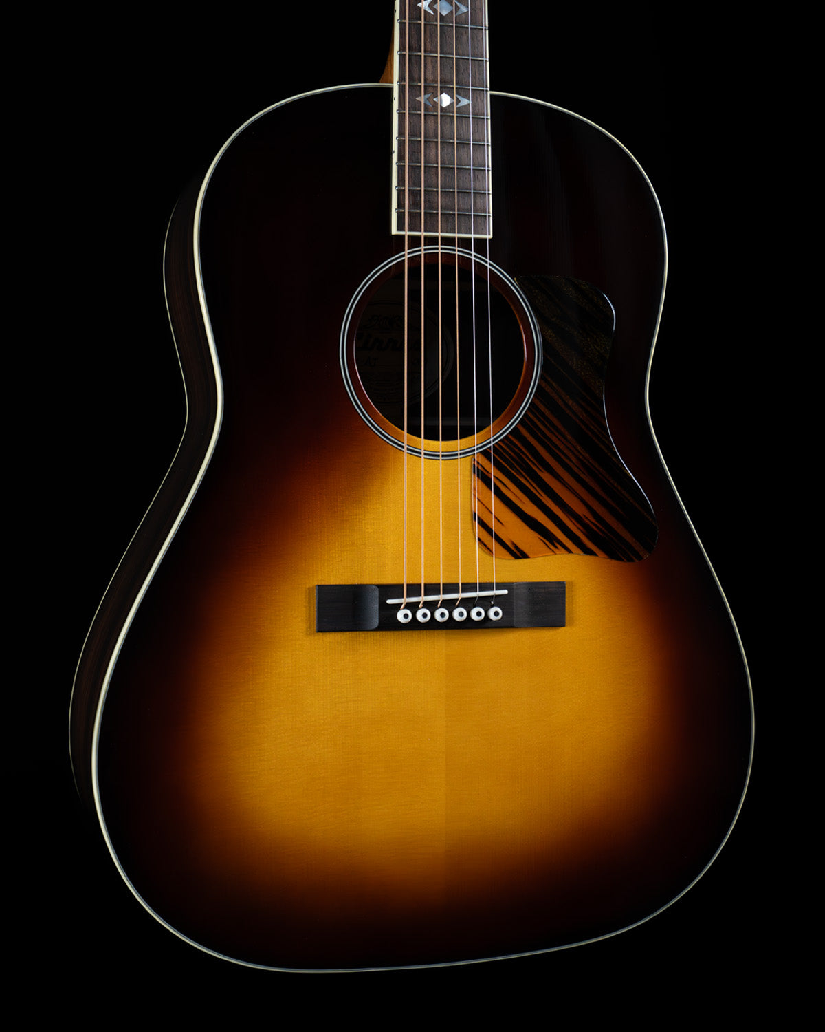 The appointments are traditional to Gibson AJs with arrow inlays on the rosewood fingerboard, fire stripe pickguard, single ring rosette and arrow flourish on the peghead. The tuners are open-gear Gotoh, and a hard case is included.