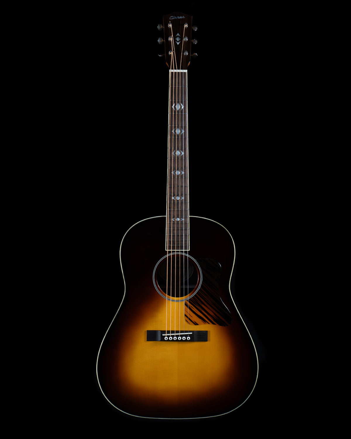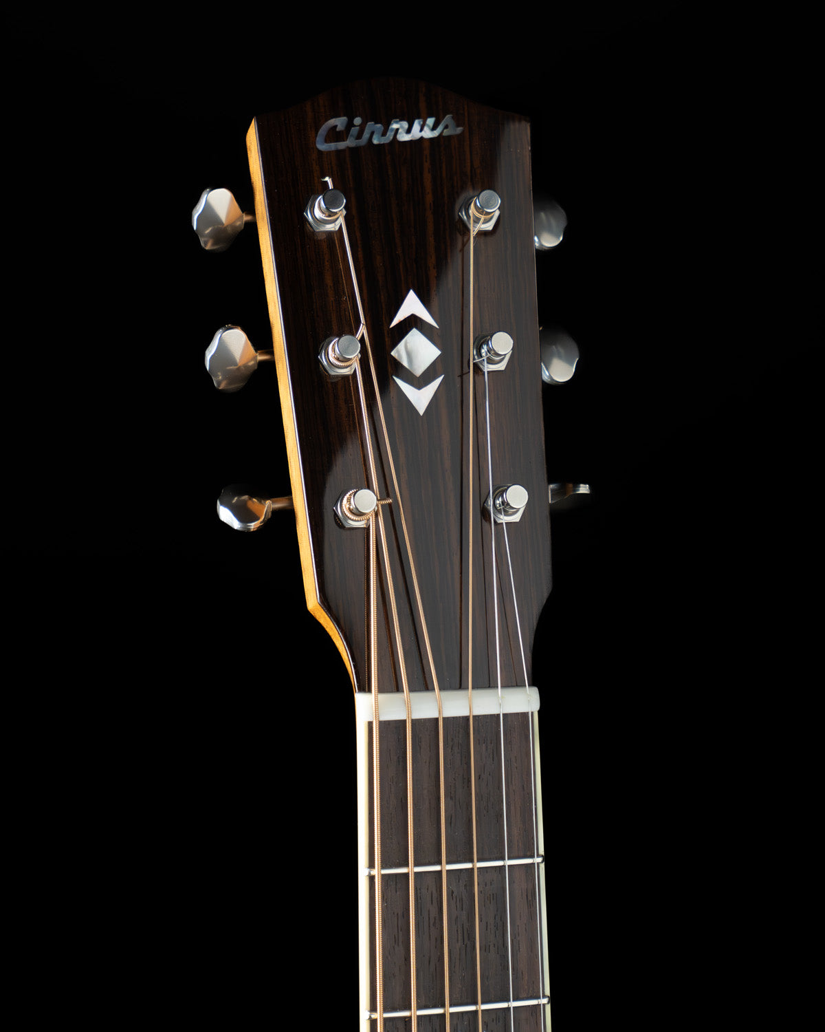 (NEW) Here is our first Advanced Jumbo from Cirrus, which takes the familiar curved shoulders of the ubiquitous Gibby slope D and pairs them with long scale and a rosewood back/sides. This creates additional volume and horsepower, vs the short scale mahogany variant, and these are known as "Bone Crushers" for having the juice to outperform a Martin-style dread in flatpicking scenarios.