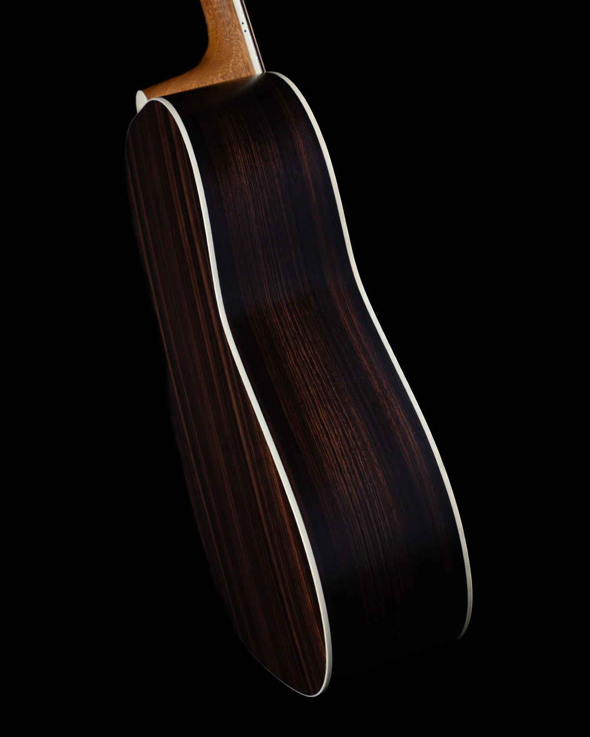 This one has Adirondack spruce for the top and braces, a gloss top on a beautifully rendered sunburst. The back and sides are Indian rosewood with an open-pore finish, and the neck is mahogany. The nut width is 1 3/4" and the string spacing at the saddle is 2 3/16". The neck has a low C shape that measures .899" at the first fret and .995" at the ninth.