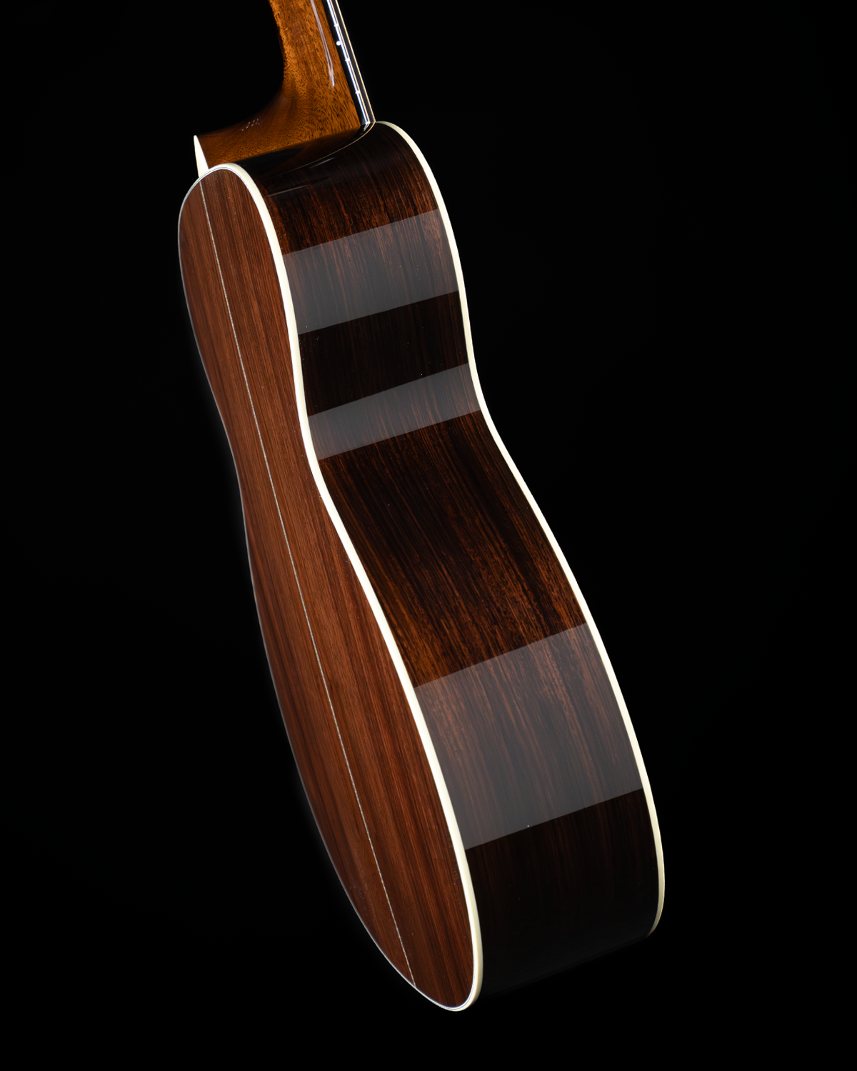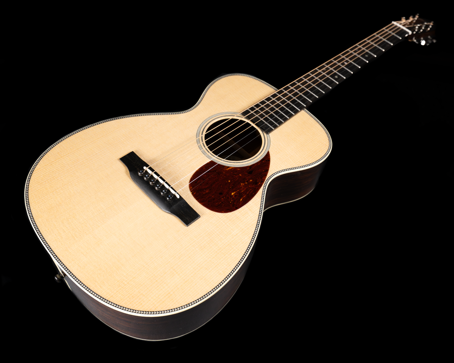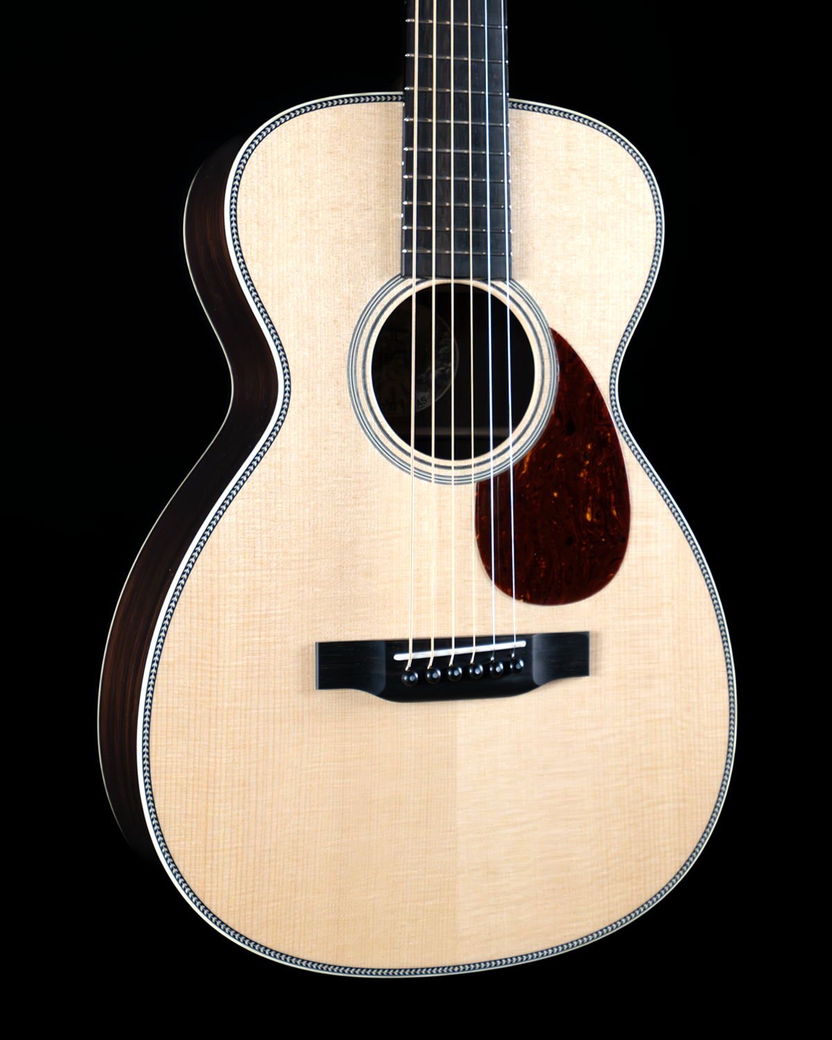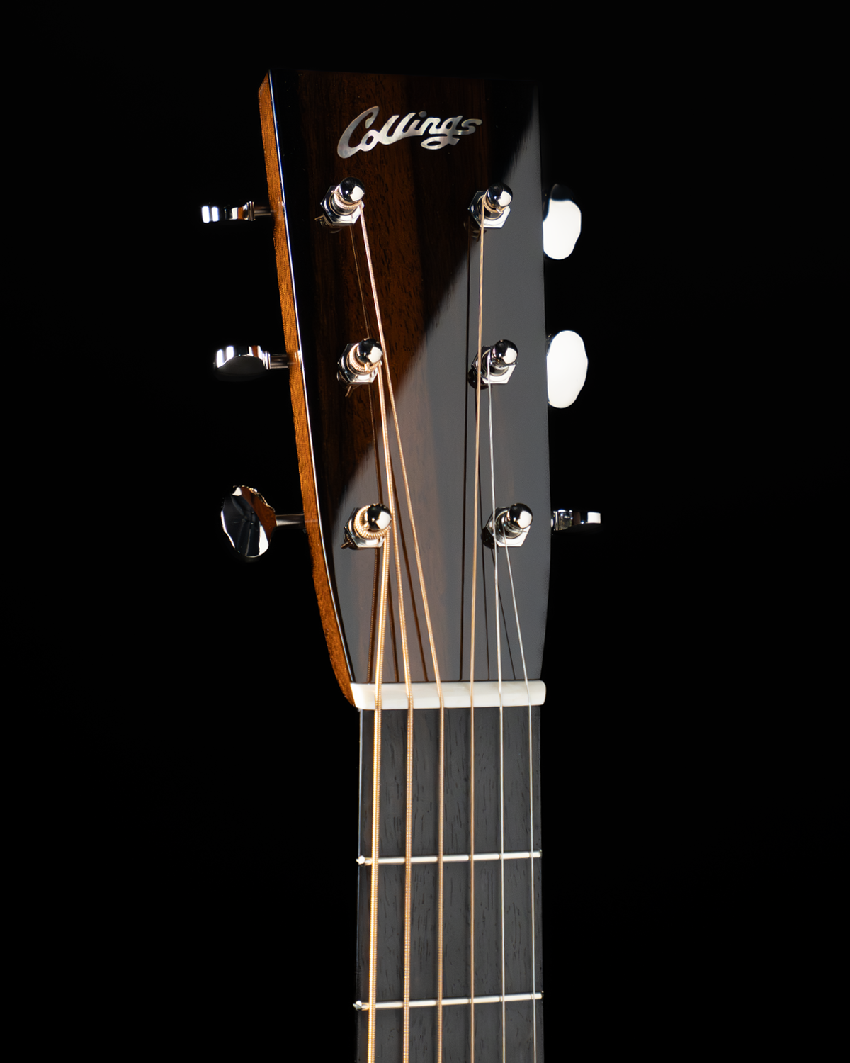 This one is a baseline Baby all the way, with Sitka spruce top, Indian rosewood back and sides, mahogany neck with Collings' original mod V profile. 1 11/16" nut, 2 3/16" string spacing at the saddle, short 24 1/8" scale length. Style 2 appointments include ivoroid body binding, herringbone top trim and zipper back strip. Nickel Waverly tuners complete the package.