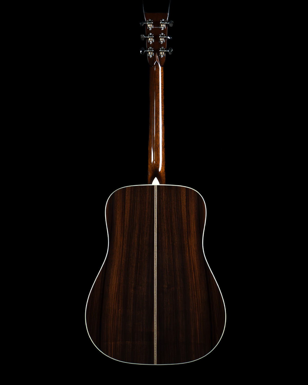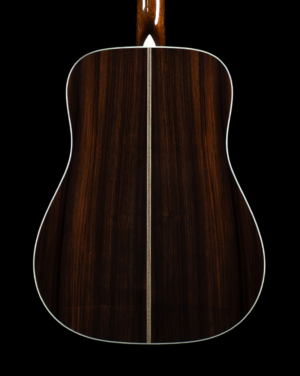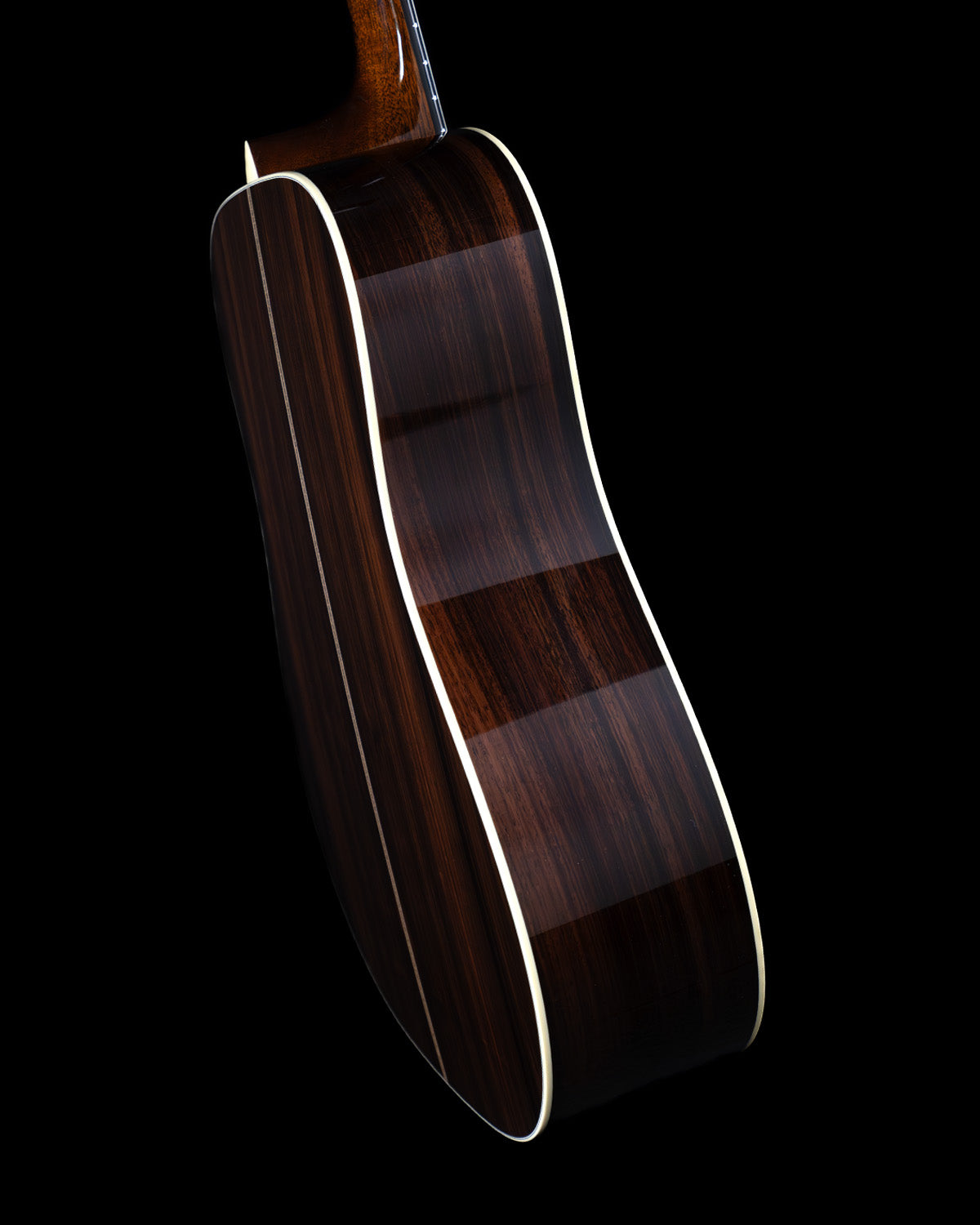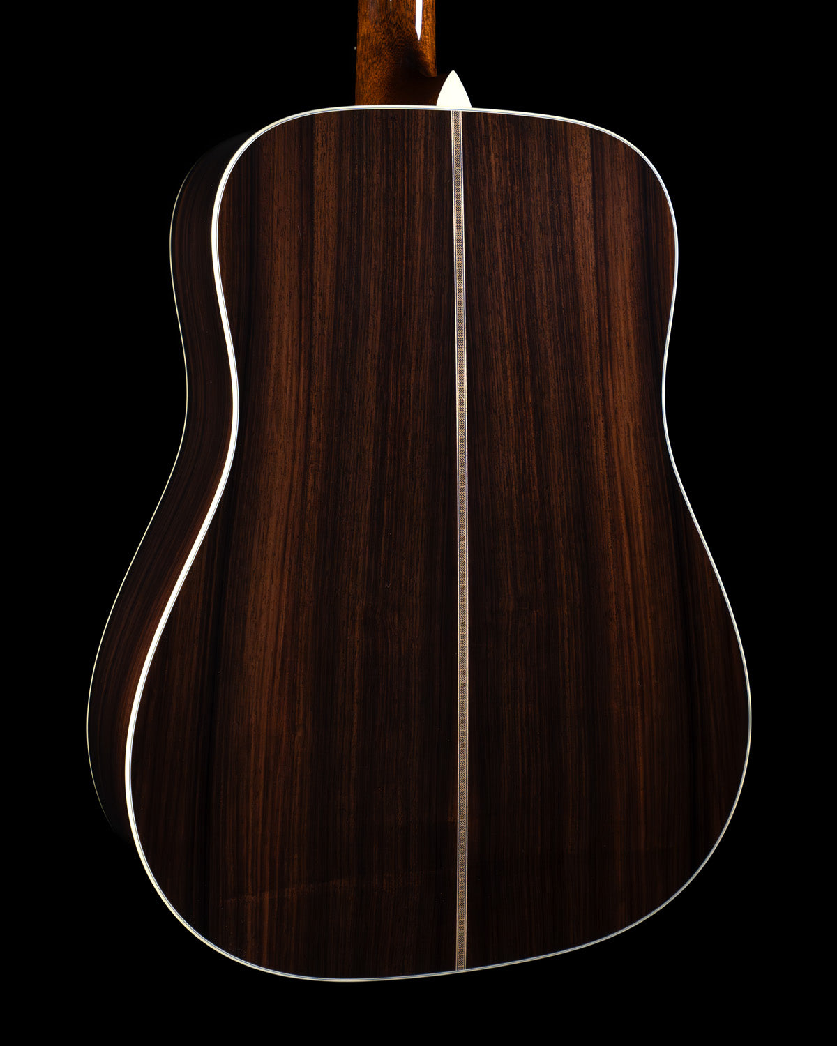 Baseline specs include Sitka spruce top and braces, Indian rosewood back and sides, mahogany neck with original mod V neck profile, 1 11/16" nut, 2 3/16" string spacing at the saddle and long 25 1/2" scale length. Traditionally inspired rosewood dread appointments include herringbone top trim, ivoroid body binding and zipper back strip. Tuners are nickel Waverly.