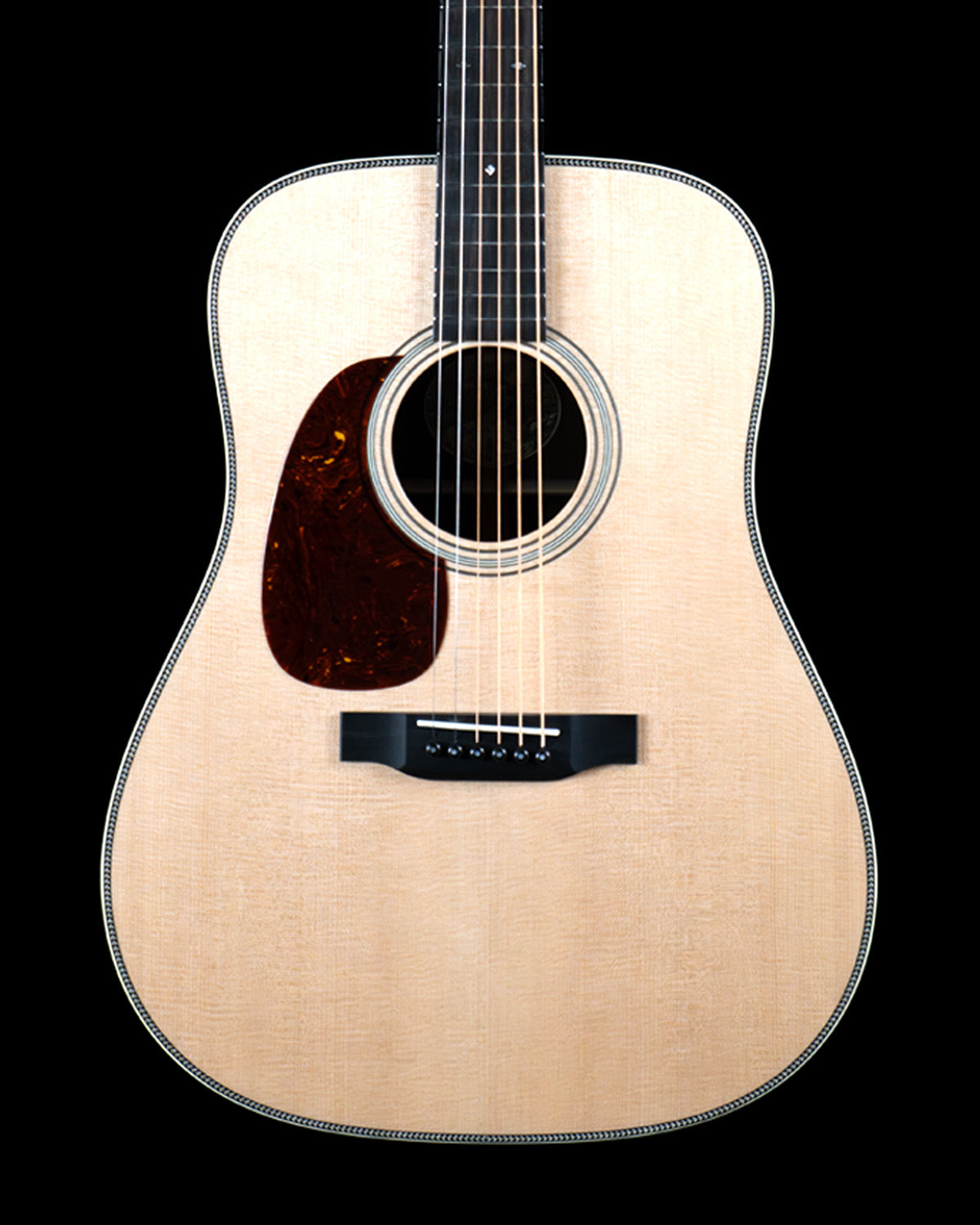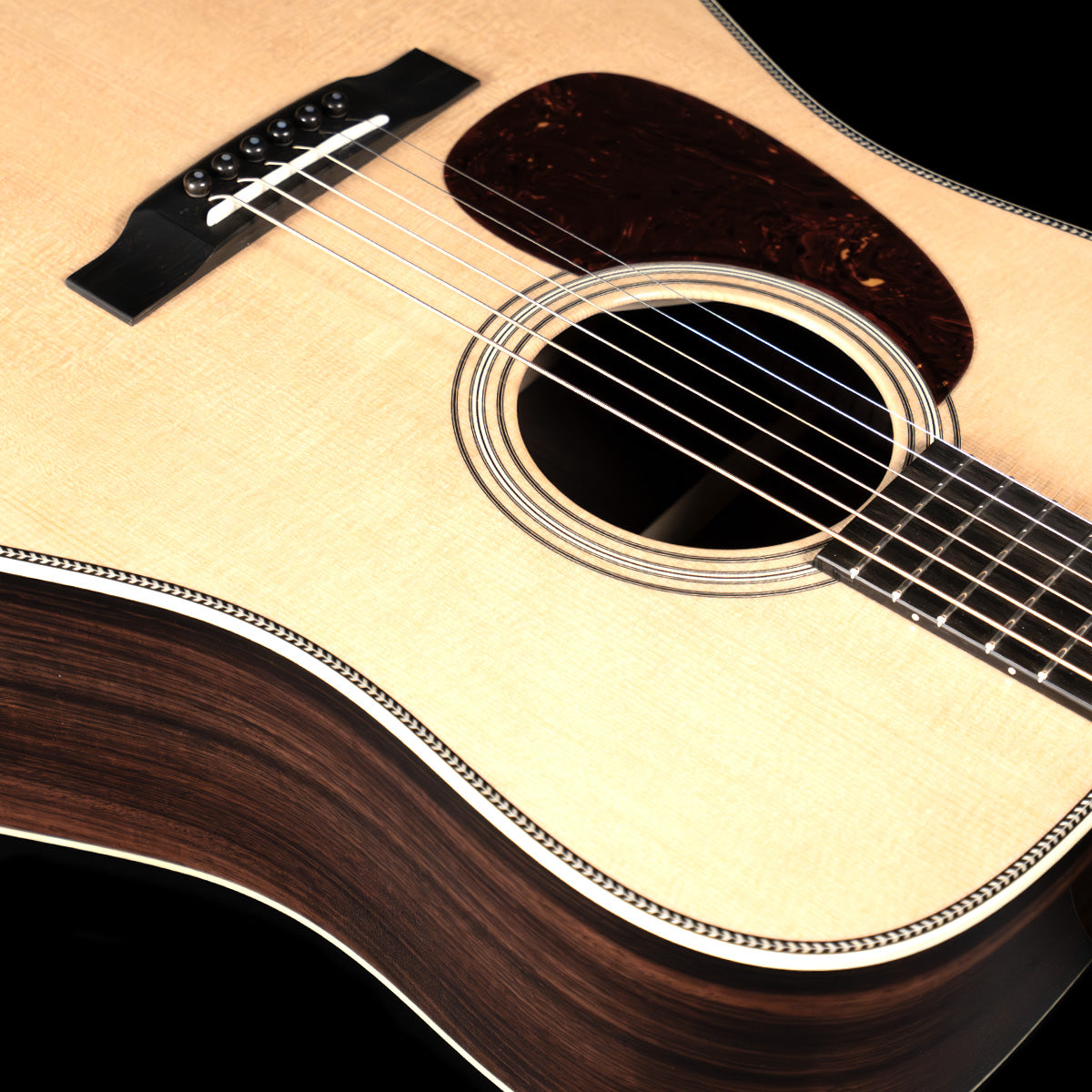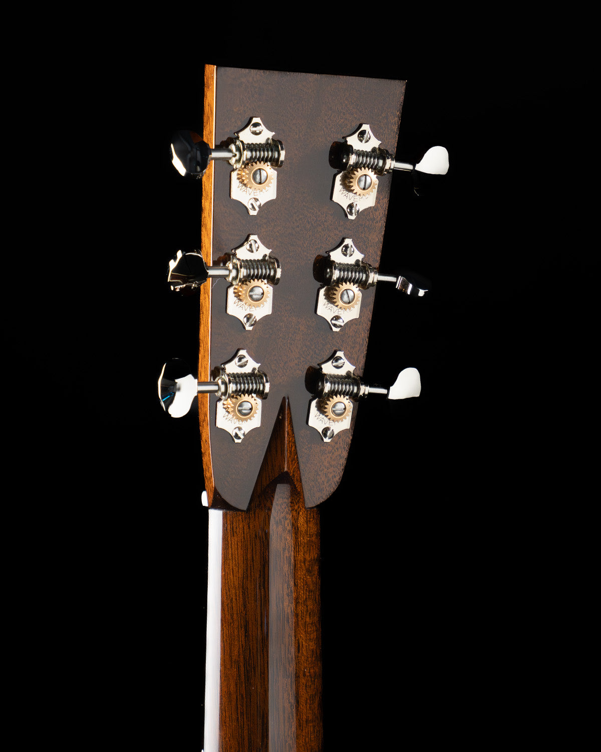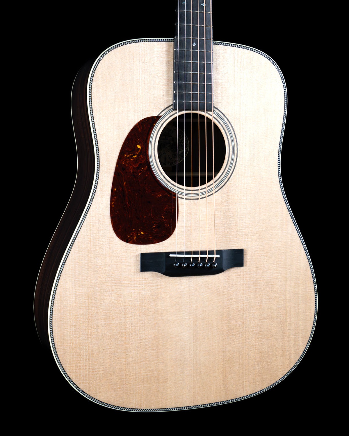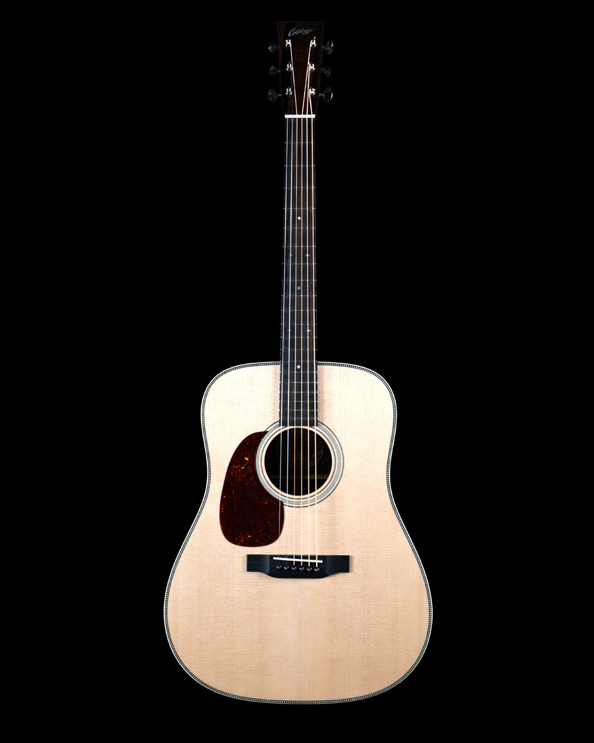 Baseline specs include Sitka spruce top and braces, Indian rosewood back and sides, mahogany neck with original mod V neck profile, 1 11/16" nut, 2 3/16" string spacing at the saddle and long 25 1/2" scale length. Traditionally inspired rosewood dread appointments include herringbone top trim, ivoroid body binding and zipper back strip. Tuners are nickel Waverly.