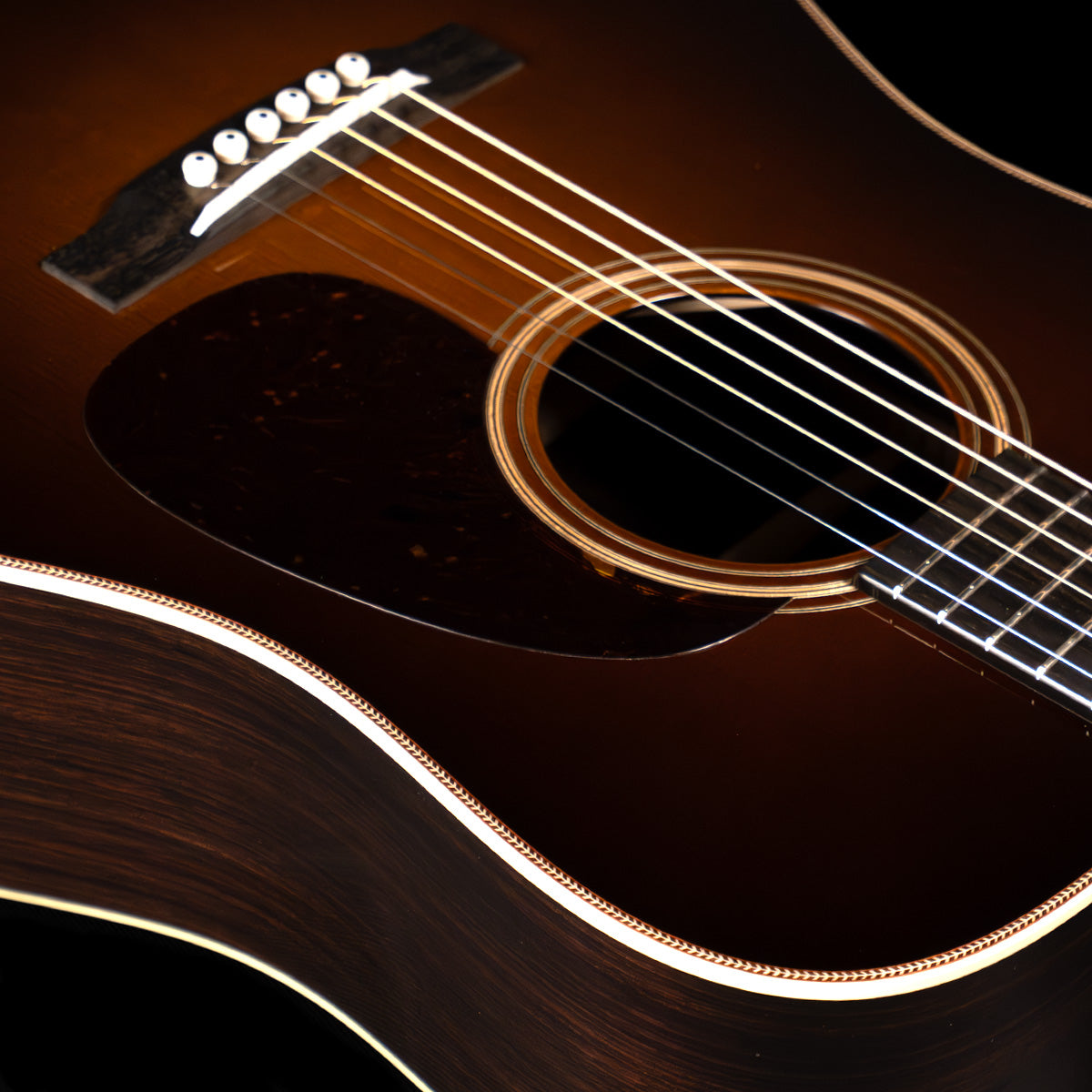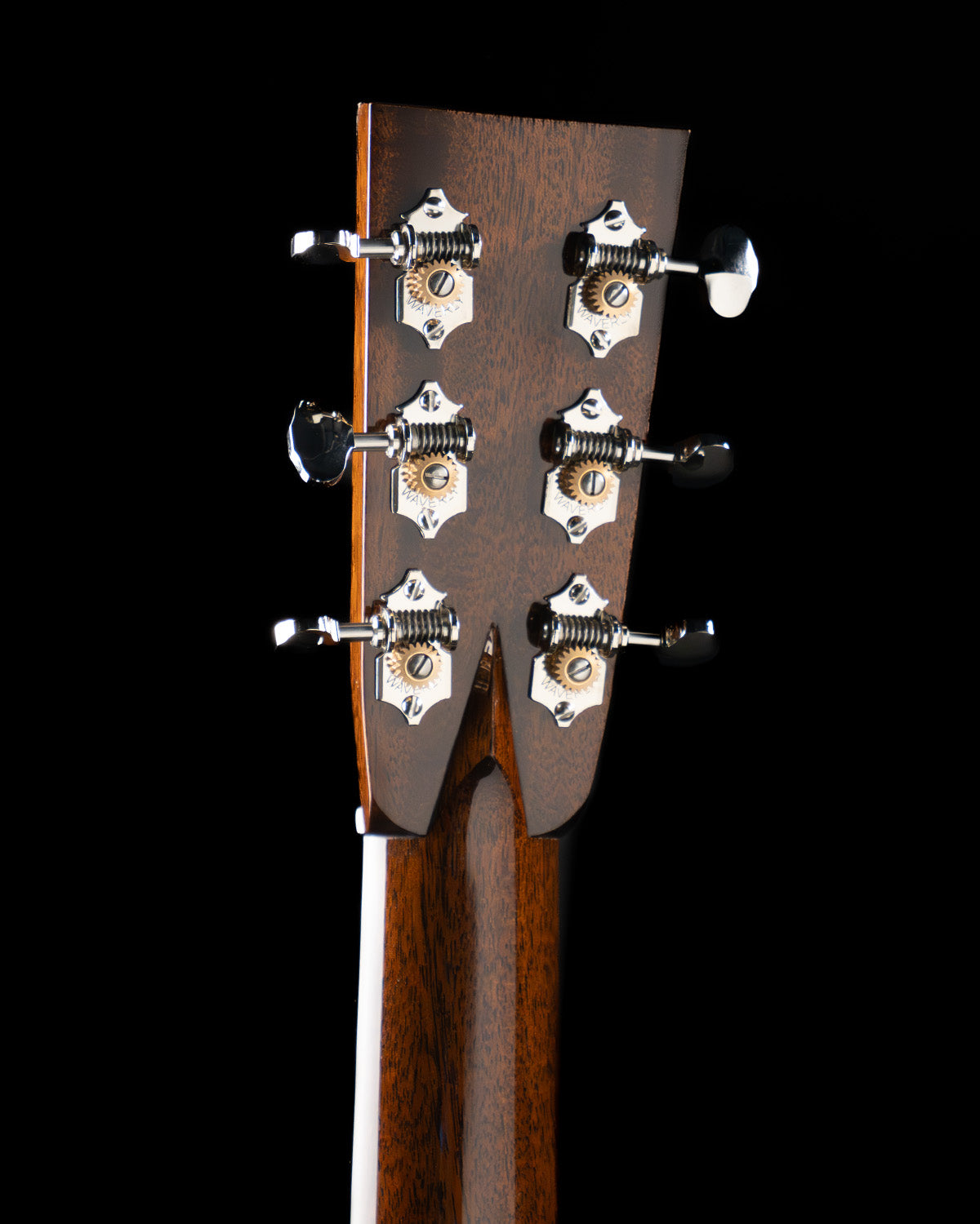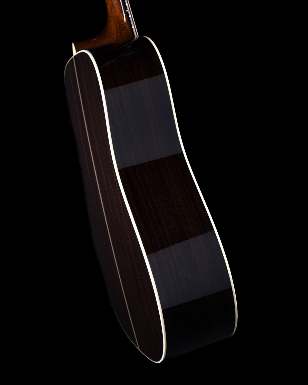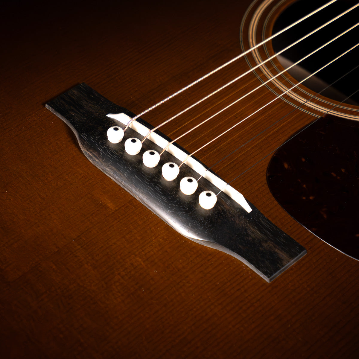 How do the Traditionals differ from the standard lineup? They have their own ever-so-slightly beefier neck profile, rolled fingerboard edges for comfort, forward-shifted scalloped Sitka braces with no tongue brace, small maple bridge plate and a pure nitro finish. 1 3/4" nut, 2 5/16" string spacing at the cut-through saddle, herringbone top trim (Traditional variant) and Waverly tuners complete the package.