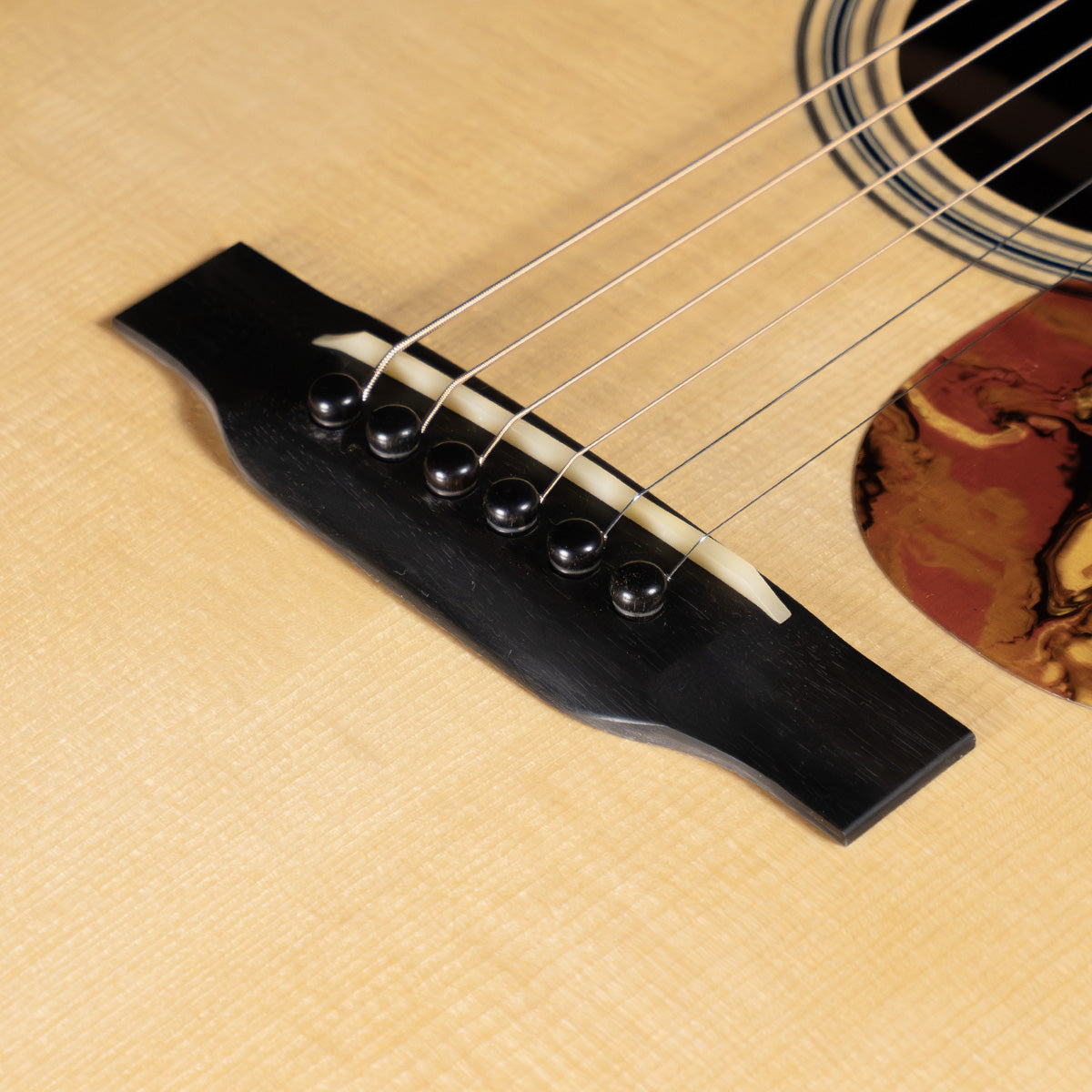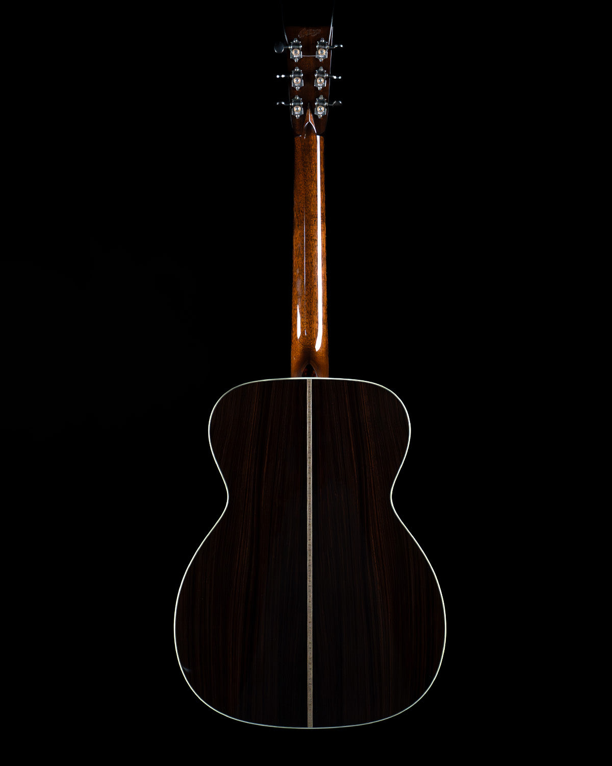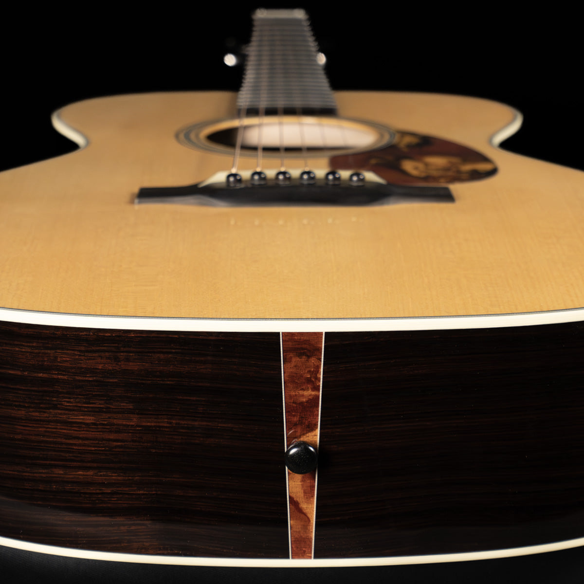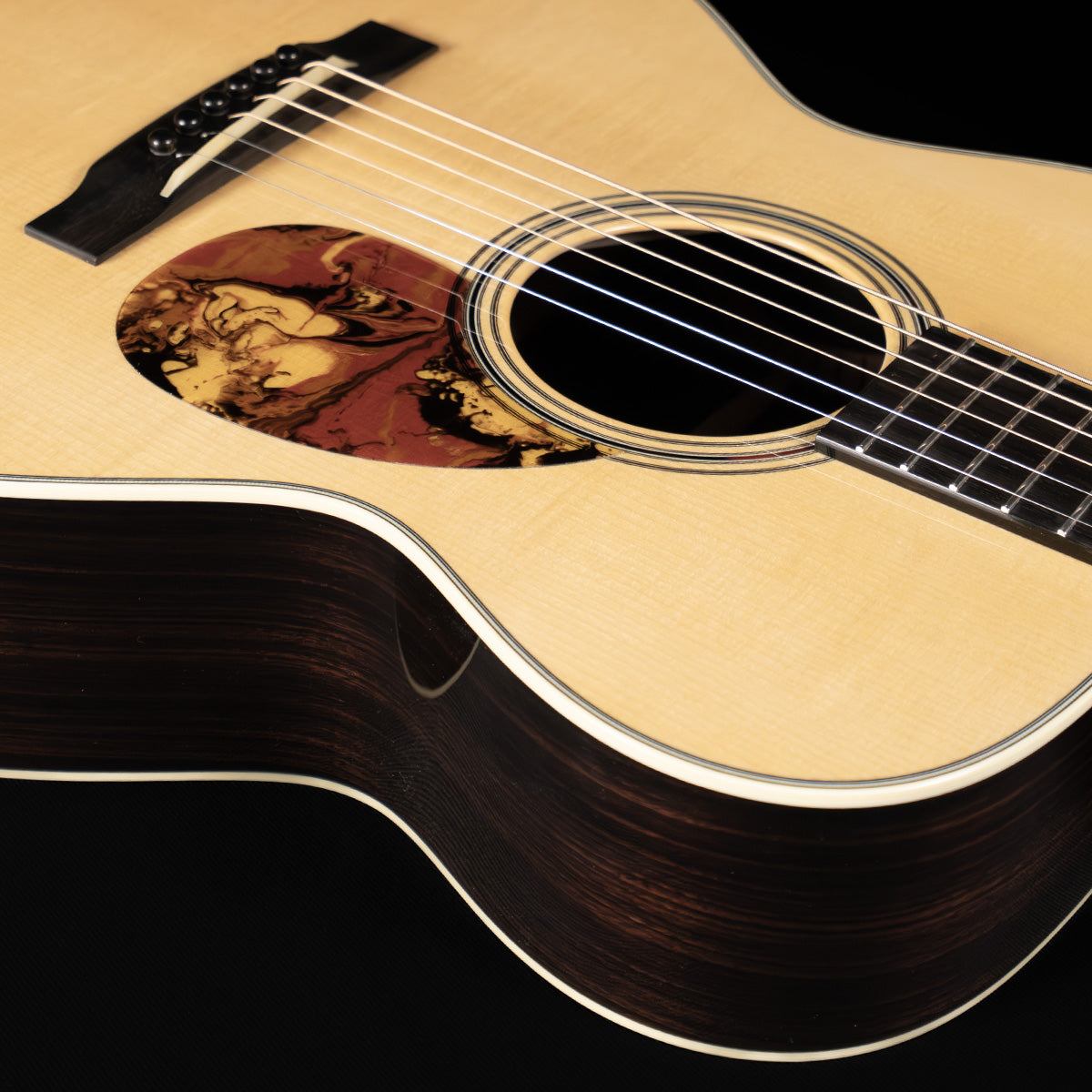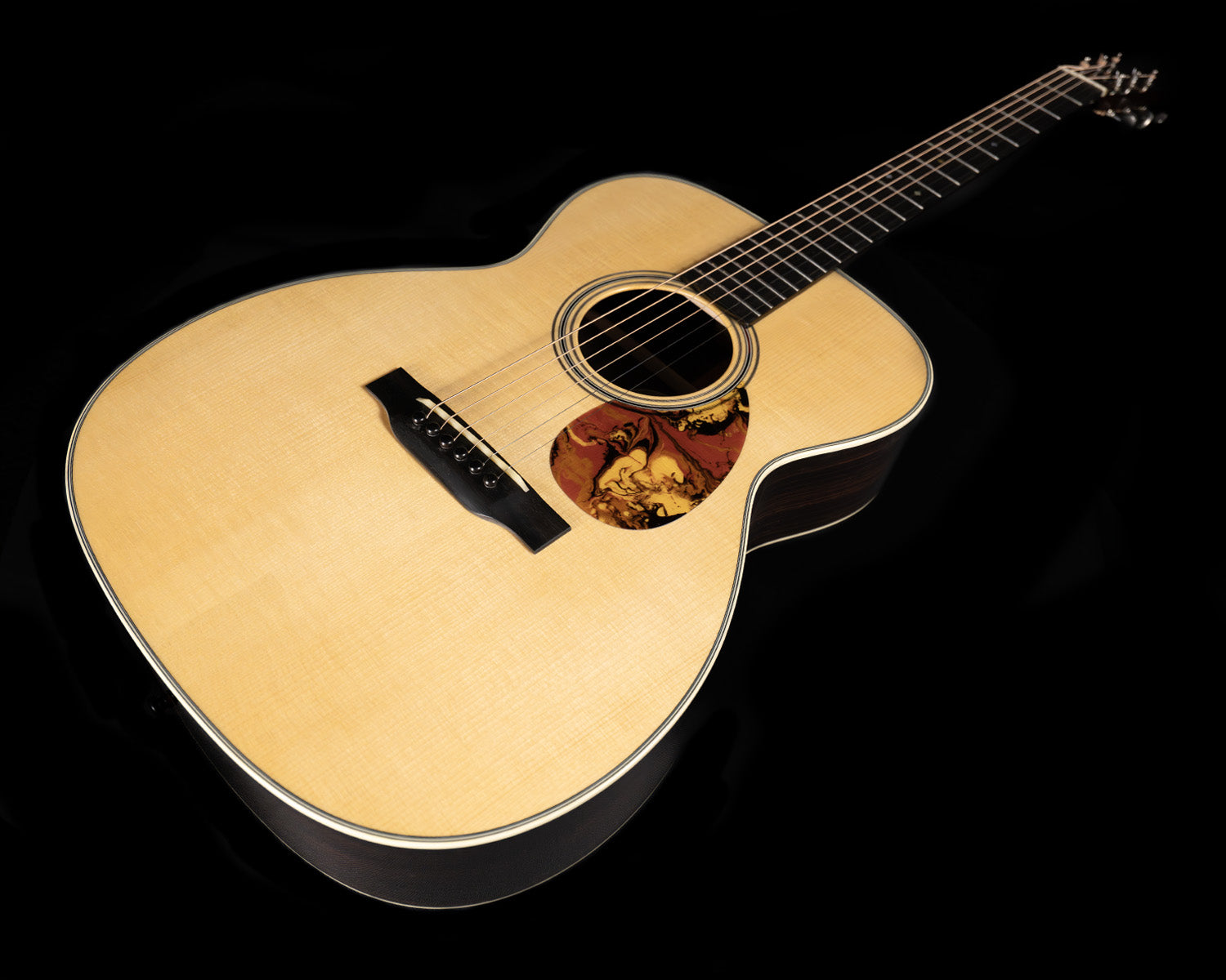 This OM has the standard Adirondack spruce top, Indian rosewood back/sides, and a high gloss finish. Like every other HC guitar, it has a hand-poured pick guard that matches accents in the rosette and the heel cap.