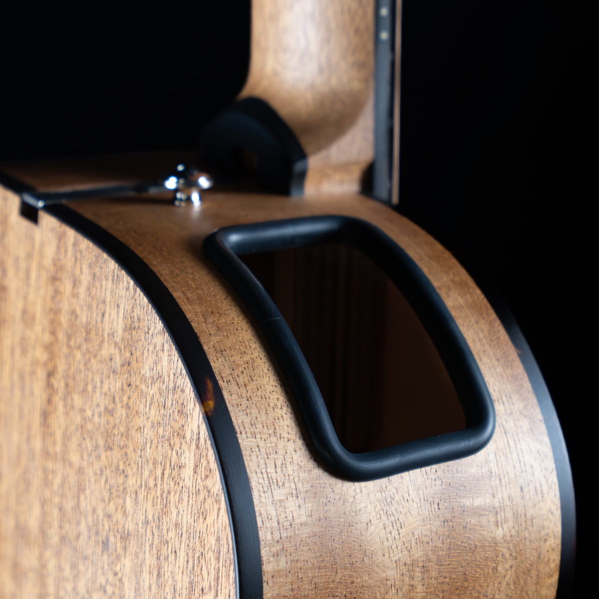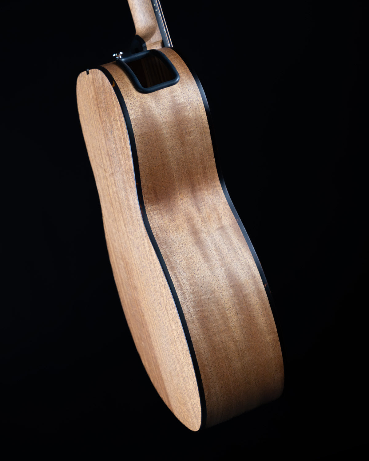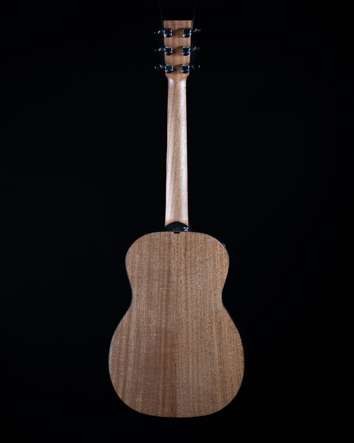 This example has a solid Sitka spruce top, solid mahogany back/sides/neck.  1 3/4" nut width, 2 1/8" string spacing at the saddle, short 24 1/4" scale length.  Ebony fingerboard, bridge and peghead overlay.  Compensated Tusq saddle, Furch locking tuners.  Includes soft bag/back pack.