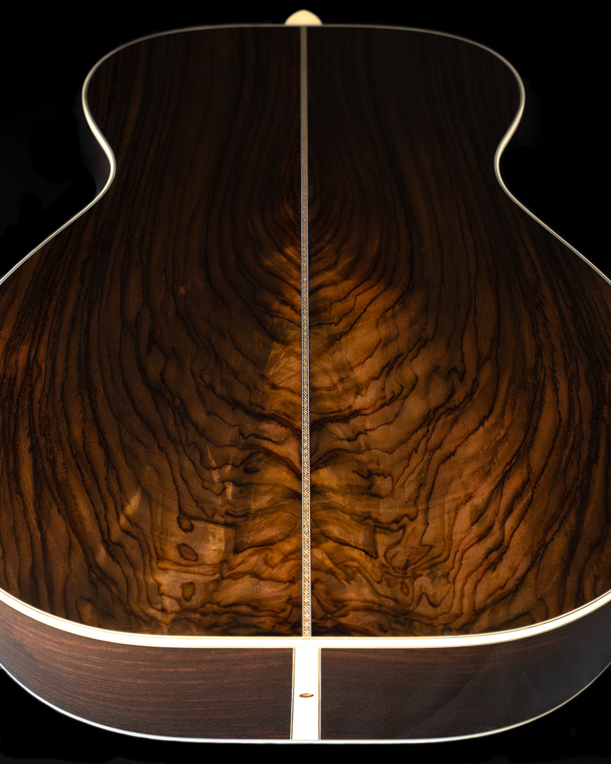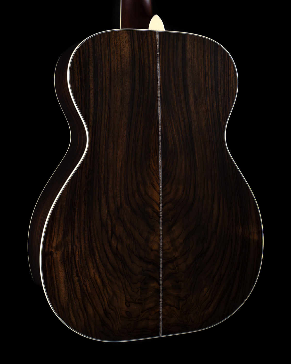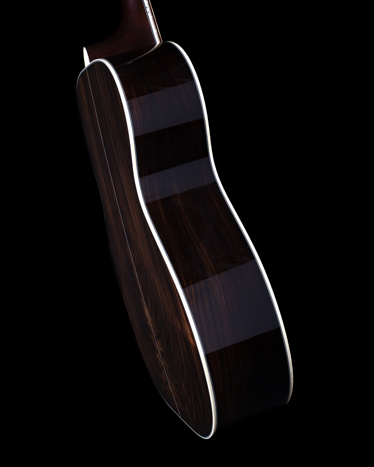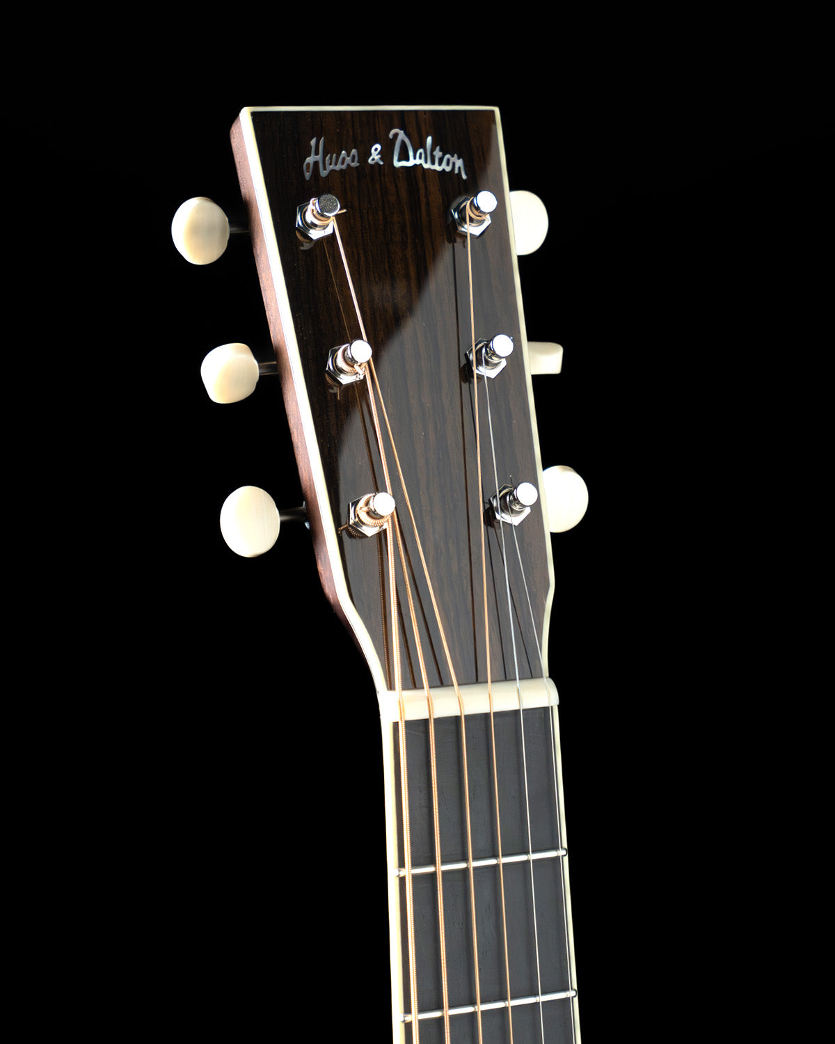 The top is straight-grained Italian spruce, which we love for its ample headroom and tonal complexity. The back and sides are uncommonly figured Indian rosewood that seems to glow from the inside. We couldn't stop there, though, we asked for a dark sunburst and that the body, neck and peghead all be bound in ivoroid, the matching tuner buttons on the H&D engraved Gotoh tuners.