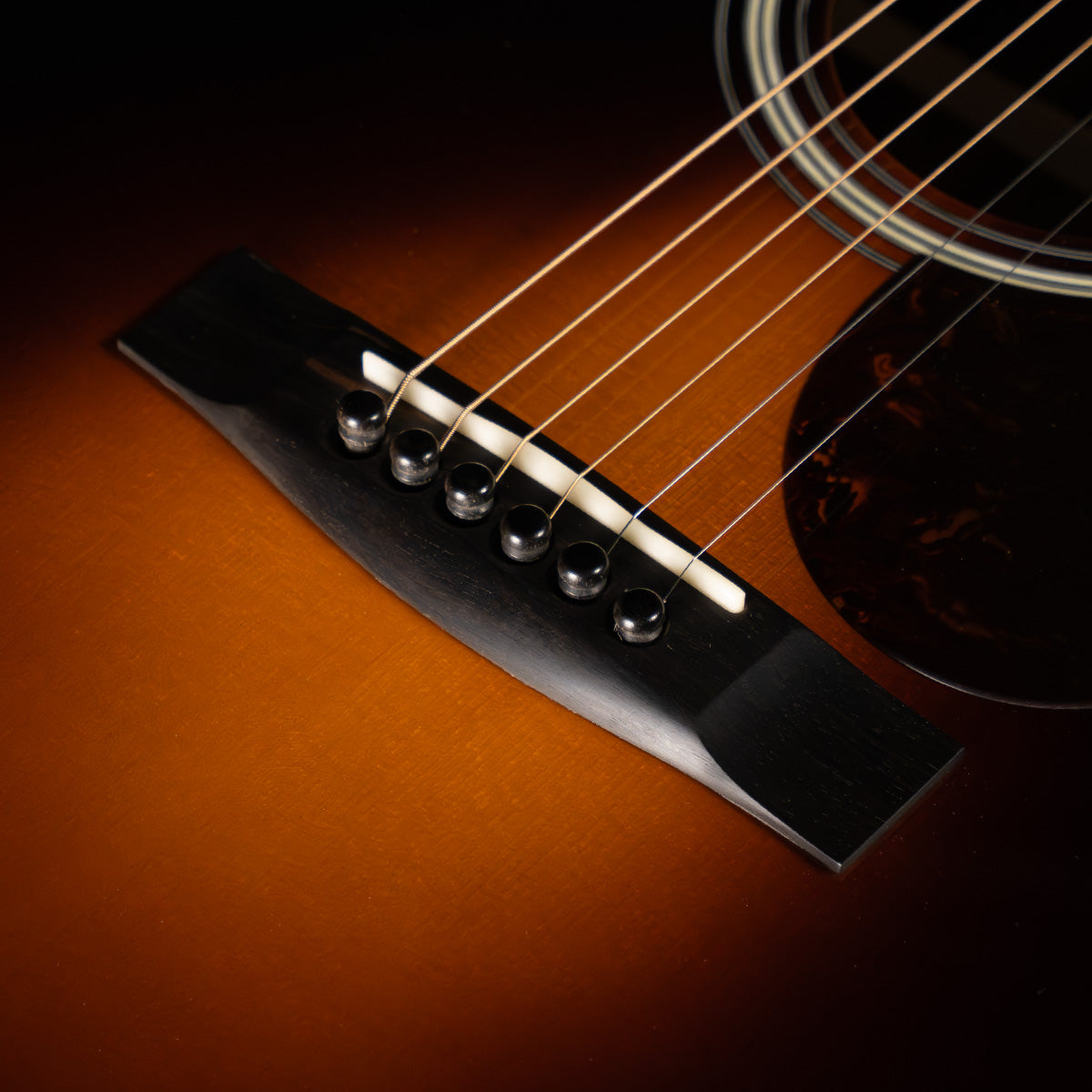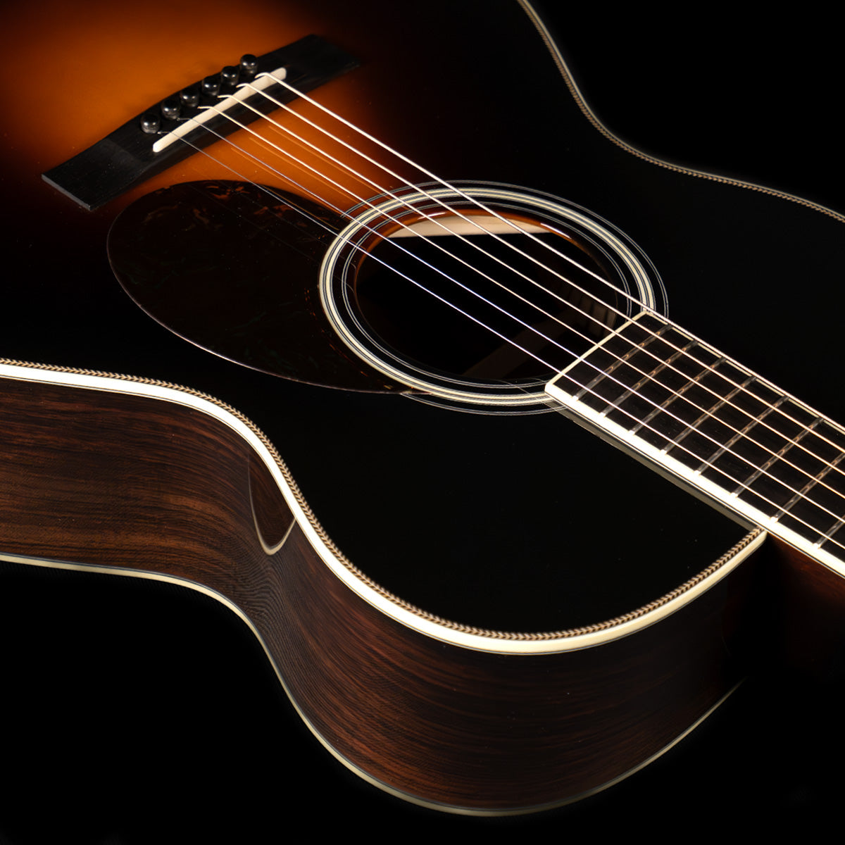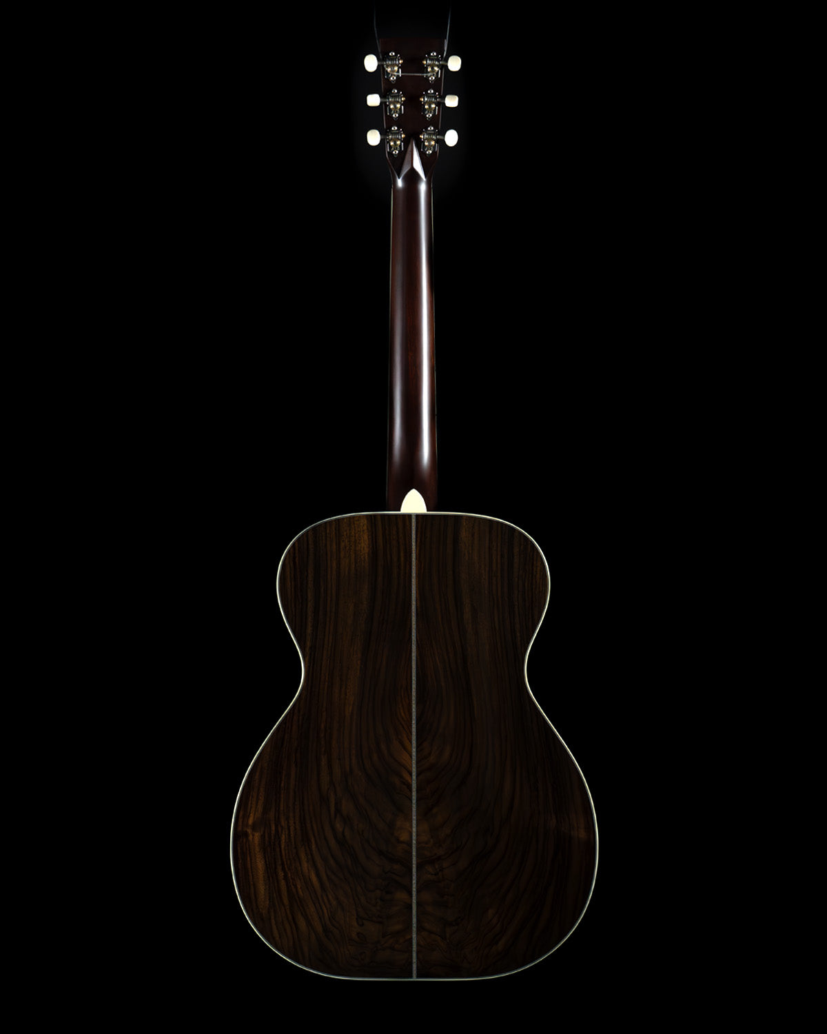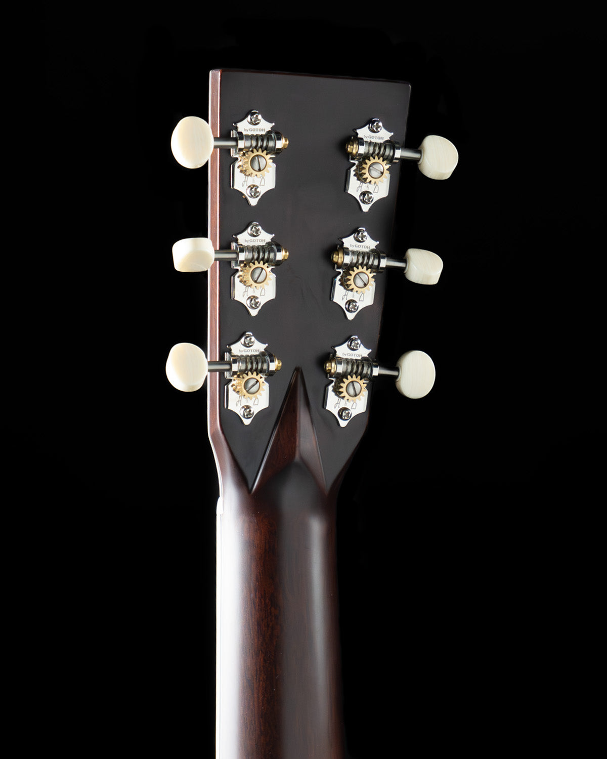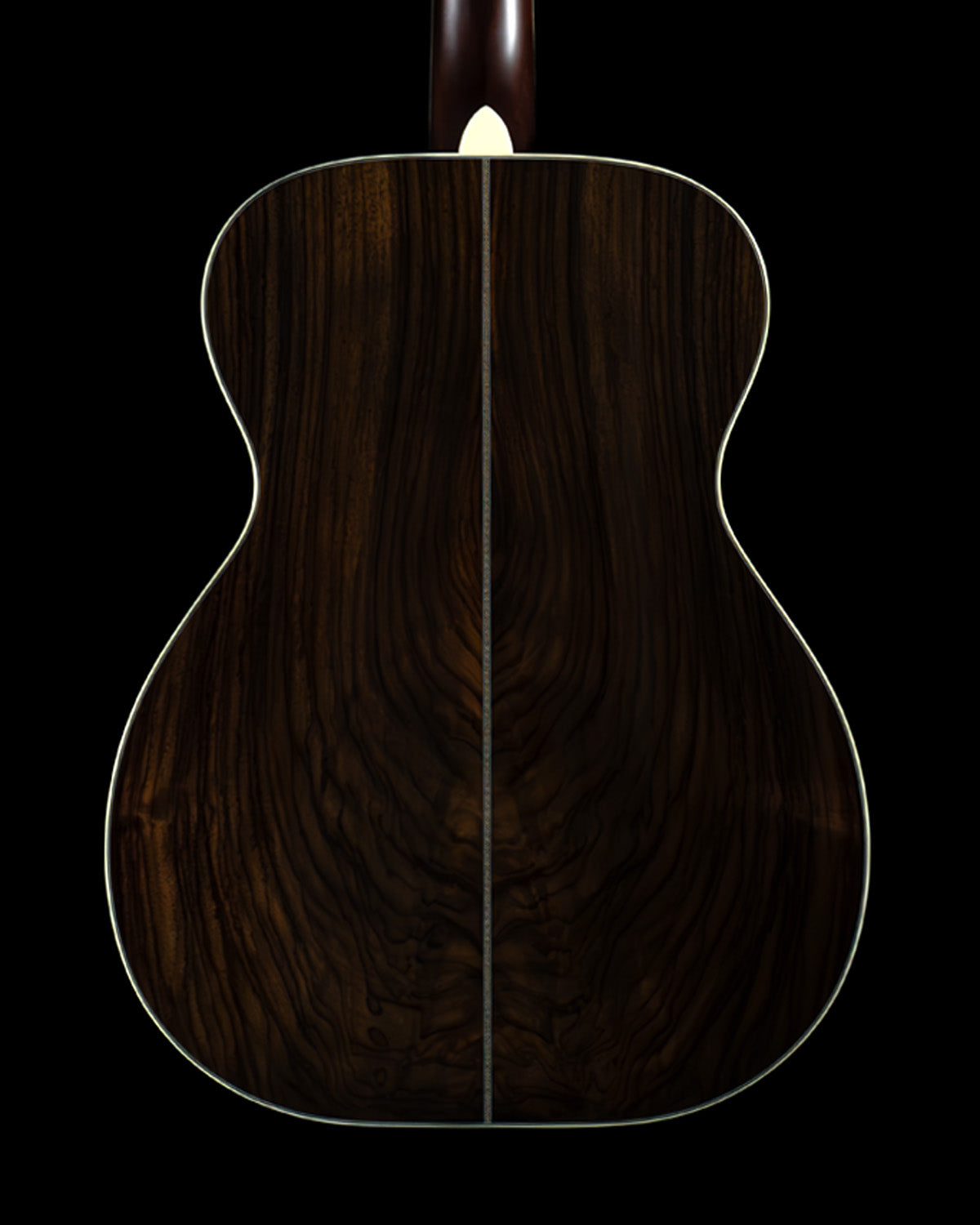 The top is straight-grained Italian spruce, which we love for its ample headroom and tonal complexity. The back and sides are uncommonly figured Indian rosewood that seems to glow from the inside. We couldn't stop there, though, we asked for a dark sunburst and that the body, neck and peghead all be bound in ivoroid, the matching tuner buttons on the H&D engraved Gotoh tuners.
