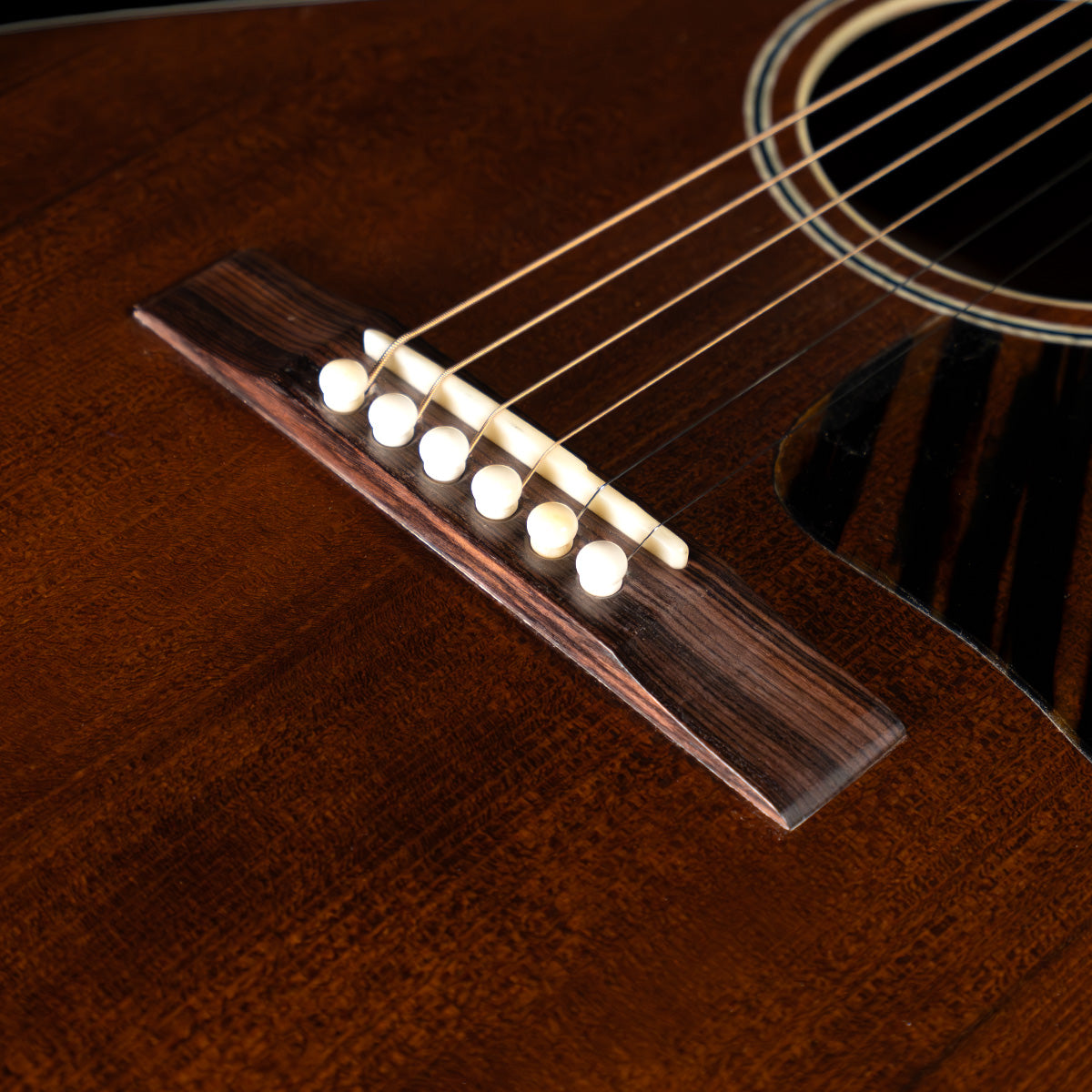 Short 24 5/8" scale length with 1 3/4" nut and 2 1/4" string spacing at the saddle.  The neck is a C shape and measures .89" thick at the first fret, .94" at the ninth.  The bridge is Madagascar rosewood with bone pins and a nice tall bone saddle.  The tuners are Waverly with ebony buttons.  Includes hard case.
