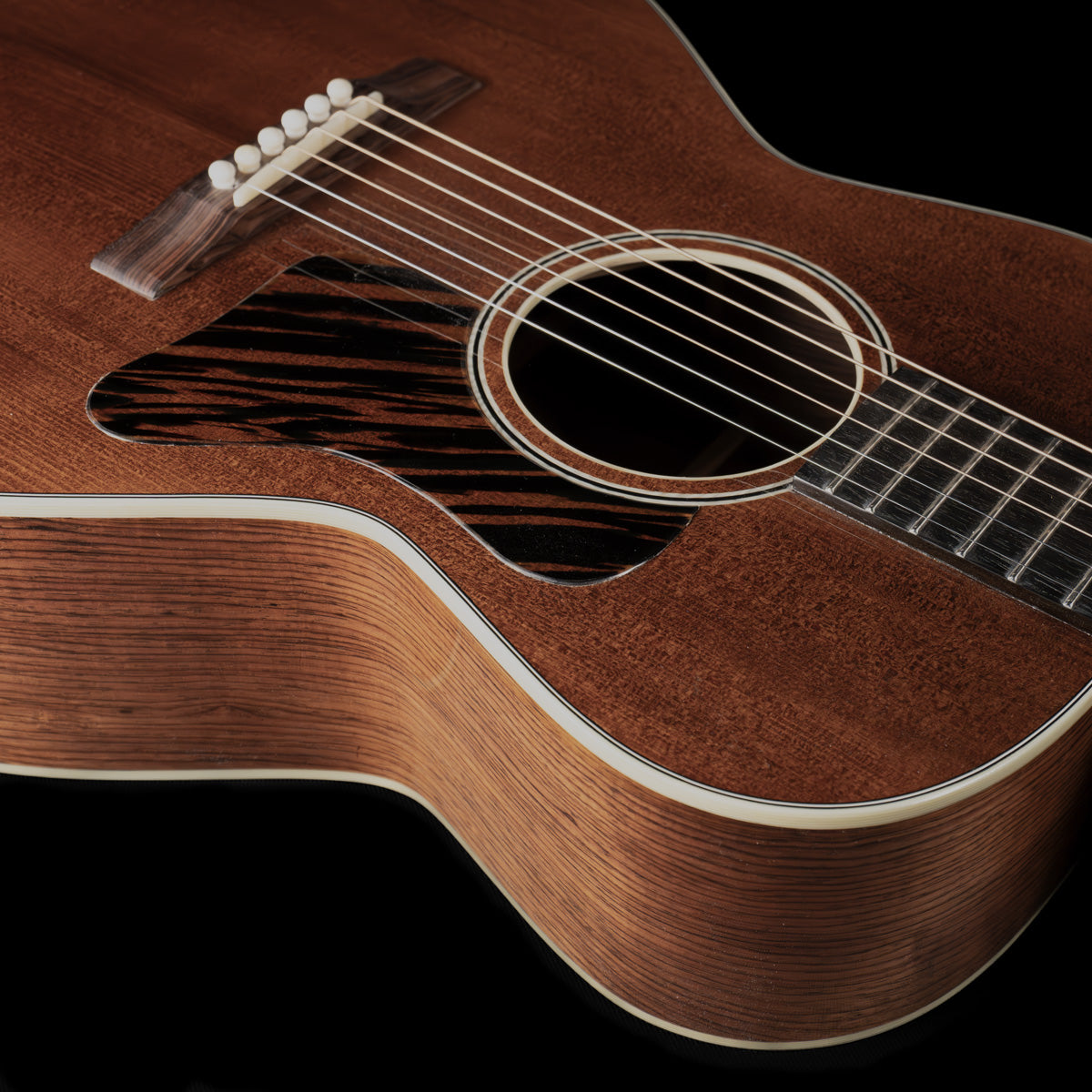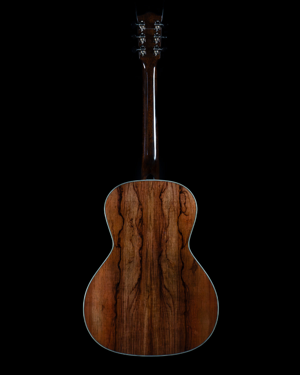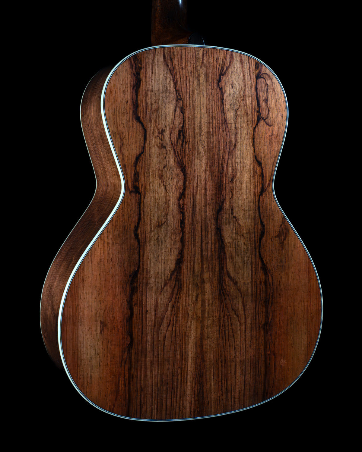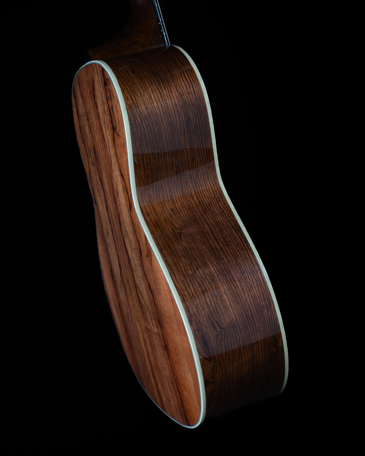 This guitar is extremely pleasing, both visually and sonically.  We had Kevin take the venerable deep body L-00 (Nick Lucas style) and combine the warmth of redwood with the exotic rosewood character of Palo Escrito.  Palo Escrito grows in Mexico and has long been a favorite for stringed instruments, particularly classical guitars.  It looks no less than fabulous on this guitar, and the sound is rich and inviting.  Not a lot of gingerbread here, with a no-inlay ebony fingerboard, ivoroid body binding and bound sound hole plus a fire stripe pick guard.  The wood is really the star of the show.