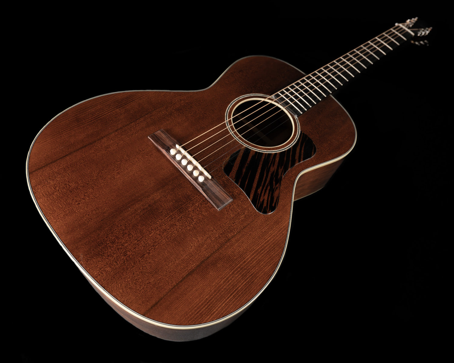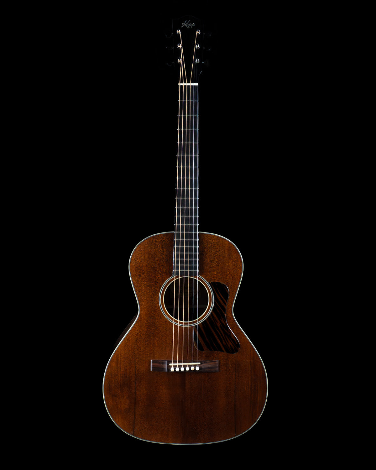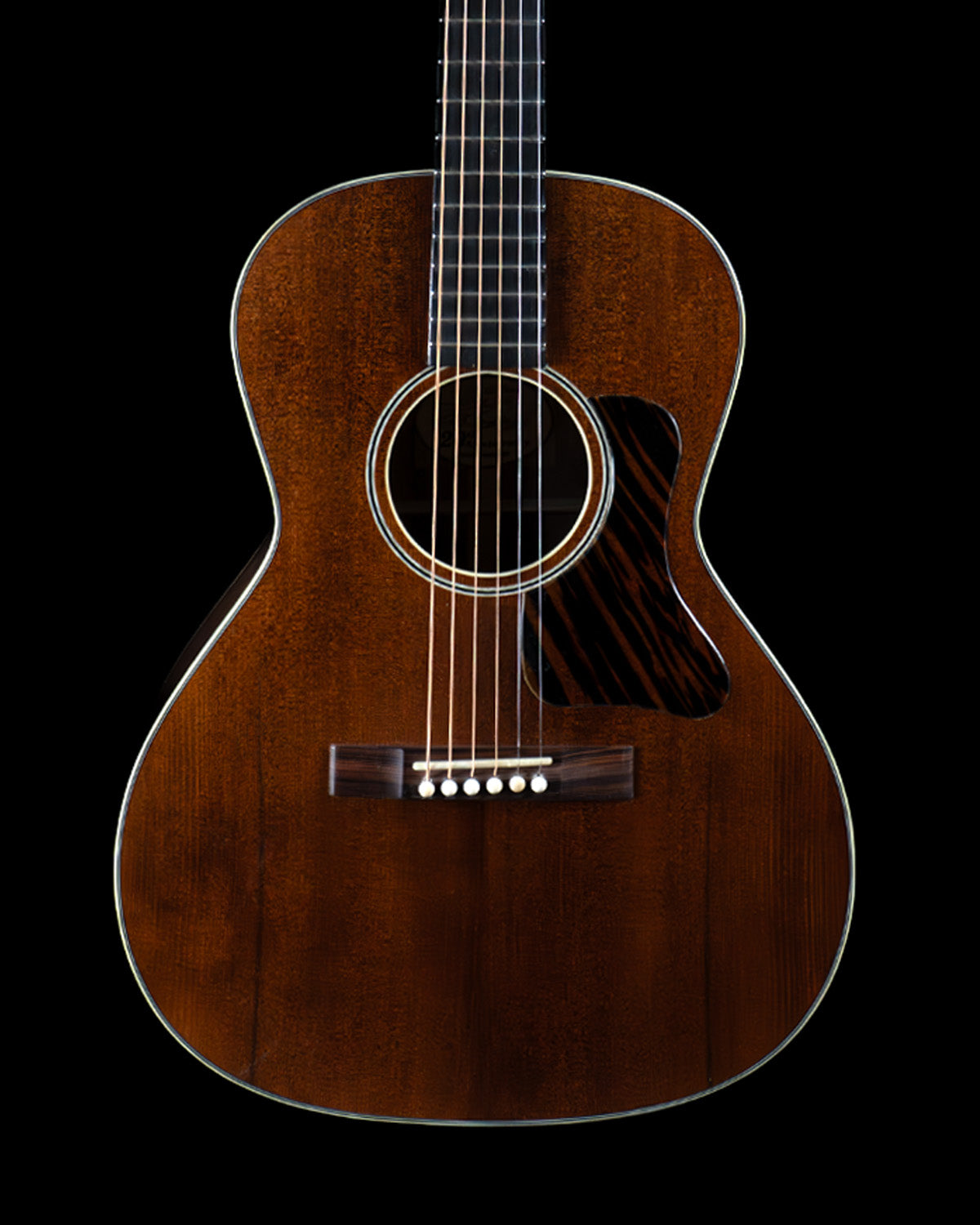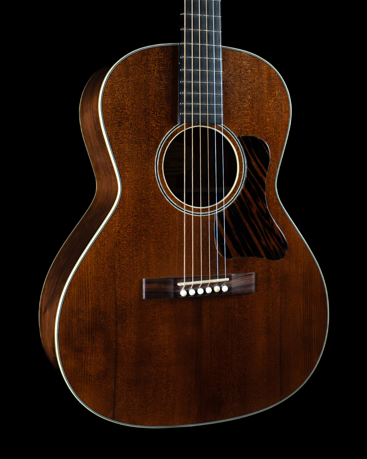 This guitar is extremely pleasing, both visually and sonically.  We had Kevin take the venerable deep body L-00 (Nick Lucas style) and combine the warmth of redwood with the exotic rosewood character of Palo Escrito.  Palo Escrito grows in Mexico and has long been a favorite for stringed instruments, particularly classical guitars.  It looks no less than fabulous on this guitar, and the sound is rich and inviting.  Not a lot of gingerbread here, with a no-inlay ebony fingerboard, ivoroid body binding and bound sound hole plus a fire stripe pick guard.  The wood is really the star of the show.