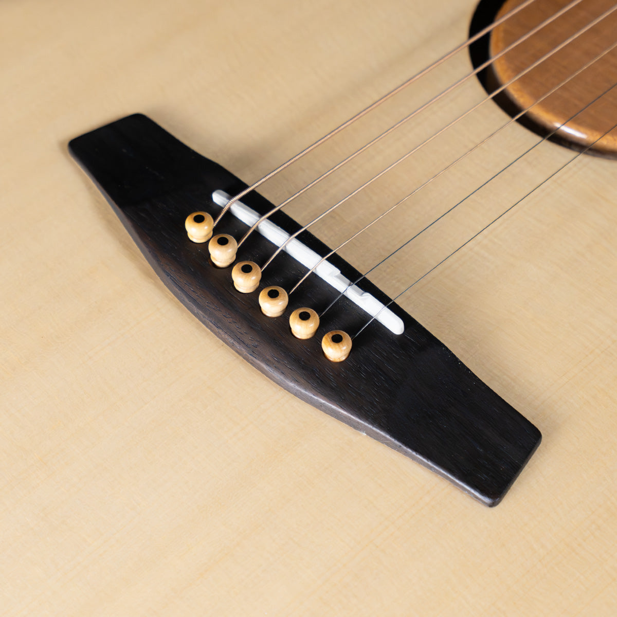 1 11/16" nut, 2 3/16" string spacing at the saddle, long 25 5/8" scale. The neck shape is a modern low profile with smooth satin finish, it measures .847" at the first fret and .902" at the ninth. This one has a natural Engelmann spruce top.