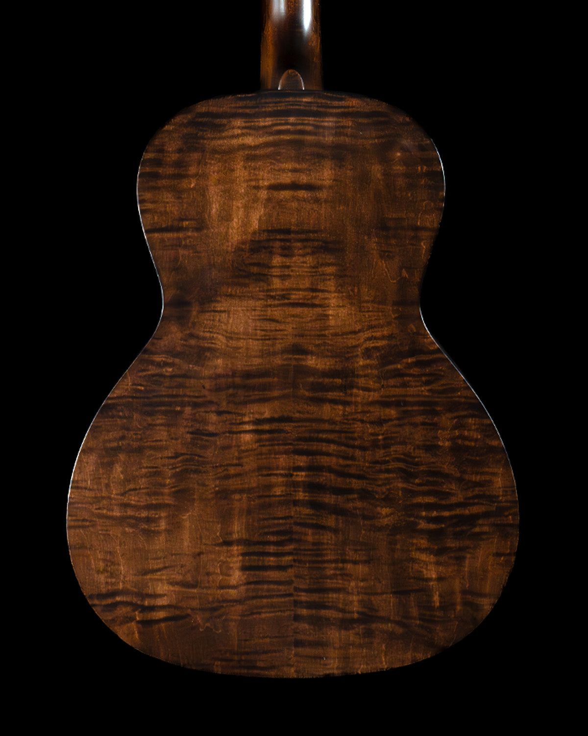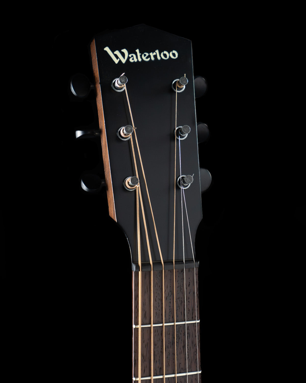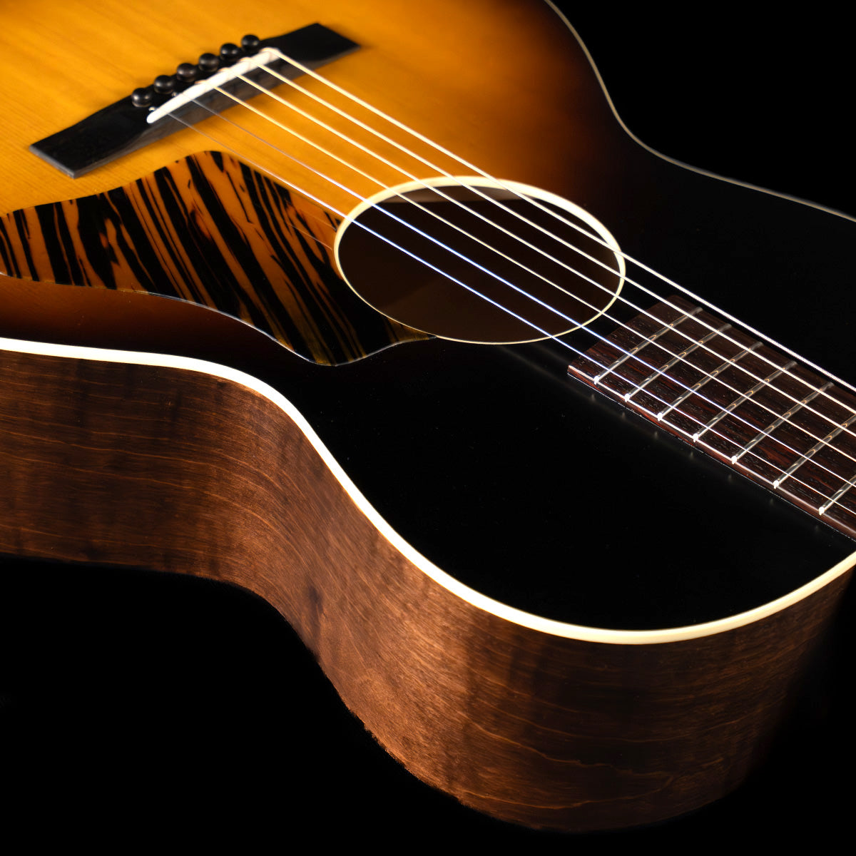 Waterloo instruments are spec'd simply with "Spruce" as the designated top wood, and the vast majority of them are Sitka. We believe that this particular instrument was fit with an Adirondack top. How do we know this? Adirondack takes the sunburst a little different, having a slightly more yellow cast (vs Sitka's more red appearance under sunburst). After noticing that, we always go inside with our flashlights and inspection mirror and, sure enough, that don't look like no Sitka to us! Collings won't confirm or deny, so you'll have to trust us on this one.