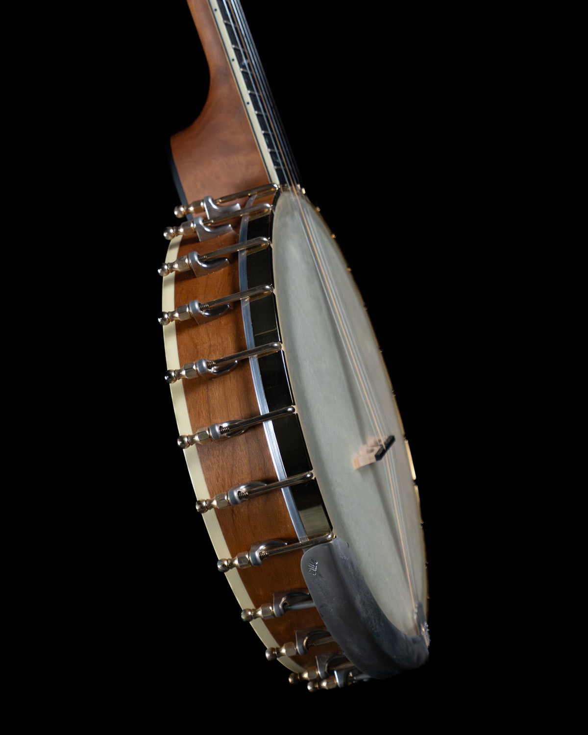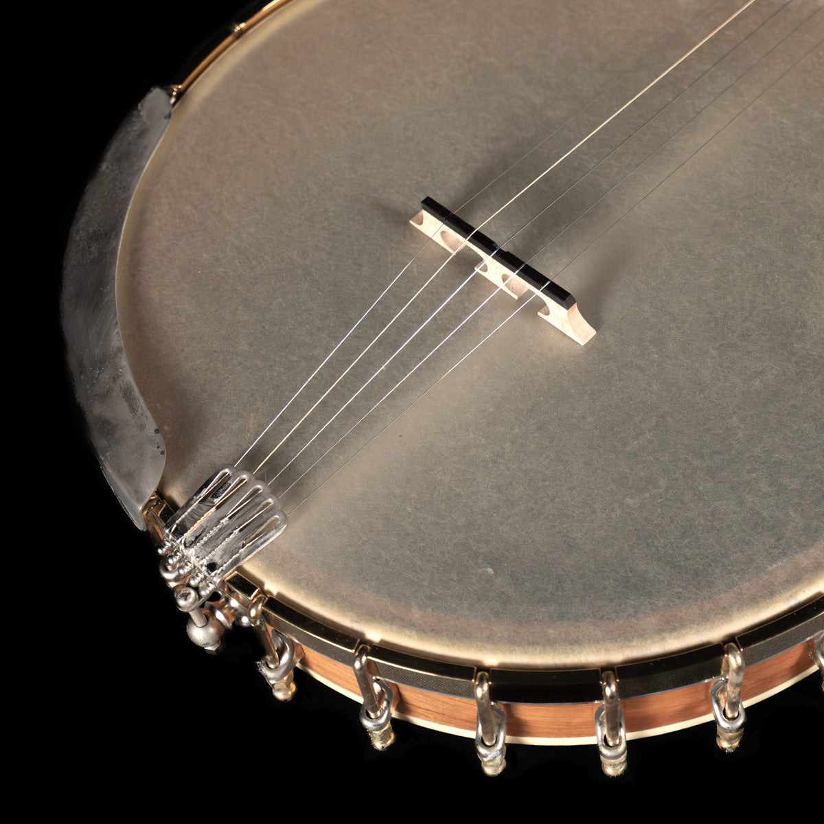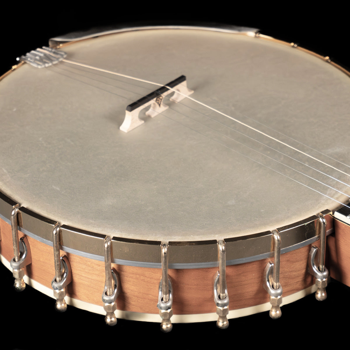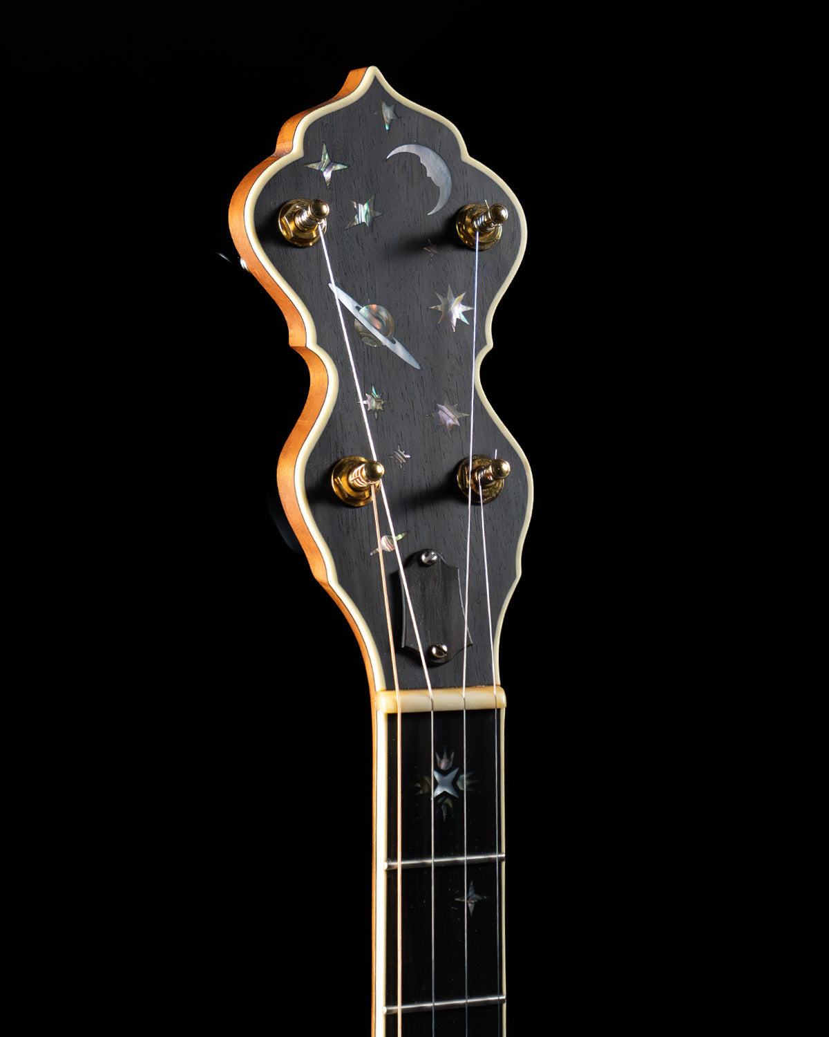 This banjo is long scale (26 1/4") and has a 1 9/32" bone nut. Gold planetary tuners with black buttons. Spiked at 7 and 9.