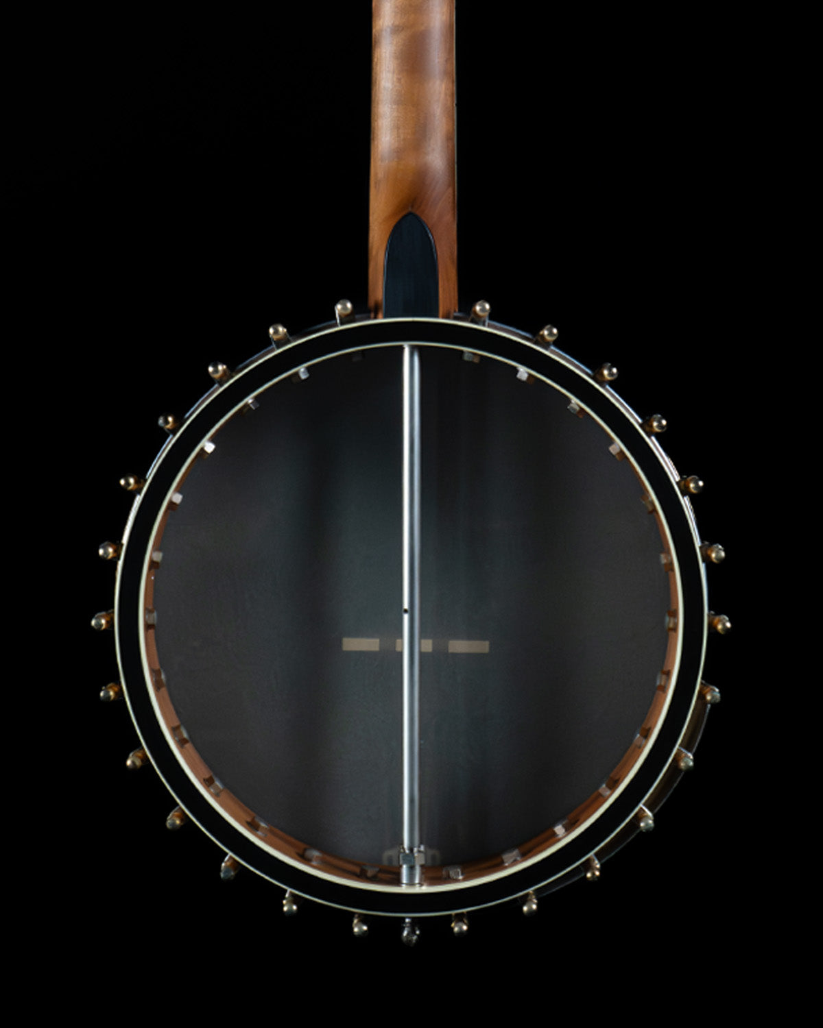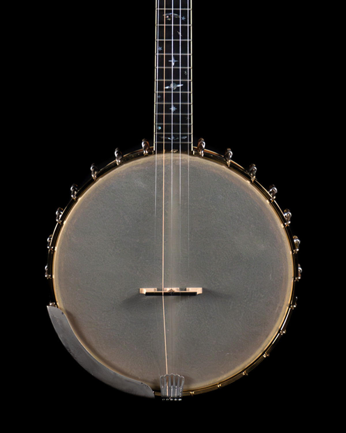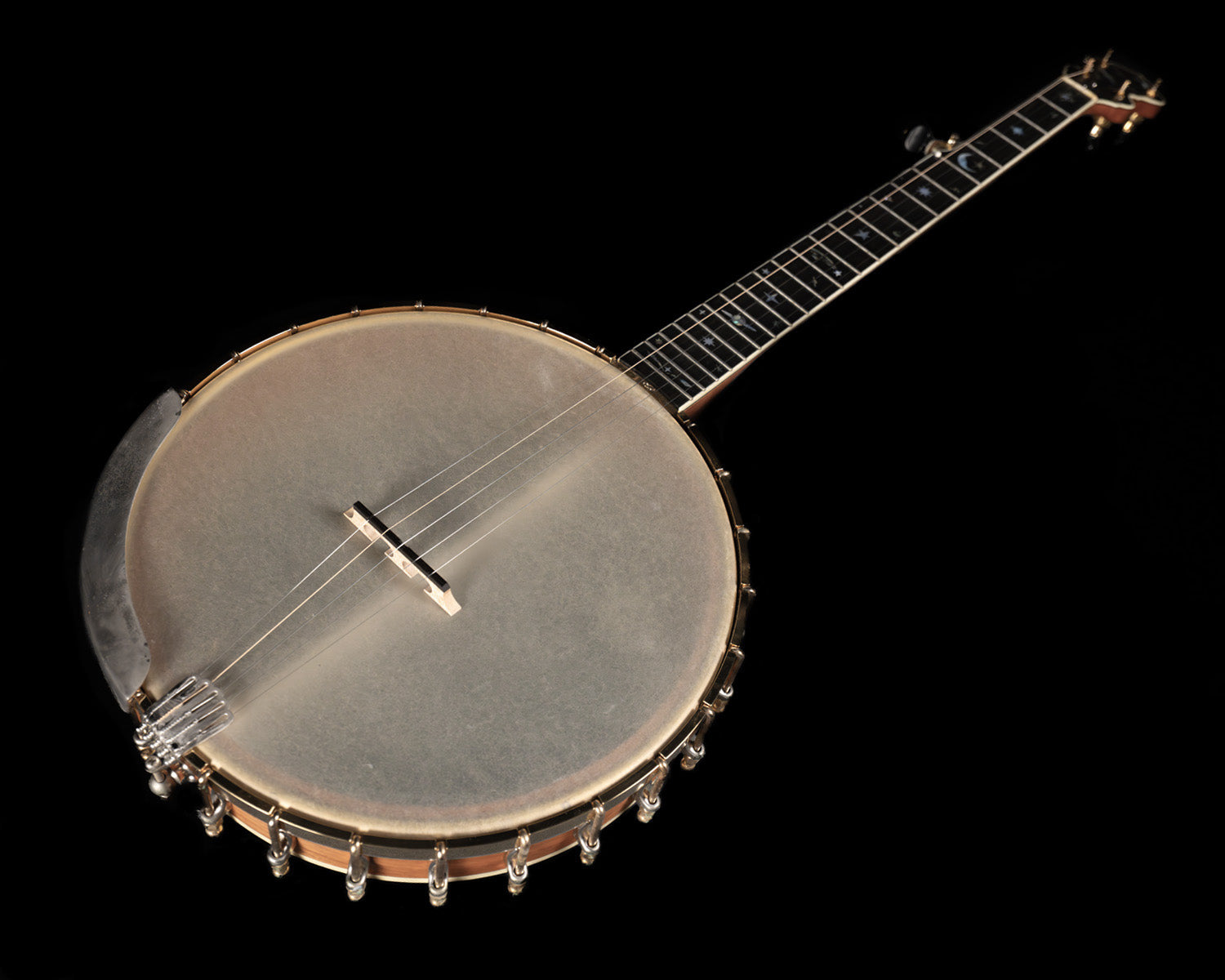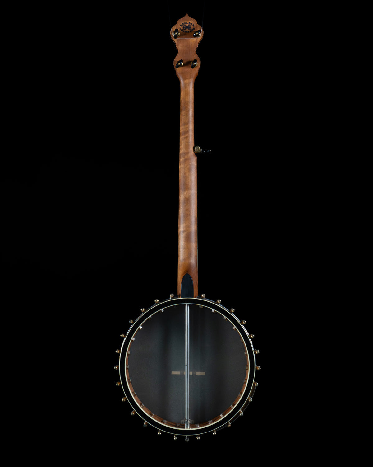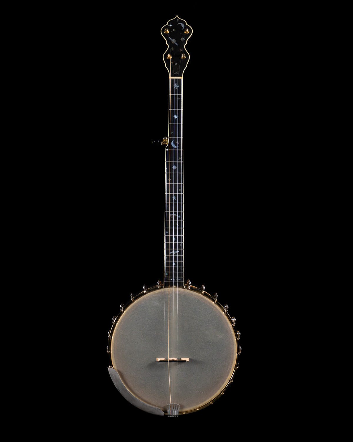 This banjo is long scale (26 1/4") and has a 1 9/32" bone nut. Gold planetary tuners with black buttons. Spiked at 7 and 9.