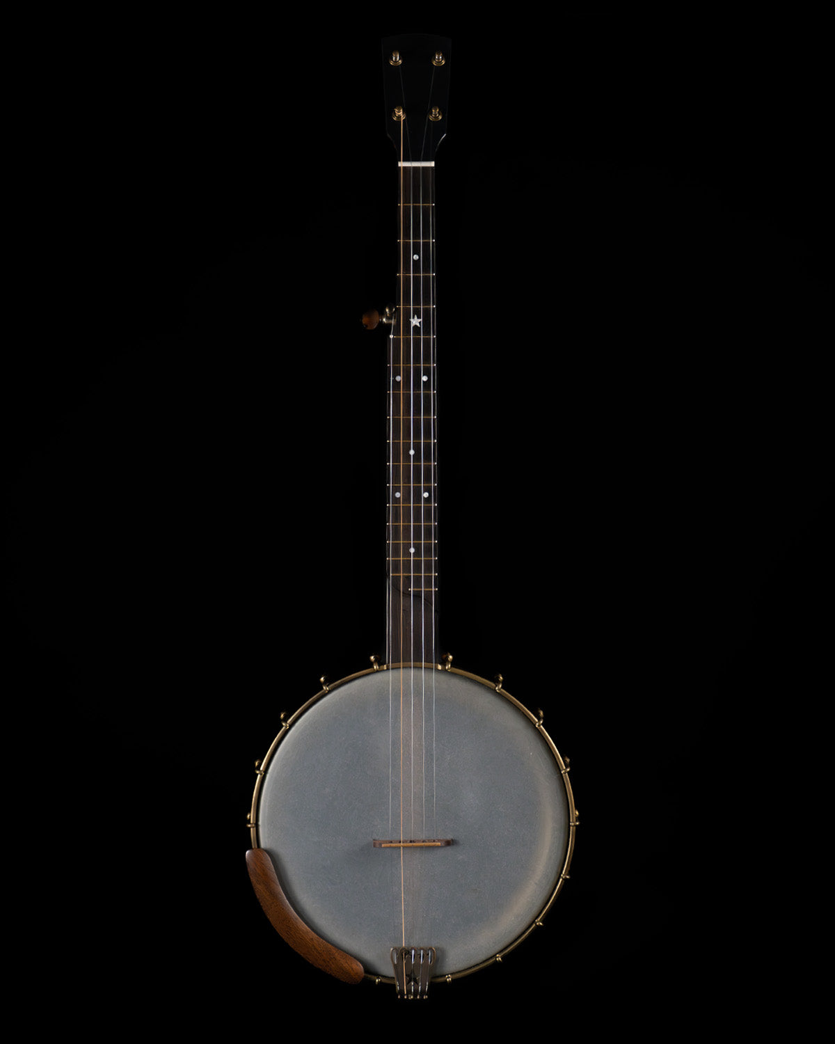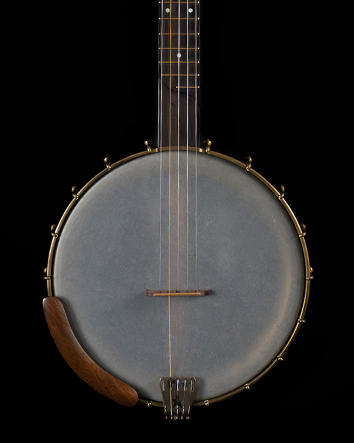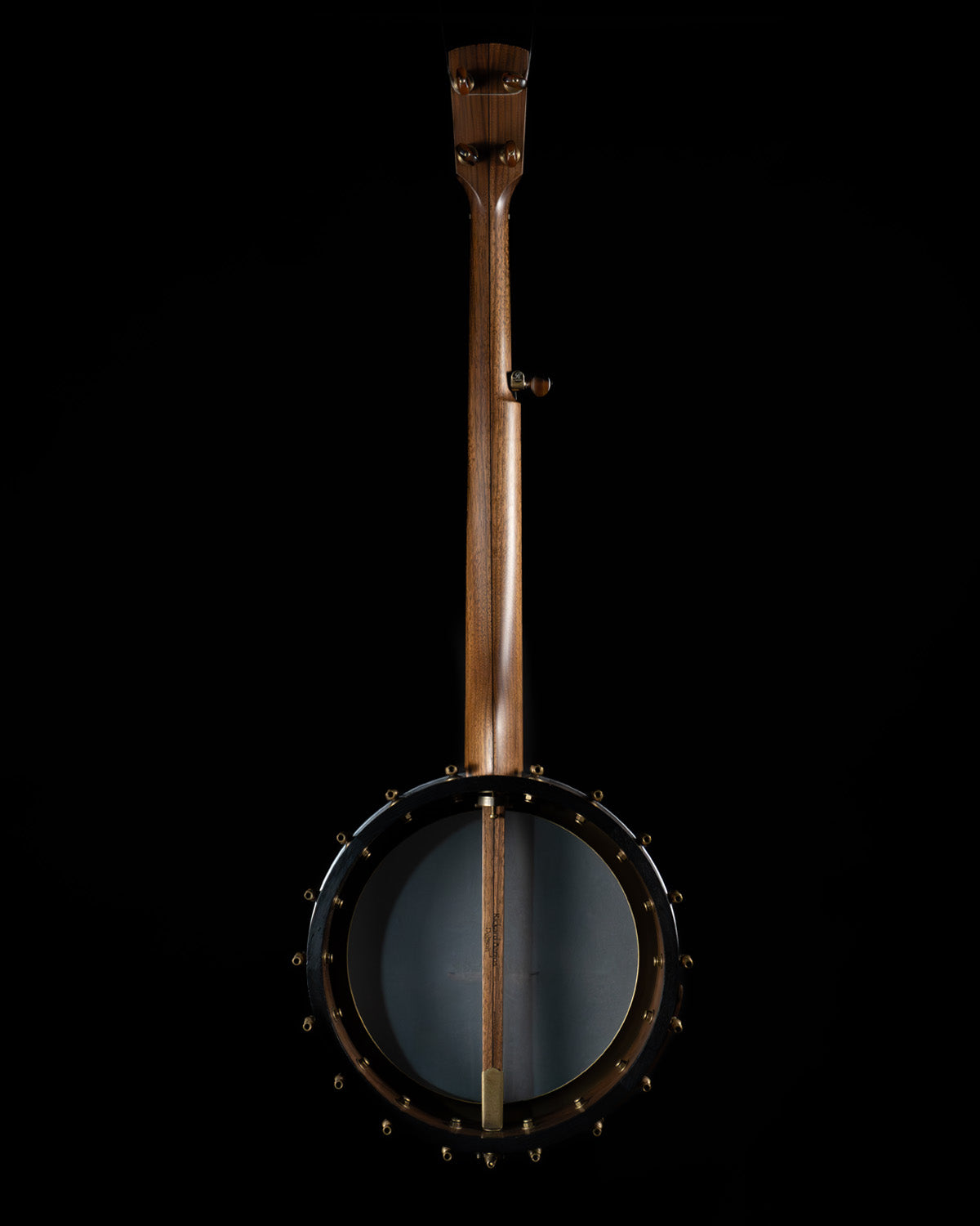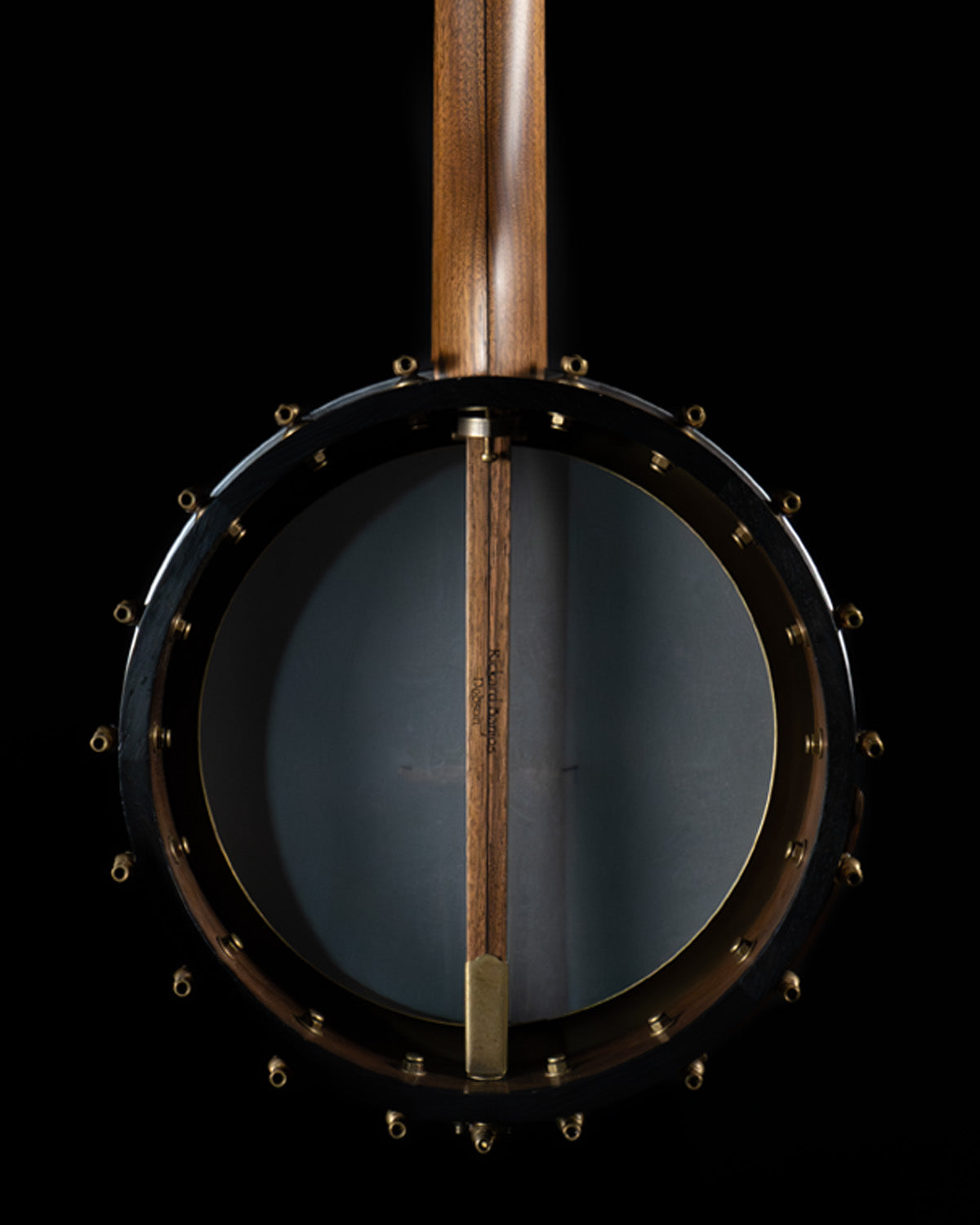 (USED) Here is a very fine, plucky sounding Rickard open-back banjo with a Dobson tone ring. The 12" rim and the neck are walnut, and the rim has marquetry accents. The scale length is 25 1/2" and it has a 1 5/16" bone nut. The fingerboard is ebony with no radius, spike at 7 frailing scoop and gold frets. All hardware is aged brass, and the planetary tuners have faux tortoise buttons.