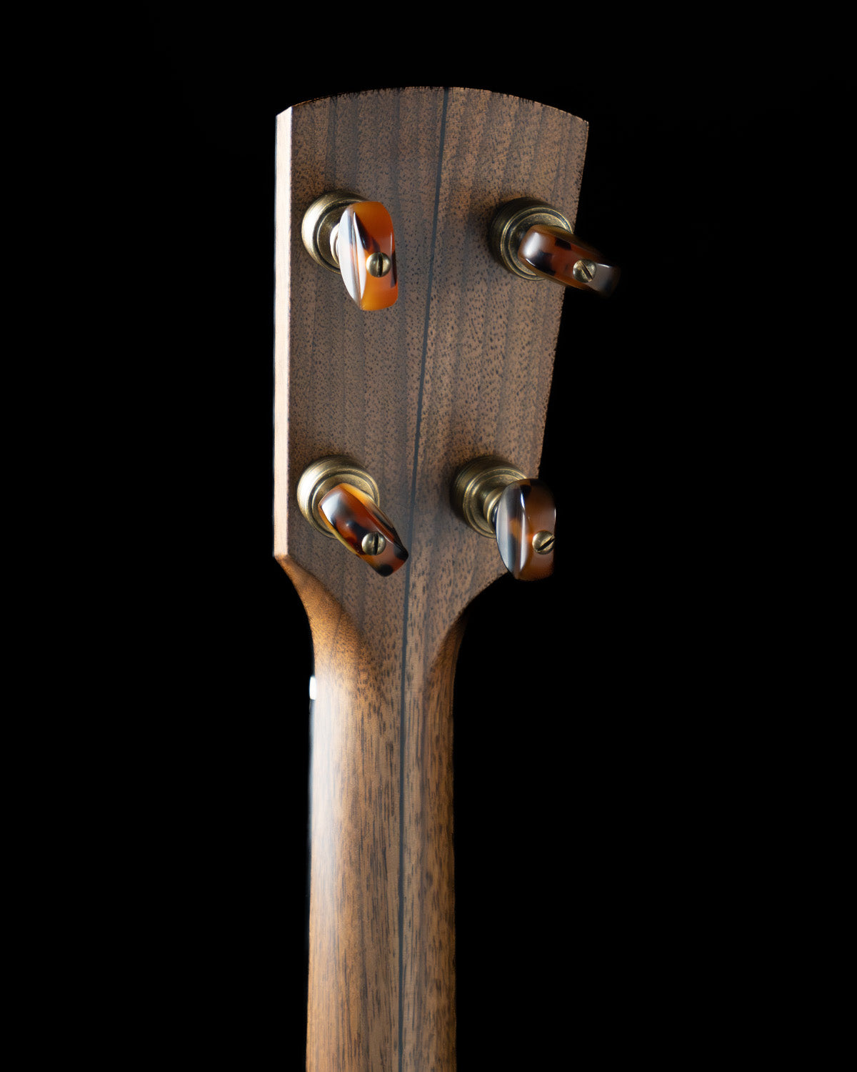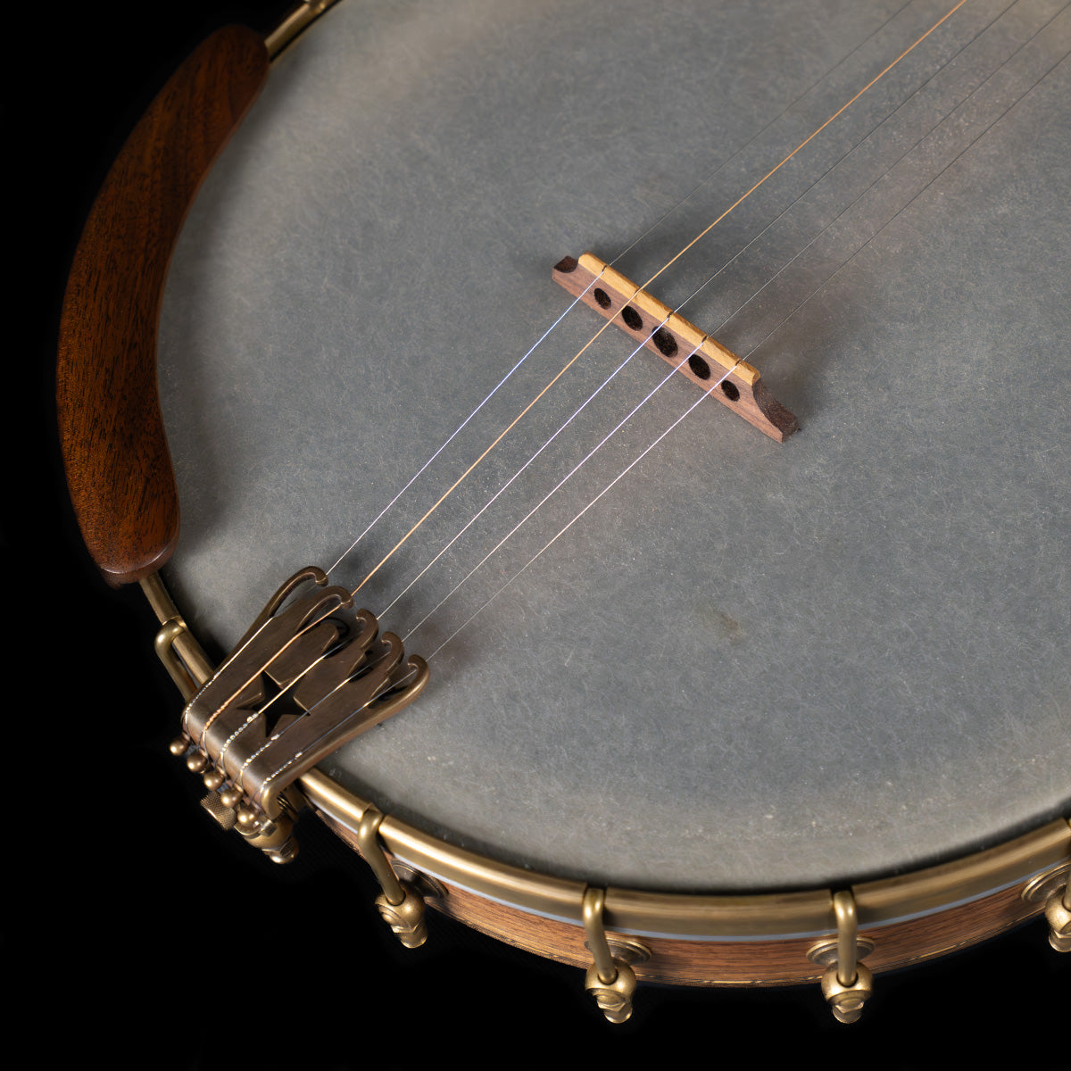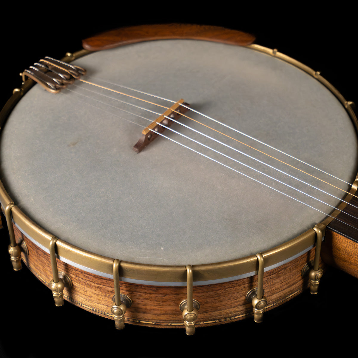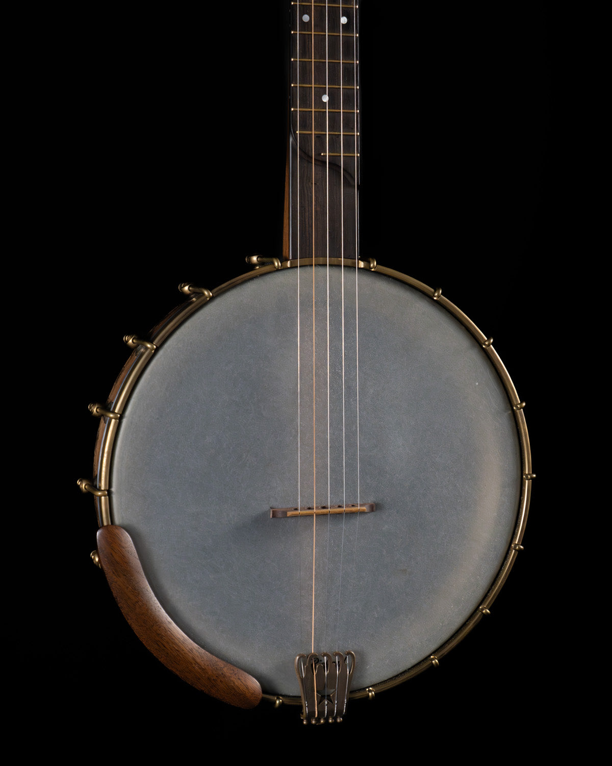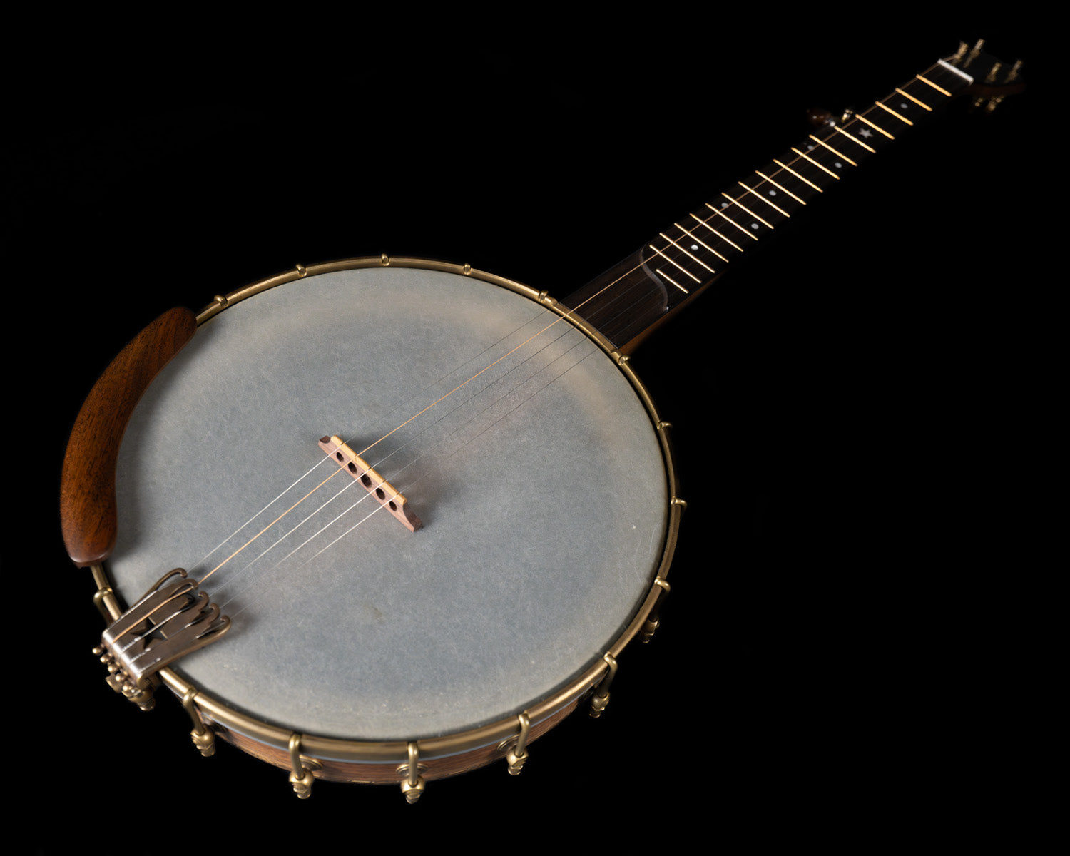 (USED) Here is a very fine, plucky sounding Rickard open-back banjo with a Dobson tone ring. The 12" rim and the neck are walnut, and the rim has marquetry accents. The scale length is 25 1/2" and it has a 1 5/16" bone nut. The fingerboard is ebony with no radius, spike at 7 frailing scoop and gold frets. All hardware is aged brass, and the planetary tuners have faux tortoise buttons.