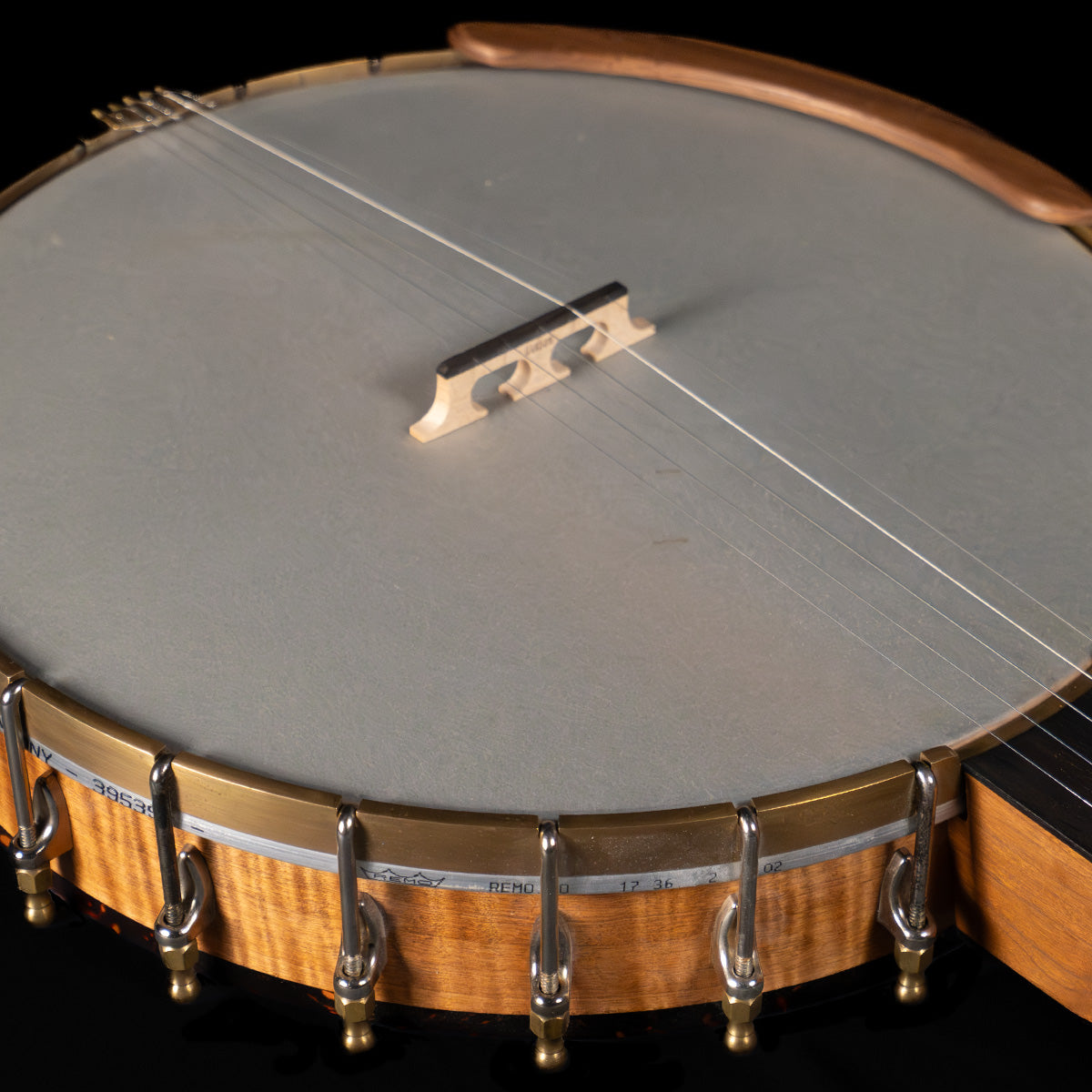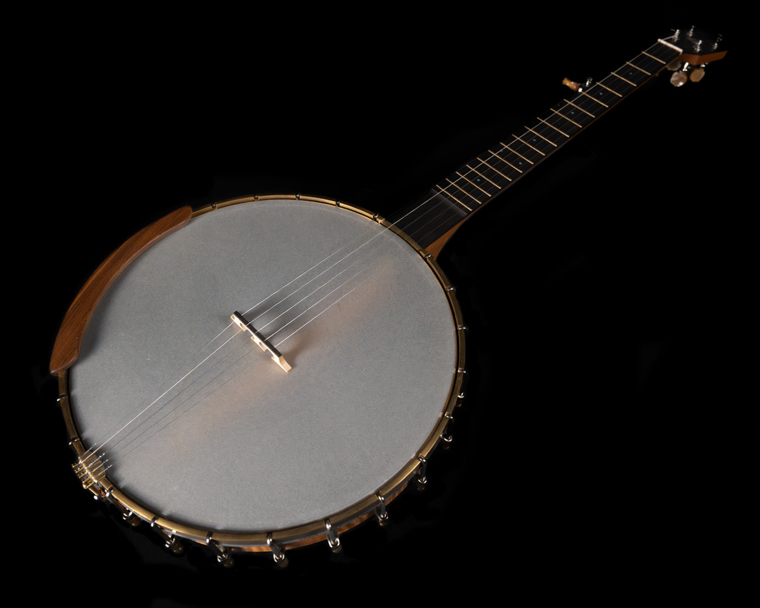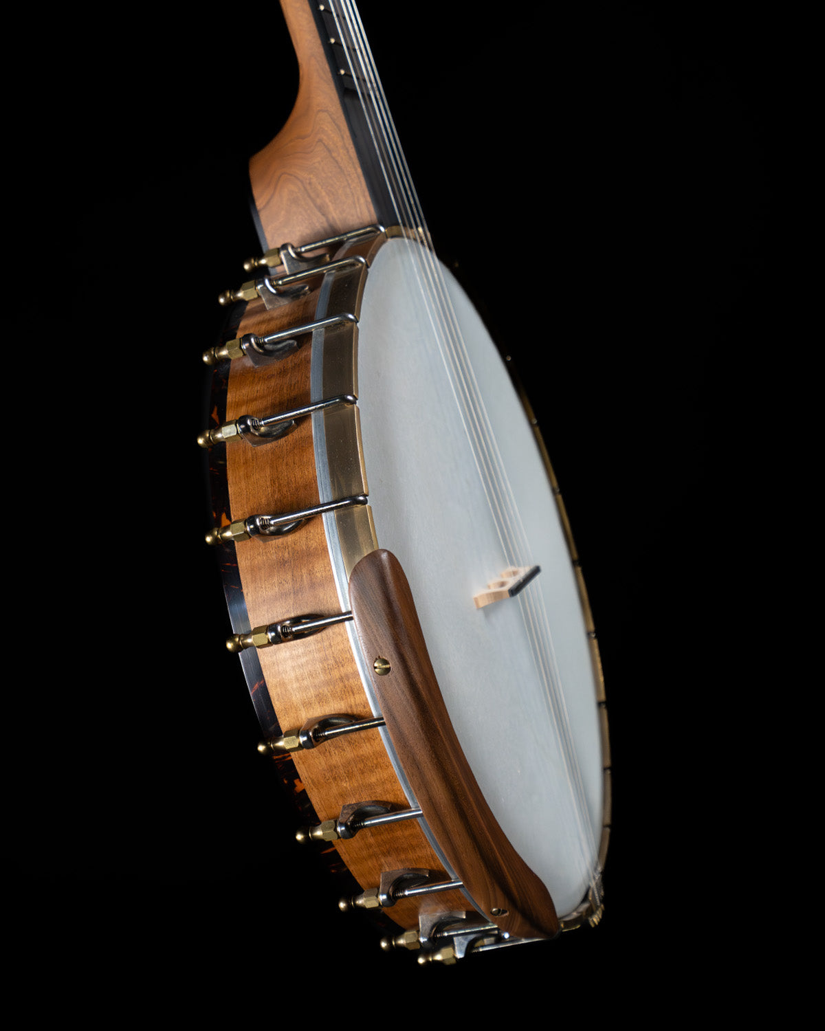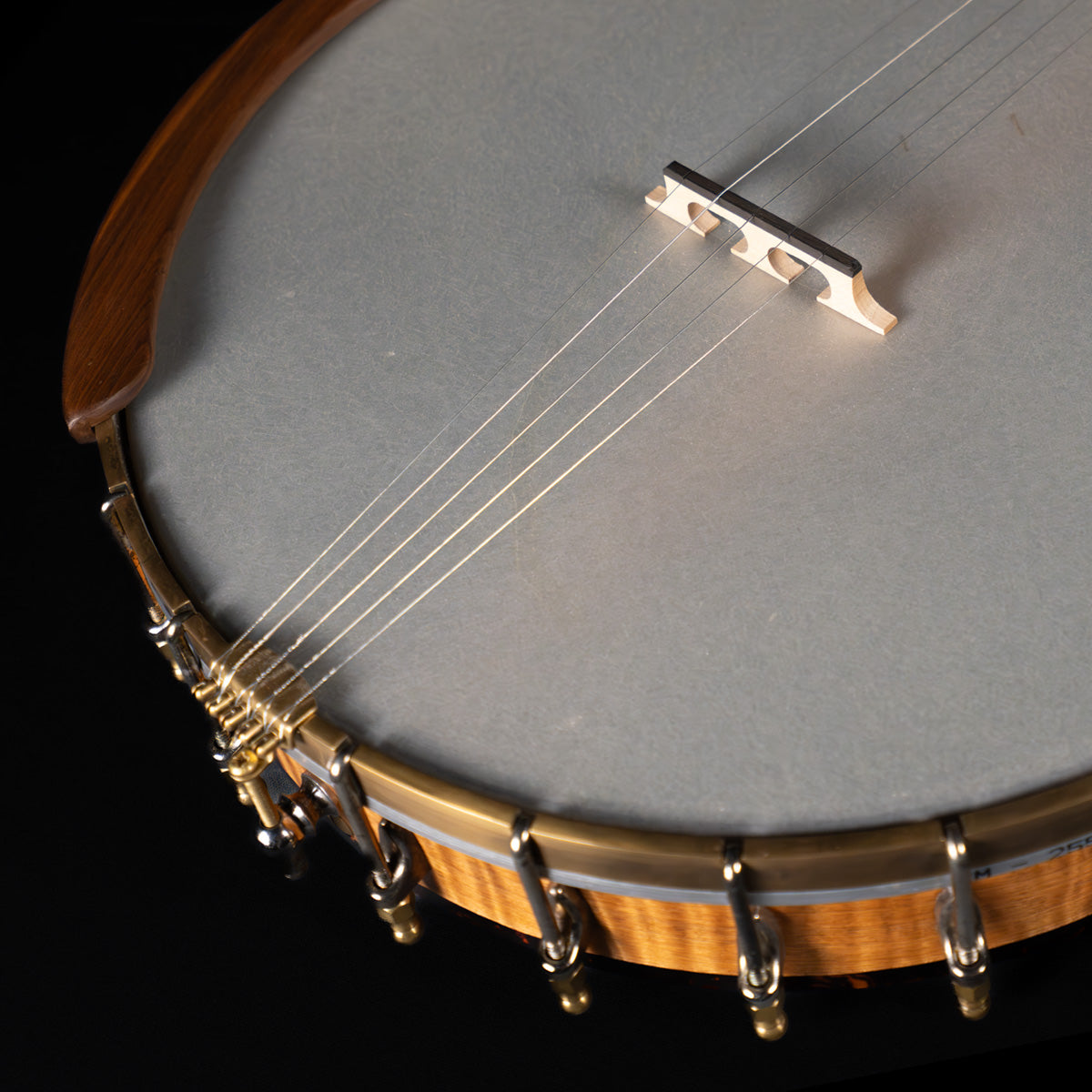 Laminated maple tone rim with walnut neck and flat ebony fingerboard. 25 5/8" scale length, 1 11/32" nut, 1 3/4" string spacing at the saddle. The neck has a smooth oil finish, sleek profile and a boat heel. The hardware is aged brass and the tuners have amber knobs. Price includes gig bag.