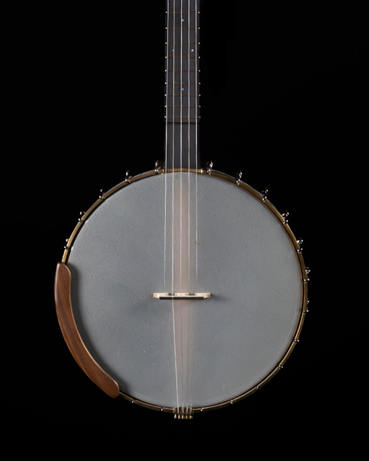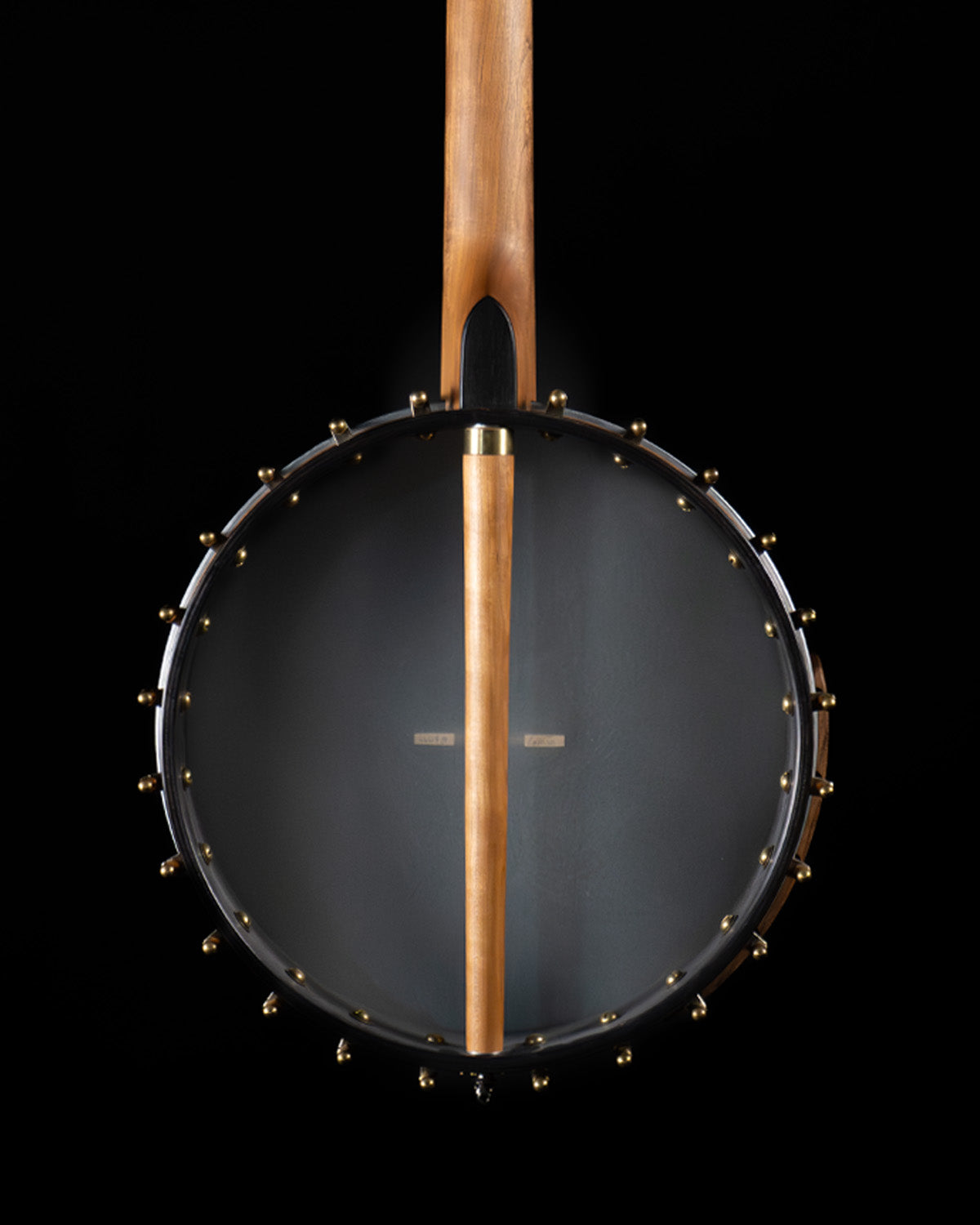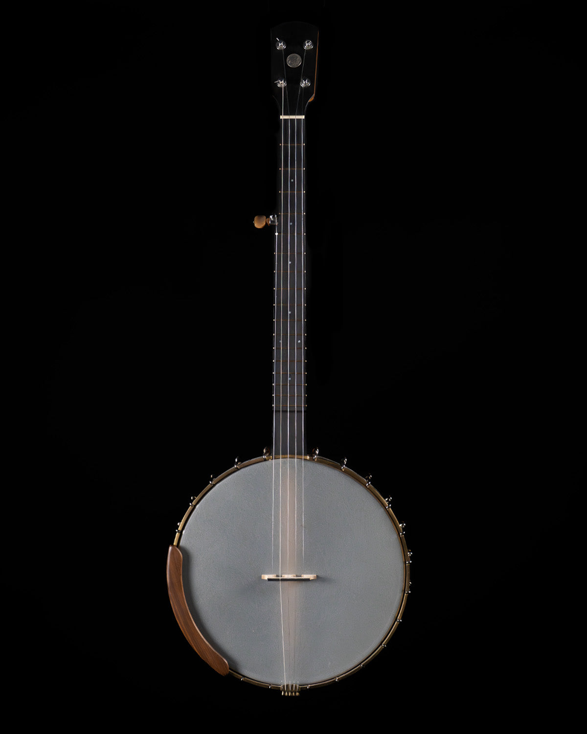 Laminated maple tone rim with walnut neck and flat ebony fingerboard. 25 5/8" scale length, 1 11/32" nut, 1 3/4" string spacing at the saddle. The neck has a smooth oil finish, sleek profile and a boat heel. The hardware is aged brass and the tuners have amber knobs. Price includes gig bag.