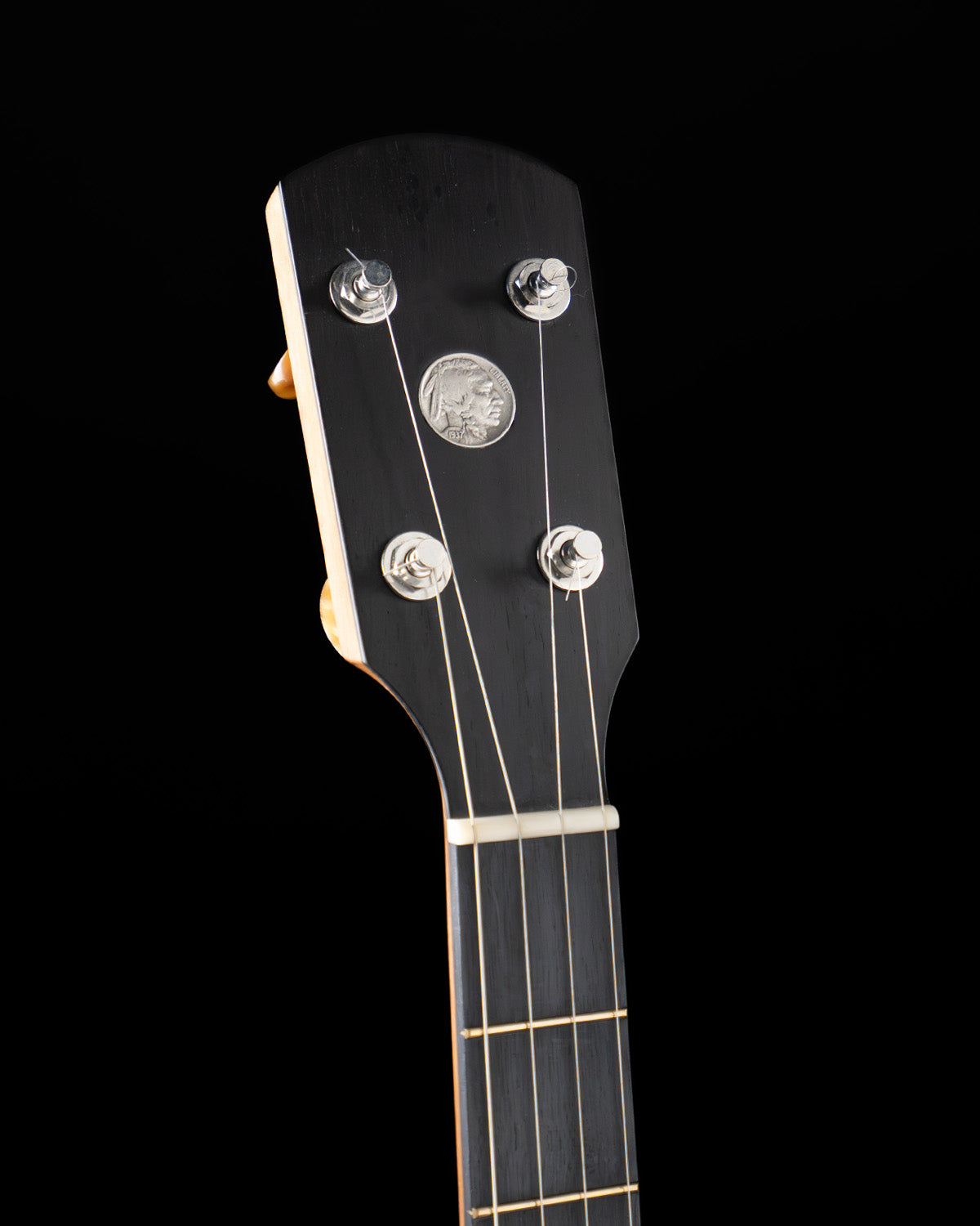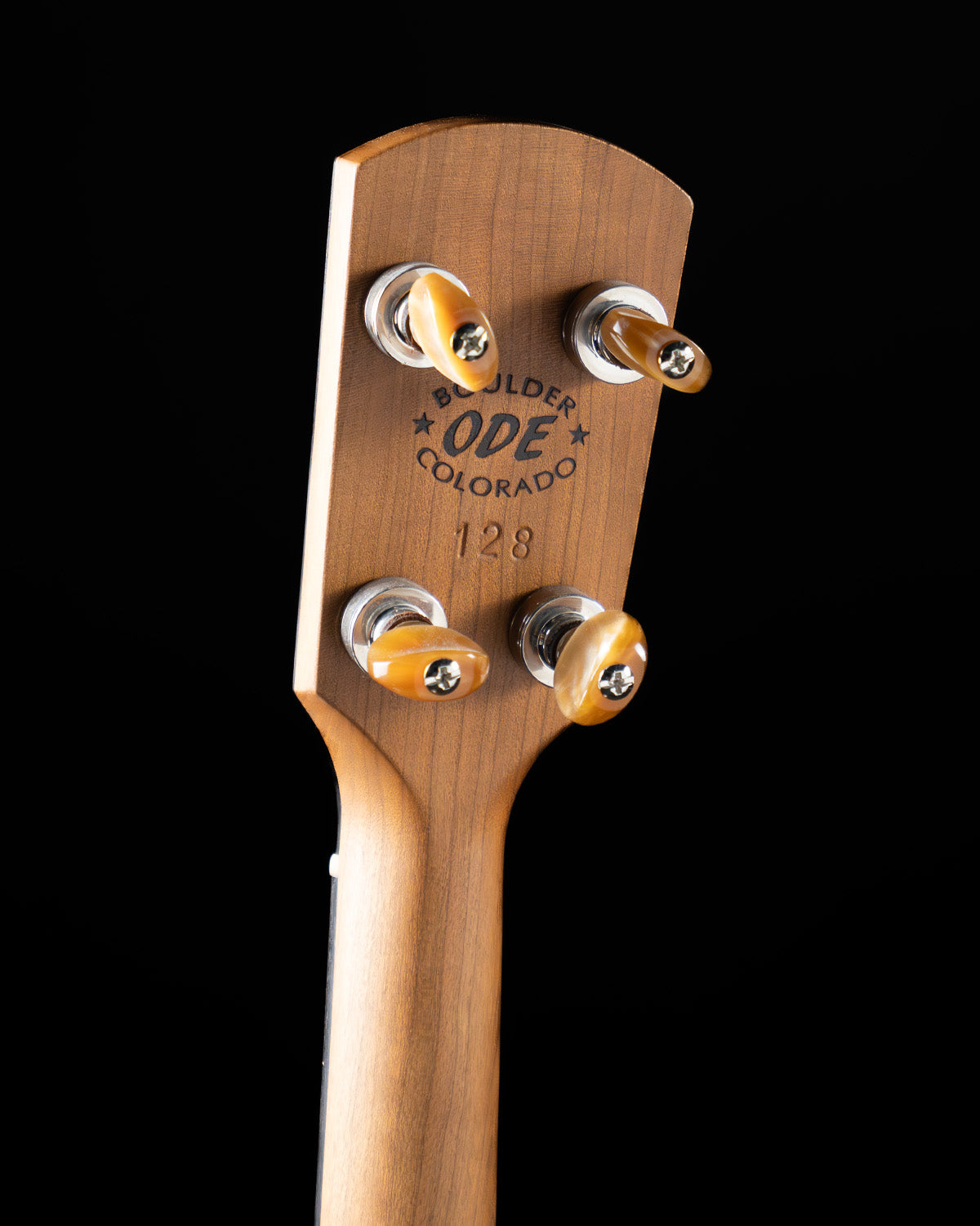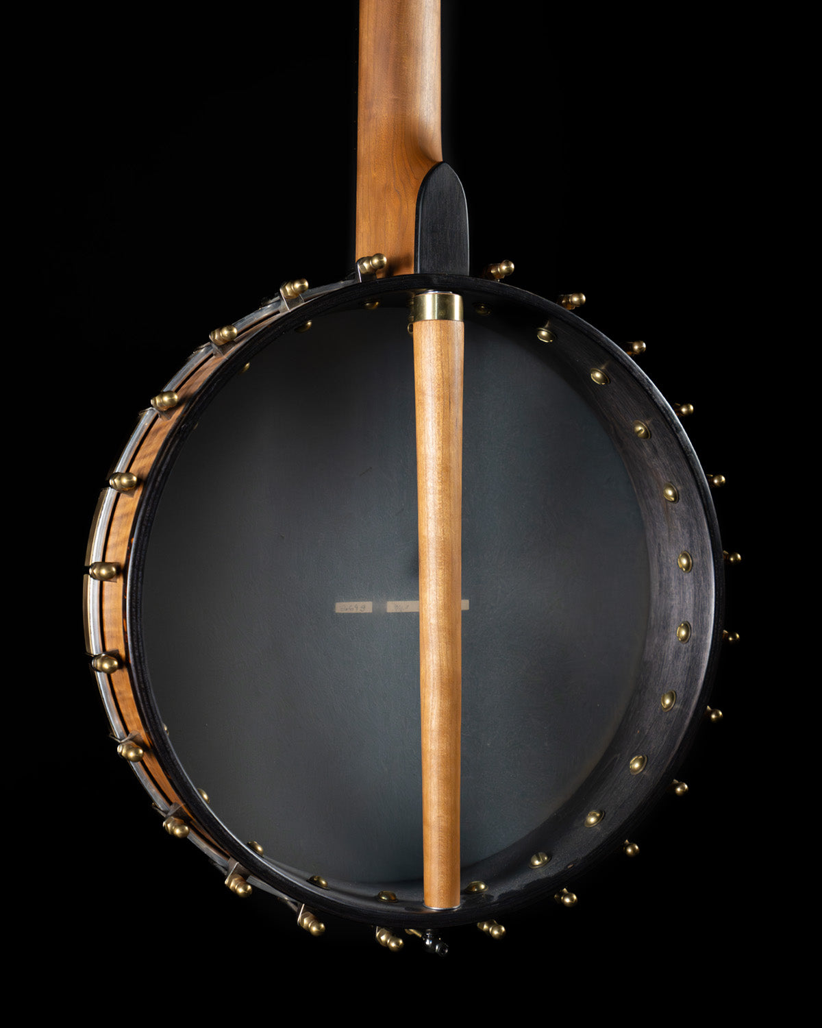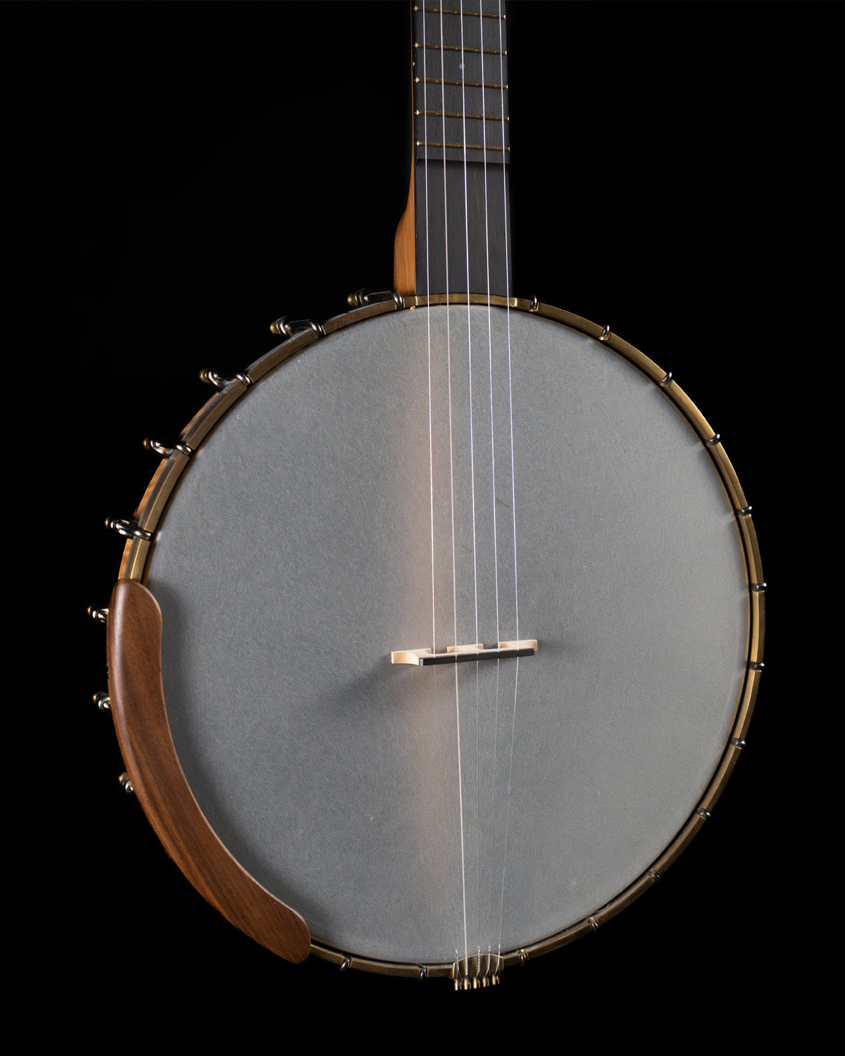 Laminated maple tone rim with walnut neck and flat ebony fingerboard. 25 5/8" scale length, 1 11/32" nut, 1 3/4" string spacing at the saddle. The neck has a smooth oil finish, sleek profile and a boat heel. The hardware is aged brass and the tuners have amber knobs. Price includes gig bag.